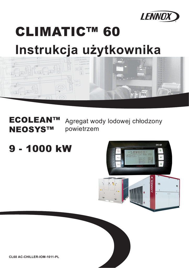 CLIMATIC™ 60 Instrukcja użytkownika ECOLEAN™ NEOSYS™ Agregat wody lodowej chłodzony powietrzem 9 - 1000 kW CL60 AC-CHILLER-IOM-1011-PL SPIS TREŚCI CLIMATIC™ 60 AGREGAT WODY LODOWEJ CHŁODZONY POWIETRZEM INSTRUKCJA STEROWNIKA Ref : CL60-AC CHILLER-IOM-1011-PL WPROWADZENIE Sterownik CLIMATIC™ 60 2 Zgodność 2 Ostrzeżenie 2 PRZEGLĄD 2 Sprężarka 3 Wentylator skraplacza 5 Wentylator z systemem SMART ACOUSTIC SYSTEM™ 7 Parownik 10 Przełączanie trybu grzanie/chłodzenie 14 Odszranianie wymiennika 16 Free Cooling 17 Elektroniczny zawór rozprężny 18 Nagrzewnica elektryczna 19 Korektor współczynnika mocy 20 Sterowanie pompą parownika 21 Sterowanie przepływem przez pompę parownika 22 Sterowanie pompą skraplacza 24 Sterowanie przepływem przez pompę skraplacza 25 Wolne wejścia/wyjścia 27 Sterowanie WŁĄCZANIEM/WYŁĄCZANIEM 30 Zegar czasu rzeczywistego 31 Programowanie stref 32 Tryb programowania 33 Programowanie włączenia z wyprzedzeniem 34 TRANSMISJA DANYCH Master / slave Panel DS60 35 37 Wyświetlacz DC60 Advanced lub wyświetlacz DS60 Lista DC60 39 BMS 65 Alarmy 67 44 Wszystkie informacje techniczne i technologiczne zawarte w tej instrukcji, łącznie z rysunkami i opisami technicznymi, stanowią własność firmy Lennox i nie mogą być wykorzystywane (z wyjątkiem obsługi tego produktu), kopiowane, wydawane lub udostępniane osobom trzecim bez uprzedniej pisemnej zgody firmy Lennox. CL60-AC CHILLER-IOM-1011-PL •1• WPROWADZENIE STEROWNIK CLIMATIC™ 60 Mikroprocesorowy sterownik nowej generacji, CLIMATIC™ 60 może być instalowany w ziębiarkach i pompach ciepła firmy Lennox. Jest rozwinięciem 20-letniej koncepcji swoich poprzedników CLIMATIC™ 1, CLIMATIC™ 2 i CLIMATIC™ 50. LENNOX wyszukał najlepszy sprzęt elektroniczny na rynku i opracował specjalne oprogramowanie dla ziębiarek i pomp ciepła, maksymalizując efektywność i parametry urządzeń marki LENNOX. ZGODNOŚĆ Niniejsza dokumentacja jest zgodna z programami następujących typów ziębiarek i pomp ciepła od wersji oprogramowania CH060 STD - Vers. 01.0 - Rev 00.1: • ECOLEAN™ • NEOSYS™. • • • UWAGA Wszelkie modyfikacje parametrów powinny być dokonywane przez kompetentnego technika z odpowiednią licencją. Przed rozruchem lub ponownym włączeniem urządzenia sterowanego przez CLIMATIC™ 60, należy bezwzględnie sprawdzić, czy sterownik CLIMATIC™ 60 jest adekwatny do urządzenia i jego opcji. W wypadku wystąpienia niewłaściwych parametrów, połączenia wejść / wyjść mogą być nieprawidłowe i mogą spowodować problemy w pracy urządzenia, a także jego uszkodzenie. Firma LENNOX nie ponosi odpowiedzialności za reklamacje ze względu na usterki urządzenia spowodowane niewłaściwą sekwencją parametrów lub ich modyfikacją dokonaną przez niekompetentnych techników. W takim wypadku gwarancja ulega unieważnieniu. PRZEGLĄD magistrala pLan magistrala Fieldbus magistrala BMS •2• CL60-AC CHILLER-IOM-1011-PL KOMPONENTY SPRĘŻARKA Funkcja CLIMATIC™ 60 zarządza pracą sprężarek zależnie od żądania temperatury wyjścia i włącza tyle sprężarek ile wynika z obliczenia do uzyskania nastawionej wartości temperatury. Opis CLIMATIC™ 60 umożliwia wyłączenie niektórych sprężarek w obiegu. Ta możliwość może być zrealizowana za pomocą styku bezpotencjałowego (patrz część „wolne wejścia/wyjścia”). Ustawienie (3421) Włączenie sprężarki w obiegu (przypadek 2 obiegi) NO 1 2 3 1, ., . 1 2 3 ., 2, . 1 2 3 1, 2, . 1 2 3 ., ., 3 1 2 3 1, ., 3 1 2 3 ., 2, 3 1 2 3 1, 2, 3 1 2 3 Sprężarki które mają pracować można zawczasu określić zależnie od programu, a ich ilość może być różna dla każdego trybu programowania (A, B, C, D, oraz BMS). 12h/24h 12h/24h Tryb D Tryb C C1: 1,2,3 C2: 1,2,3 9h C1: .,.,3 C2: .,.,3 Tryb A C1: 1,.,. C2: 1,.,. Tryb B C1: 1,2,. C2: 1,2,. 3h 6h 21h Tryb C C1: 1,2,3 C2: 1,2,3 Tryb D 15h Tryb B C1: .,.,3 C2: .,.,3 C1: 1,2,. C2: 1,2,. 18h Ponadto można określić priorytet obiegu (w urządzeniach z 2 obiegami) “Auto”: CLIMATIC™ 60 decyduje, który obieg ma być włączony jako pierwszy. Priorytet ulega odwróceniu gdy wszystkie sprężarki zostają wyłączone w celu optymalizacji godzin pracy obu obiegów. CL60-AC CHILLER-IOM-1011-PL •3• KOMPONENTY “Priorytet C1”: Priorytet jest ustawiony na obieg 1, co oznacza że obieg 1 włącza się jako pierwszy i wyłącza się jako ostatni. “Priorytet C2”: Priorytet jest ustawiony na obieg 2, co oznacza że obieg 2 włącza się jako pierwszy i wyłącza się jako ostatni. Sprężarka ma przypisane parametry czasu pracy, co ma zapobiec jej uszkodzeniu. • Minimalny czas włączenia sprężarki jest ustawiony na 1 minutę, • Minimalny czas wyłączenia sprężarki jest ustawiony na 1 minutę, • Minimalny czas między 2 włączeniami tej samej sprężarki jest ustawiony na 5 minut. Żądanie włączenia sprężarki Włączenie sprężarki Żądanie włączenia sprężarki Włączenie sprężarki Żądanie włączenia sprężarki Włączenie sprężarki Ustawienia Różne ustawienia konfiguracji sprężarek są dostępne w menu: •4• (3331): Włącza sprężarkę(ki) w obiegu 1 (3332): Włącza sprężarkę(ki) w obiegu 2 (3335): Priorytet rotacji obiegów. CL60-AC CHILLER-IOM-1011-PL KOMPONENTY WENTYLATOR SKRAPLACZA Funkcja CLIMATIC™ 60 jest używany do utrzymania wysokiego ciśnienia na maksymalnie stabilnym poziomie, aby zwiększyć wydajność urządzenia. Opis CLIMATIC™ 60 ma 2 różne sposoby sterowania wentylatorem, zależnie od typu urządzenia: ECOLEAN™ (bez falownika sterującego prędkością wentylatora) CLIMATIC™ 60 steruje 2 prędkościami (prędkość wysoka i niska). Wysoka prędkość Niska prędkość Zatrzymane zenia chłod Tr yb Wysokie ciśnienie (bar) Wysoka prędkość Niska prędkość Zatrzymane wania ogrze Tr yb Temperatura powietrza zewnętrznego (°C) NEOSYS™ urządzenie standardowe (wersja s
