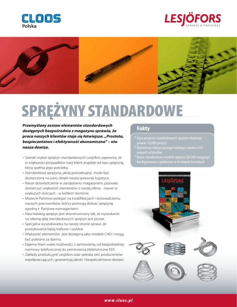SPRĘŻYNY STANDARDOWE Przemyślany zestaw elementów standardowych dostępnych bezpośrednio z magazynu sprawia, że praca naszych klientów staje się łatwiejsza. „Prostota, bezpieczeństwo i efektywność ekonomiczna” – oto nasza dewiza. • Szeroki wybór sprężyn standardowych Lesjöfors zapewnia, że w większości przypadków nasz klient znajdzie od razu sprężynę, która spełnia jego potrzeby. • Standardowa sprężyna, jakiej potrzebujesz może być dostarczona na jutro, dzięki naszej sprawnej logistyce. • Nasze doświadczenie w zarządzaniu magazynem, pozwala dostarczyć większość elementów z naszej oferty - nawet w większych ilościach - w krótkim terminie. • Możecie Państwo polegać na kwalifikacjach i doświadczeniu naszych pracowników, którzy pomogą dobrać sprężynę zgodną z Państwa wymaganiami. • Nasz katalog sprężyn jest skonstruowany tak, że wyszukanie na własną rękę standardowych sprężyn jest proste. • Specjalna wyszukiwarka na naszej stronie sprawi, że poszukiwania będą trafione i szybkie. • Większość elementów jest dostępna jako modele CAD i mogą być pobrane za darmo. • Dajemy Wam wiele możliwości z zamówienia, od bezpośredniej rozmowy telefonicznej do zamówienia elektroniczne EDI. • Zakłady produkcyjne Lesjöfors oraz szeroka sieć producentów współpracujących, gwarantują jakość i bezpieczeństwo dostaw. w w w.c lo o s.p l Fakty *Nasz program standardowych sprężyn obejmuje prawie 10,000 pozycji *Najnowsza edycja naszego katalogu zawiera 419 nowych artykułów *Nasze standardowe modele sprężyn 3D CAD mogą być konfigurowane i pobierane w 8 różnych formatach SPRĘŻYNY STANDARDOWE Zawartość Katalogu Sprężyn Sprężyny faliste – wielozwojowe sprężyny faliste są wykonane z płaskiego materiału sprężystego i doskonale nadają się do zastosowań, gdzie jest wymagany mały wymiar montażowy. Dzięki nim możliwe jest zmniejszenie wymiaru montażowego do 50% . Sprężyny naciskowe – znajdziecie Państwo duży wybór najbardziej popularnych elementów standardowych na rynku europejskim. Zawiera również sprężyny narzędziowe zgodne z ISO 10243. Sprężyny naciągowe – Szerokość asortymentu osiągamy dzięki unikalnemu standardowi wymiarowania zarówno dla standardowych sprężyn, jak także dla specjalnych zwojów. Większość elementów jest dostępna także ze stali nierdzewnej. Sprężyny skrętne – oferujemy zarówno pojedyncze jak i podwójne sprężyny skrętne, mogą one być zastosowane w większości aplikacji. Wszystkie części dostępne są także ze stali nierdzewnej. Sprężyny talerzowe - oferta jest oparta na Normie Europejskiej DIN 2093. Posiadamy również szeroką gamę sprężyn talerzowych ze stali nierdzewnej. Sprężyny o stałej sile i podkładki sprężynujące – szeroka gama sprężyn zegarowych i sprężyn o stałej sile uzupełniona przez dające duże możliwości końcówki i łożyska ślizgowe. Zawleczki, nakrętki sprężyste i klipsy – zawierają szeroki zakres najpopularniejszych elementów blokujących. Sprężyny gazowe - pełen zakres sprężyn ze skokiem aż do 500 mm. Wiele modeli dostępnych jest ze stali nierdzewnej. Nowością w ofercie standardowej są modele z redukcją siły i zintegrowanymi blokadami bezpieczeństwa . Najnowsze produkty to seria 12-4. Końcówki mocowania sprężyn gazowych – pierścienie, połączenia sworzniowe, kule przegubowe i klamry w różnych modelach. Większość z nich dostępna jest w stali nierdzewnej. Dystrybucja w Polsce: CLOOS Polska Sp. z o.o. | 58-100 Świdnica, ul. Stawki 5 Tel. +48 74/851-86-60 | [email protected] | www.cloos.pl w w w.c lo o s.p l