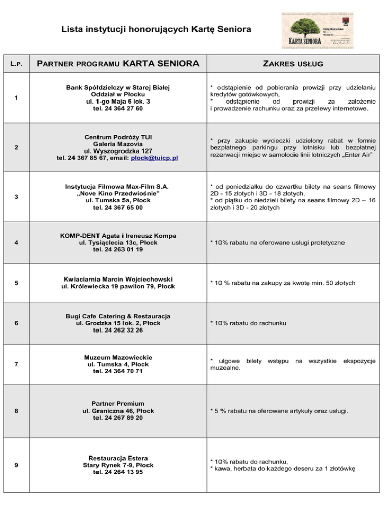 Lista instytucji honorujących Kartę Seniora KARTA SENIORA