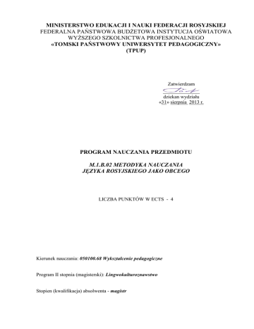 MINISTERSTWO EDUKACJI I NAUKI FEDERACJI ROSYJSKIEJ FEDERALNA PAŃSTWOWA BUDŻETOWA INSTYTUCJA OŚWIATOWA WYŻSZEGO SZKOLNICTWA PROFESJONALNEGO «TOMSKI PAŃSTWOWY UNIWERSYTET PEDAGOGICZNY» (TPUP) Zatwierdzam dziekan wydziału «31» sierpnia 2013 r. PROGRAM NAUCZANIA PRZEDMIOTU М.1.В.02 METODYKA NAUCZANIA JĘZYKA ROSYJSKIEGO JAKO OBCEGO LICZBA PUNKTÓW W ECTS - 4 Kierunek nauczania: 050100.68 Wykształcenie pedagogiczne Program II stopnia (magisterski): Lingwokulturoznawstwo Stopien (kwalifikacja) absolwenta - magistr 1. Cel nauczania. Celem programu jest przygotowanie przyszłych magistrów do dzialalnosci zawodowej w dziedzinie komunikacji miedzykulturowej oraz nauczaniu jezyka rosyjskiego w srodowisku obcojezycznym. Dany cel realizuje sie w zadaniach: generowanie wiedzy ogólnej o metodyce nauczania jezyka rosyjskiego jako obcego; krztałcenie systemowej wiedzy o podstawach nauczania jezyków obcych m.in. rosyjskiego; krztałcenie umiejętności wykorzystania tej wiedzy w dzilalnosci naukowo badawczej i metodycznej. 2. Miejsce przedmiotu w pogramie krztałcenia. Proces opanowania przedmiotu związany jest z przedmiotami cyklu ogólnonaukowego (Współczesne problemy nauki i oświaty, Metodologia i metody badań naukowych), cyklu profesjonalnego Informacjne technologii w działalności zawodowej, Język obcy zawodowy, Lingwokulturoznawstwo i komunikacja międzykulturowa, Teoria i praktyka przekladu tekstow roznych styli i gatunkow, Jezykoznawsto konfrontatywne) oraz praktykami i pracą naukowo badawczej. 3. Wymagania do poziomu krztałcenia: Kompetencja Zdolność do zebrania źródeł celem rozwiązania zadań zawodowych Zdolność do samokrztałcenia i wykorzystania w działalności zawodowej nowej wiedzy i umiejętności Zdolność do komunikacji zawodowej po rosyjsku oraz w języku obcym Zdolność do wykorzystania współczesnych technik diagnostyki i oceny jakości procesu krztałcenia Zdolność do badania i tworzenia potrzeb kulturowych róźnych grup ludności i podniesienia ich poziomu kulturalnego kod ОК-4 ОК-5 ОПК-1 ПК-2 ПК-17 Wyniki opanowania przedmiotu są następujące znać: wspolczesne techniki w szkolnictwie; konceptualne podstawowe tezy planowania procesu nauczania; praktyczne znaczenie badań naukowych, sposobów stosowania ich wyników w dydaktyce i szkolnictwie. umieć: stosować własną wiedzę teoretyczną w praktyce; dobierac materially dydaktyczne metody i techniki wedlug zadan szkolnictwa; planowac proces nauczania; oceniac poziom nauczania jezyka. posiadać: umiejętnościami wykorzystania technik informacyjnych. 4. Ogólna objętość przedmiotu – 4 punkty ECTS i rodzaj pracy szkoleniowej. Rodzaj procesu nauczania Zajęcia stacjonarne Wykłady Ćwiczenia Zajęcia interaktywne Praca samodzielna Rodzaj kontroli Rodzaj sprawdzianu kwalifikacynego według planu nauczania – egzamin Objętość Podział semestalny (według (według planu planu nauczania) nauczania) (godziny) (godziny) ogółem 2 3 48 24 24 12 12 36 12 24 24 12 12 69 30 39 Napisanie testu, referat, samokontrola, dyskusja 27 zaliczenie egzamin 5. Program nauczania. 5.1. Rozdzał programu. nr Nazwa rozdzału programu 1. Nauczanie jezyka rosyjskiego jako obcego (JRJO) w swiecie Komunikacja pedagogiczna w procesie nauczania JRJO Metody i techniki nauczania JRJO Lekcja JRJO Aspekty jezyka jako aspekty dydaktyki: fonetyka, leksyka, gramatyka Funkcjonowanie jezykowe jako aspekt dydaktyki Certyfikacja jezyka rosyjskiego jako obcego i kontrola znajomosci jezyka Razem godzin 2. 3 4. 5. 6. 7. Rodzaj pracy szkoleniowej według planu nauczania W tym Wykłady Ćwiczenia Samodzielne interaktywne 2 2 2 2 2 5 2 2 4 4 4 2 10 12 6 4 10 2 12 8 20 2 6 4 12 12 36 24/50% 69 5.2. Treść rozdzału programu. 1. Nauczanie jezyka rosyjskiego jako obcego (JRJO) w swiecie. Znaczenie języka rosyjskiego we wspolczesnym świecie. Założenia i cele nauczania języka rosyjskiego jako języka obcego. Podstawowe zasady nauki JRJO 2. Komunikacja pedagogiczna w procesie nauczania JRJO. Pedagogiczny model komunikacji w nauczaniu JRJO. Cel, środki i treśc nauczania. Nauczyciel, uczeń. Zawodowe wartości nauczyciela JPJO. 3. Metody i techniki nauczania JRJO. Techniki komunikatywne. Techniki intensywne. Technika dialogu kultur jako realizcja wielokulturowego paradigmatu wyksztalcenia filolgicznego. Techiki interaktywne w nauczaniu JRJO. 4. Lekcja JRJO. Rodzaje lekcji. Podstawowe elementy lekcji JPJO. Formy grześnosciowe i etykieta na zajeciach JRJO. 5. Aspekty jezyka jako aspekty dydaktyki: fonetyka, leksyka, gramatyka. Zintegrowane a aspektne nauczanie językam obcym. Fonetyka jako aspekt nauczania oraz wstep w nauce jezyka. Cwiczenia fonetyczne. Rodzaje ćwiczeń w nauczaniu fonetyki rosyjskiej. Leksyka jako aspekt nauczania. Funkcjonalne zróżnicowanie leksyki. Pojęcie leksykalnego minimum. Zasady doboru jednostek leksykalnych. Zasady semantyzacj wyrazu. Wizualizacjia naucznia słownictwa. Rodzaje ćwiczeń w nauczaniu leksyki języka rosyjskiego. Gramatyka jako aspekt nauczania. Cele nauczania gramatyki. Zasady doboru materiału gramatycznego. Zasady opisu materiału gramatycznego. Tempo wprowadzania materiału gramatycznego: objaśnienie - automatyzacja - tworzenie konkretnych umiejętności werbalnych. Rodzaje ćwiczeń w nauczaniu gramatyki. 6. Funkcjonowanie jezykowe jako aspekt dydaktyki. Funkcjonowanie jezykowe: zarys ogolny. Rozumienie tekstu jako funkcjonowanie jezykowe. Podstawa psychologiczna rozumienia tekstu. Cele nauczania i odmiany zadan. Mowa jako odmniana funkcjonowania jezykowego. Podstawy psychologiczne mowy. Cele nauczania mowie obcojezycznej. Odmiany mowy: monolog a dialog. Rodzaje cwiczen. Czytanie jako odmniana funkcjonowania jezykowego. Szybkosc czytania. Odmiany czytania. Rodzaje cwiczen. Pisanie jako odmniana funkcjonowania jezykowego. Szybkosc pisania. Nauczanie pisaniu. Rodzaje cwiczen. 7. Certyfikacja jezyka rosyjskiego jako obcego i kontrola znajomosci jezyka. Rodzaje sprawdzian