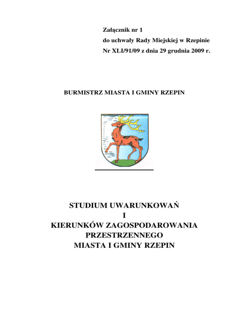 Załącznik nr 1 do uchwały Rady Miejskiej w Rzepinie Nr XLI/91/09 z dnia 29 grudnia 2009 r. BURMISTRZ MIASTA I GMINY RZEPIN STUDIUM UWARUNKOWAŃ I KIERUNKÓW ZAGOSPODAROWANIA PRZESTRZENNEGO MIASTA I GMINY RZEPIN STUDIUM UWARUNKOWAŃ I KIERUNKÓW ZAGOSPODAROWANIA PRZESTRZENNEGO MIASTA I GMINY RZEPIN Z UWZGLĘDNIENIEM ZMIANY STUDIUM UCHWAŁA NR XXXIX/47/2006 RADY MIEJSKIEJ W RZEPINIE Z DNIA 06 września 2006 r. 2 CZĘŚĆ OGÓLNA - CHARAKTERYSTYKA OPRACOWANIA. ............................................................................ 6 I. 1. WPROWADZENIE. ................................................................................................................................. 6 1.1. Studium, a system regulacji dotyczących rozwoju i zagospodarowania przestrzennego ...................... 6 1.2. Cele studium. .......................................................................................................................................... 7 1.3. Zakres przestrzenny i rzeczowy. ............................................................................................................. 8 1.4. Zespół autorski. .................................................................................................................................... 10 2. II. DANE, WIELKOŚCI CHARAKTERYZUJĄCE OBSZAR OPRACOWANIA ( STAN 1998 R. I 2008 R.). ................................ 10 LOKALNE UWARUNKOWANIA ROZWOJU I ZAGOSPODAROWANIA PRZESTRZENNEGO. .......................... 11 1. LUDNOŚĆ. ......................................................................................................................................... 11 1.1. Sytuacja demograficzna. ...................................................................................................................... 12 1.2. Rozmieszczenie ludności. ...................................................................................................................... 15 1.3. Możliwości i prognozy rozwoju. ........................................................................................................... 16 2. FUNKCJE GMINY. PRZEZNACZENIE I UŻYTKOWANIE TERENÓW. ....................................................................... 17 2.1. Funkcje gospodarcze. ........................................................................................................................... 17 2.2. Funkcje obszarów gminy. ..................................................................................................................... 17 2.3 Przeznaczenie i użytkowanie terenów. ................................................................................................. 17 3. SYSTEMY OBSŁUGI TECHNICZNEJ. ............................................................................................................ 18 3.1. Transport drogowy. .............................................................................................................................. 19 3.2 System zaopatrzenia w wodę. .............................................................................................................. 19 3.3 Odprowadzenie i neutralizacja ścieków. .............................................................................................. 20 3.4 Gromadzenie i neutralizacja odpadów stałych: ................................................................................... 21 3.5 System zaopatrzenia w energię cieplną. .............................................................................................. 22 4. ŚRODOWISKO PRZYRODNICZE. ............................................................................................................... 22 4.1. Wartości i walory środowiska przyrodniczego. .................................................................................... 23 4.2. Stan i funkcjonowanie środowiska. ...................................................................................................... 23 5. ŚRODOWISKO KULTUROWE. .................................................................................................................. 24 5.1 Stan i jakość rolniczej przestrzeni produkcyjnej. .................................................................................. 24 5.2. Obszary leśne........................................................................................................................................ 25 5.3. Osadnictwo........................................................................................................................................... 25 5.4 Walory i wartości zabudowy i zagospodarowania. .............................................................................. 26 5.5 Krajobraz przyrodniczo - kulturowy. ..................................................................................................... 26 6. PRAWA WŁASNOŚCI GRUNTÓW. ............................................................................................................. 27 7. JAKOŚĆ ŻYCIA MIESZKAŃCÓW. ............................................................................................................... 27 III. 7.1 Źródła utrzymania i dochody ludności.................................................................................................. 28 7.2. Warunki zamieszkania. ........................................................................................................................ 28 ELEMENTY PONADLOKALNE ZAGOSPODAROWANIA, STAN ISTNIEJĄCY I PRZESĄDZONY. ....................... 29 3 1. OCHRONA PRZYRODY. .......................................................................................................................... 29 1.1 Obszary ochrony przyrody. ................................................................................................................... 29 1.2 Obiekty ochrony przyrody................................................................................................................