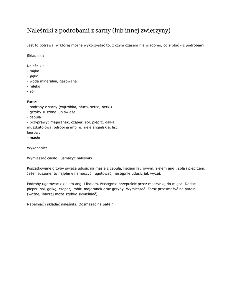 Naleśniki z podrobami z sarny (lub innej zwierzyny) Jest to potrawa, w której można wykorzystać to, z czym czasem nie wiadomo, co zrobić - z podrobami. Składniki: Naleśniki: - mąka - jajko - woda mineralna, gazowana - mleko - sól Farsz: - podroby z sarny (wątróbka, płuca, serce, nerki) - grzyby suszone lub świeże - cebula - przyprawy: majeranek, cząber, sól, pieprz, gałka muszkatołowa, odrobina imbiru, ziele angielskie, liść laurowy - masło Wykonanie: Wymieszać ciasto i usmażyć naleśniki. Poszatkowane grzyby świeże udusić na maśle z cebulą, liściem laurowym, zielem ang., solą i pieprzem. Jeżeli suszone, to najpierw namoczyć i ugotować, następnie udusić jak wyżej. Podroby ugotować z zielem ang. i liściem. Następnie przepuścić przez maszynkę do mięsa. Dodać pieprz, sól, gałkę, cząber, imbir, majeranek oraz grzyby. Wymieszać. Farsz przesmażyć na patelni (ważne, inaczej może szybko skwaśnieć). Napełniać i składać naleśniki. Odsmażać na patelni.