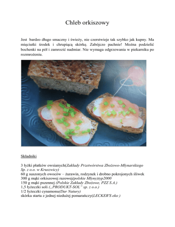 Chleb orkiszowy Jest bardzo długo smaczny i świeży, nie czerstwieje tak szybko jak kupny. Ma mięciutki środek i chrupiącą skórkę. Zabójczo pachnie! Można podzielić bochenki na pół i zamrozić nadmiar. Nie wymaga odgrzewania w piekarniku po rozmrożeniu. Składniki 3 łyżki płatków owsianych(Zakłady Przetwórstwa Zbożowo-Młynarskiego Sp. z o.o. w Kruszwicy) 60 g suszonych owoców – żurawin, rodzynek i drobno pokrojonych śliwek 300 g mąki orkiszowej razowej(polskie Młyny)typ2000 150 g mąki pszennej (Polskie Zakłady Zbożowe, PZZ S.A.) 1,5 łyżeczki soli („PRODUKT-SOL” sp. z o.o.) 1/2 łyżeczki cynamonu(Dar Natury) skórka starta z jednej niedużej pomarańczy(LECKER'S eko ) 50 g miękkiego masła(POLMLEK Sp.z o.o.) 1 łyżeczka suszonych drożdży (albo 2 łyżeczki świeżych, z których należy zrobić rozczyn) Dr. Oetker Polska Sp.z o.o. ) Przygotowanie: Płatki owsiane i suszone owoce zalać 375 ml wrzątku. Zostawić na 15 minut, aż trochę przestygną. W misce przesiać mąkę, sól, cynamon i skórkę z pomarańczy. Dodać masło, drożdże i namoczone żurawiny i płatki, wraz z wodą, w której się moczyły. Dokładnie wymieszać. Zostawić na 10 minut. Po tym czasie wyrabiać ciasto przez 10 sekund, a następnie dać mu odpocząć przez 10 minut i powtórzyć tę czynność jeszcze dwukrotnie. Przykryć ściereczką i odstawić do wyrośnięcia na 30 minut. Keksówkę nasmarować tłuszczem i przełożyć do niej ciasto. Przykryć ściereczką i odstawić do wyrośnięcia na godzinę. Przed pieczeniem wierzch chleba posmarować wodą i zrobić podłużne nacięcie. Wstawić do piekarnika nagrzanego do 220 C (bez termoobiegu). Piec około 50 minut. Upieczony chleb lekko przestudzić w formie, wyjąć z keksówki o wymiarach 8 cm x 19 cm i ostudzić na kratce.