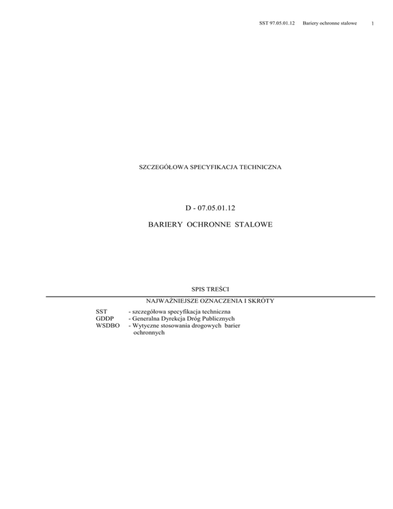 SST 97.05.01.12 SZCZEGÓŁOWA SPECYFIKACJA TECHNICZNA D - 07.05.01.12 BARIERY OCHRONNE STALOWE SPIS TREŚCI NAJWAŻNIEJSZE OZNACZENIA I SKRÓTY SST GDDP WSDBO - szczegółowa specyfikacja techniczna - Generalna Dyrekcja Dróg Publicznych - Wytyczne stosowania drogowych barier ochronnych Bariery ochronne stalowe 1 SST 97.05.01.12 Bariery ochronne stalowe 2 1. WSTĘP 1.1. Przedmiot SST Przedmiotem niniejszej Szczegółowej specyfikacji technicznej (SST) są wymagania dotyczące wykonania i odbioru robót związanych z wbudowaniem barier ochronnych stalowych. 1.2. Zakres stosowania SST Szczegółowa specyfikacja techniczna (SST) stanowi podstawę dokumentów przetargowych i kontraktowych przy zlecaniu i realizacji robót na drogach krajowych, wojewódzkich ,powiatowych i gminnych. 1.3. Zakres robót objętych SST Ustalenia zawarte w niniejszej specyfikacji dotyczą zasad prowadzenia robót związanych z wykonywaniem barier ochronnych, stalowych typy SP-09 z prowadnicą z profilowanej taśmy stalowej typu A i B na słupkach stalowych planowanych do wbudowania przy Przebudowie dróg powiatowych nr. 1634 R w km 0+000 do 13+557 oraz 1635 R w km 0+000 – do 1+609. 1.4. Określenia podstawowe Dla celów niniejszej SST przyjmuje się następujące określenia podstawowe: 1.4.1. Bariera ochronna - urządzenie bezpieczeństwa ruchu drogowego, stosowane w celu fizycznego zapobieżenia zjechaniu pojazdu z drogi w miejscach, gdzie to jest niebezpieczne, wyjechaniu pojazdu poza koronę drogi, przejechaniu pojazdu na jezdnię przeznaczoną dla przeciwnego kierunku ruchu lub niedopuszczenia do powstania kolizji pojazdu z obiektami lub przeszkodami stałymi znajdującymi się w pobliżu jezdni. 1.4.2. Bariera ochronna stalowa - bariera ochronna, której podstawowym elementem jest prowadnica wykonana z profilowanej taśmy stalowej (zał. 11.1). 1.4.3. Bariera skrajna - bariera ochronna umieszczona przy krawędzi jezdni lub korony drogi, przeciwdziałająca niebezpiecznym następstwom zjechania z drogi lub je ograniczająca (zał. 11.1 i 11.2). 1.4.4. Bariera przekładkowa - bariera, w której prowadnica zamocowana jest do słupków za pośrednictwem przekładek zapewniających odstęp między prowadnicą a słupkiem od 100 mm do 180 mm (zał. 11.2 b). 1.4.5. Bariera bezprzekładkowa - bariera, w której prowadnica zamocowana jest bezpośrednio do słupków (zał. 11.2 a). 1.4.6. Prowadnica bariery - podstawowy element bariery wykonany z profilowanej taśmy stalowej, mający za zadanie umożliwienie płynnego wzdłużnego przemieszczenia pojazdu w czasie kolizji, w czasie którego prowadnica powinna odkształcać się stopniowo i w sposób plastyczny. Odróżnia się dwa typy profilowanej taśmy stalowej: typ A i typ B, różniące się kształtem przetłoczeń . 1.4.7. Przekładka - element bariery, wykonany zwykle z rury (okrągłej, prostokątnej) lub kształtownika stalowego (np. z ceownika, dwuteownika) o szerokości od 100 do 140 mm, umieszczony pomiędzy prowadnicą a słupkiem, którego zadaniem jest nadanie barierze korzystniejszych właściwości kolizyjnych (niż w barierze bezprzekładkowej), powodujących, że prowadnica bariery w pierwszej fazie odkształcania lub przemieszczania słupków nie jest odginana do dołu, lecz unoszona ku górze. 1.4.8. Pozostałe określenia podstawowe są zgodne z obowiązującymi, odpowiednimi polskimi normami i z definicjami podanymi w OST D-M-00.00.00 „Wymagania ogólne” pkt 1.4. 1.5. Ogólne wymagania dotyczące robót Ogólne wymagania dotyczące robót podano w SST D-00.00.00 „Wymagania ogólne” pkt 1.5. SST 97.05.01.12 Bariery ochronne stalowe 2. MATERIAŁY 3 2.1. Ogólne wymagania dotyczące materiałów Ogólne wymagania dotyczące materiałów, ich pozyskiwania i składowania, podano w SST D00.00.00 „Wymagania ogólne” pkt 2. 2.2. Materiały do wykonania barier ochronnych stalowych Dopuszcza się do stosowania tylko takie konstrukcje drogowych barier ochronnych, na które wydano aprobatę techniczną. Elementy do wykonania barier ochronnych stalowych określone są poprzez typ bariery podany w dokumentacji projektowej, nawiązujący do ustaleń producenta barier. Do elementów tych należą: prowadnica,słupki, pas profilowy, wysięgniki, przekładki, wsporniki, śruby, podkładki, światła odblaskowe, łączniki ukośne, obejmy słupka. Ponadto przy ustawianiu barier ochronnych stalowych mogą wystąpić materiały do wykonania elementów betonowych jak fundamenty, kotwy wraz z ich deskowaniem. 2.3. Elementy do wykonania barier ochronnych stalowych 2.3.1. Prowadnica Typ prowadnicy z profilowanej taśmy stalowej powinien być określony w dokumentacji projektowej, przy czym: typ A powinien odpowiadać ustaleniom producenta barier, typ B powinien odpowiadać PN-H-93461-15 [18] 2.3.2. Słupki Słupki bariery powinny być zgodne z ustaleniami dokumentacji projektowej. 2.3.3. Inne elementy bariery Jeśli dokumentacja projektowa przewiduje stosowanie pasa profilowego, to powinien on odpowiadać PN-H-93461-28 [20] w zakresie wymiarów, masy, wielkości statycznych i odchyłek wymiarów przekroju poprzecznego. Dostawa większych wymiarowo elementów bariery może być dokonana luzem lub w wiązkach. Śruby, podkładki i drobniejsze elementy łącznikowe mogą być dostarczone w pudełkach tekturowych, pojemnikach blaszanych lub paletach, w zależności od wielkości i masy wyrobów. Elementy bariery powinny być przechowywane w pomieszczeniach suchych, z dala od materiałów działających korodująco i w warunkach zabezpieczających przed uszkodzeniem. 2.3.4. Zabezpieczenie metalowych elementów bariery przed korozją Sposób zabezpieczenia antykorozyjnego elementów bariery ustala producent w taki sposób, aby zapewnić trwałość powłoki antykorozyjnej przez okres 5 do 10 lat w warunkach normalnych, do co najmniej 3 do 5 lat w środowisku o zwiększonej korozyjności. W przypadku braku wystarczających danych minimalna grubość powłoki cynk