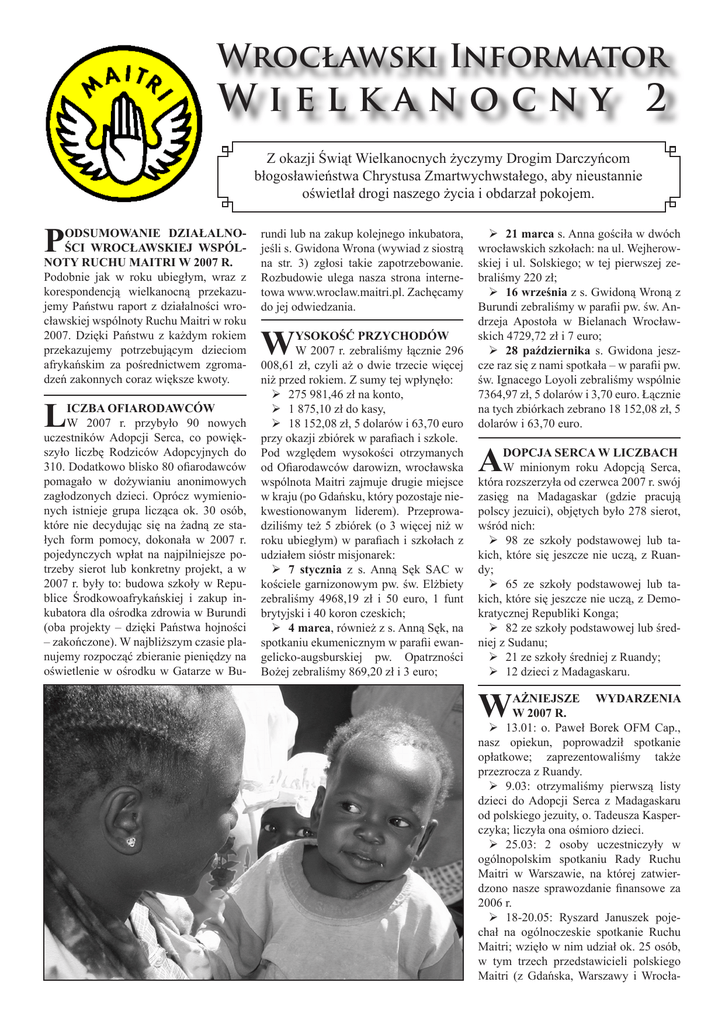Wrocławski Informator Wielkanocny 2 Z okazji Świąt Wielkanocnych życzymy Drogim Darczyńcom błogosławieństwa Chrystusa Zmartwychwstałego, aby nieustannie oświetlał drogi naszego życia i obdarzał pokojem. P ODSUMOWANIE DZIAŁALNOŚCI WROCŁAWSKIEJ WSPÓLNOTY RUCHU MAITRI W 2007 R. Podobnie jak w roku ubiegłym, wraz z korespondencją wielkanocną przekazujemy Państwu raport z działalności wrocławskiej wspólnoty Ruchu Maitri w roku 2007. Dzięki Państwu z każdym rokiem przekazujemy potrzebującym dzieciom afrykańskim za pośrednictwem zgromadzeń zakonnych coraz większe kwoty. L ICZBA OFIARODAWCÓW W 2007 r. przybyło 90 nowych uczestników Adopcji Serca, co powiększyło liczbę Rodziców Adopcyjnych do 310. Dodatkowo blisko 80 ofiarodawców pomagało w dożywianiu anonimowych zagłodzonych dzieci. Oprócz wymienionych istnieje grupa licząca ok. 30 osób, które nie decydując się na żadną ze stałych form pomocy, dokonała w 2007 r. pojedynczych wpłat na najpilniejsze potrzeby sierot lub konkretny projekt, a w 2007 r. były to: budowa szkoły w Republice Środkowoafrykańskiej i zakup inkubatora dla ośrodka zdrowia w Burundi (oba projekty – dzięki Państwa hojności – zakończone). W najbliższym czasie planujemy rozpocząć zbieranie pieniędzy na oświetlenie w ośrodku w Gatarze w Bu- rundi lub na zakup kolejnego inkubatora, jeśli s. Gwidona Wrona (wywiad z siostrą na str. 3) zgłosi takie zapotrzebowanie. Rozbudowie ulega nasza strona internetowa www.wroclaw.maitri.pl. Zachęcamy do jej odwiedzania. W YSOKOŚĆ PRZYCHODÓW W 2007 r. zebraliśmy łącznie 296 008,61 zł, czyli aż o dwie trzecie więcej niż przed rokiem. Z sumy tej wpłynęło: ¾¾ 275 981,46 zł na konto, ¾¾ 1 875,10 zł do kasy, ¾¾ 18 152,08 zł, 5 dolarów i 63,70 euro przy okazji zbiórek w parafiach i szkole. Pod względem wysokości otrzymanych od Ofiarodawców darowizn, wrocławska wspólnota Maitri zajmuje drugie miejsce w kraju (po Gdańsku, który pozostaje niekwestionowanym liderem). Przeprowadziliśmy też 5 zbiórek (o 3 więcej niż w roku ubiegłym) w parafiach i szkołach z udziałem sióstr misjonarek: ¾¾ 7 stycznia z s. Anną Sęk SAC w kościele garnizonowym pw. św. Elżbiety zebraliśmy 4968,19 zł i 50 euro, 1 funt brytyjski i 40 koron czeskich; ¾¾ 4 marca, również z s. Anną Sęk, na spotkaniu ekumenicznym w parafii ewangelicko-augsburskiej pw. Opatrzności Bożej zebraliśmy 869,20 zł i 3 euro; ¾¾ 21 marca s. Anna gościła w dwóch wrocławskich szkołach: na ul. Wejherowskiej i ul. Solskiego; w tej pierwszej zebraliśmy 220 zł; ¾¾ 16 września z s. Gwidoną Wroną z Burundi zebraliśmy w parafii pw. św. Andrzeja Apostoła w Bielanach Wrocławskich 4729,72 zł i 7 euro; ¾¾ 28 października s. Gwidona jeszcze raz się z nami spotkała – w parafii pw. św. Ignacego Loyoli zebraliśmy wspólnie 7364,97 zł, 5 dolarów i 3,70 euro. Łącznie na tych zbiórkach zebrano 18 152,08 zł, 5 dolarów i 63,70 euro. A DOPCJA SERCA W LICZBACH W minionym roku Adopcją Serca, która rozszerzyła od czerwca 2007 r. swój zasięg na Madagaskar (gdzie pracują polscy jezuici), objętych było 278 sierot, wśród nich: ¾¾ 98 ze szkoły podstawowej lub takich, które się jeszcze nie uczą, z Ruandy; ¾¾ 65 ze szkoły podstawowej lub takich, które się jeszcze nie uczą, z Demokratycznej Republiki Konga; ¾¾ 82 ze szkoły podstawowej lub średniej z Sudanu; ¾¾ 21 ze szkoły średniej z Ruandy; ¾¾ 12 dzieci z Madagaskaru. W AŻNIEJSZE WYDARZENIA W 2007 R. ¾¾ 13.01: o. Paweł Borek OFM Cap., nasz opiekun, poprowadził spotkanie opłatkowe; zaprezentowaliśmy także przezrocza z Ruandy. ¾¾ 9.03: otrzymaliśmy pierwszą listy dzieci do Adopcji Serca z Madagaskaru od polskiego jezuity, o. Tadeusza Kasperczyka; liczyła ona ośmioro dzieci. ¾¾ 25.03: 2 osoby uczestniczyły w ogólnopolskim spotkaniu Rady Ruchu Maitri w Warszawie, na której zatwierdzono nasze sprawozdanie finansowe za 2006 r. ¾¾ 18-20.05: Ryszard Januszek pojechał na ogólnoczeskie spotkanie Ruchu Maitri; wzięło w nim udział ok. 25 osób, w tym trzech przedstawicieli polskiego Maitri (z Gdańska, Warszawy i Wrocła- wia); wyemitowano film nakręcony w Ruandzie, choć spotkanie miało charakter przede wszystkim modlitewno-kontemplacyjny; jeden z księży wygłosił konferencję na temat Bożego miłosierdzia. ¾¾ 1.06: z okazji Dnia Dziecka, TVN wyemitował w programie „Uwaga” relację o Adopcji Serca, prowadzonej przez Ruch Maitri; po programie nastąpił wyraźny wzrost zainteresowania pomocą afrykańskim dzieciom, przejawiający się w częstszych odwiedzinach strony internetowej oraz wielu deklaracjach Adopcji Serca (zapis audycji: http://uwaga.onet. pl/1415521,archiwum.html). ¾¾ 1.06: rozpoczęliśmy wspieranie dzieci z Madagaskaru. ¾¾ 8.06: w „Gazecie Pomorskiej” ukazał się artykuł o Ruchu Maitri (http://pomorska. pl/apps/pbcs.dll/article?AID=/20070608/ REPORTAZ/70607021). ¾¾ 15.06: w tygodniku „Przegląd” ukazał się artykuł o Adopcji Serca, prowadzonej przez Ruch Maitri (http:// w w w. p r z e g l a d - t y g o d n i k . p l / i n d e x . php?site=reportaz&name=193). ¾¾ 28.06: do wrocławskiego ośrodka Maitri zawitali niezwykli goście: ks. Maurice Yaya Sarde Mana i s. Paulina Megier, na co dzień pracujący w Kamerunie; opowiadali oni o sytuacji społecznogospodarczej tego kraju, o problemach kameruńskiego Kościoła; ks. Maurice nauczył nas refrenu pieśni religijnej w języku swojego ludu Daba; o godz. 19.00 odprawił w parafii św. Augustyna Mszę świętą. ¾¾ 18-22.07: 3 osoby z wrocławskiego Maitri uczestniczyły w ogólnopolskich rekolekcjach Ruchu Maitri, stanowiąc – obok Raciborza – najsilniejszą grupę; mogli w nich uczestniczyć także ofiarodawcy i sympatycy Ruchu; spotkanie odbyło się w klasztorze benedyktynów w Lubiniu koło Kościana; gościem specjalnym był ks. Maurice; po niedzielnych Mszach św. w kościele p