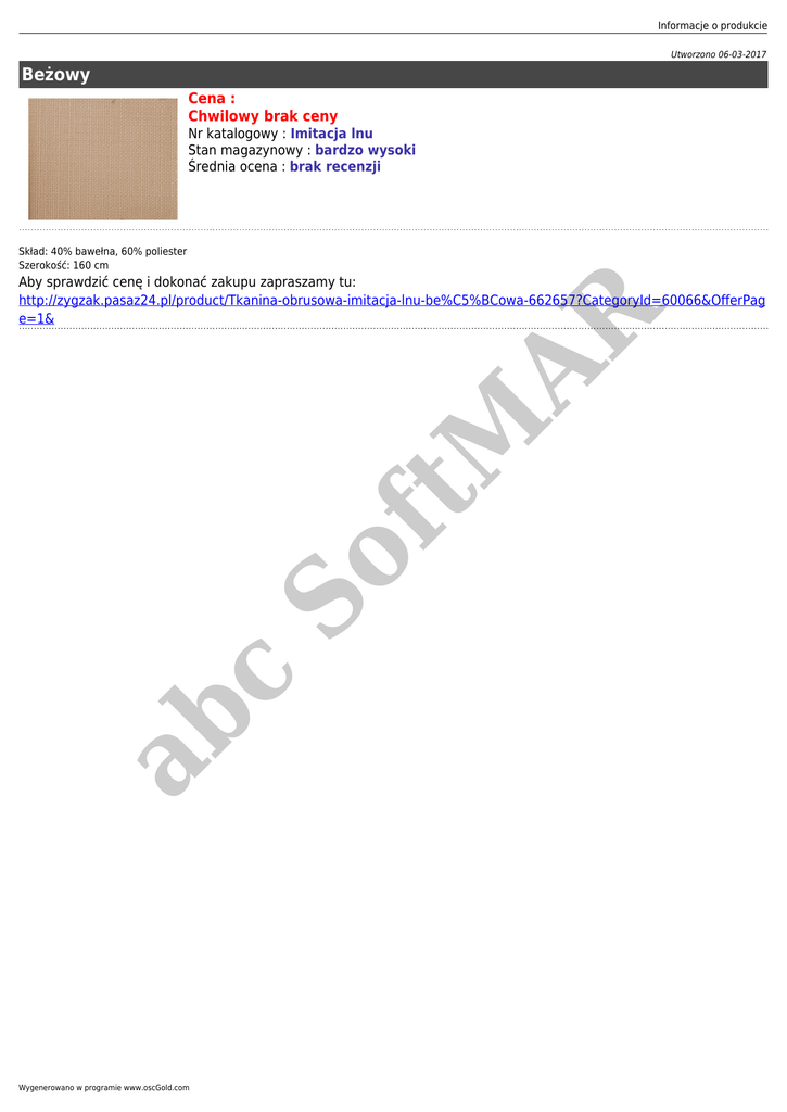 Informacje o produkcie Utworzono 06-03-2017 Beżowy Cena : Chwilowy brak ceny Nr katalogowy : Imitacja lnu Stan magazynowy : bardzo wysoki Średnia ocena : brak recenzji Skład: 40% bawełna, 60% poliester Szerokość: 160 cm ab c So ft M AR Aby sprawdzić cenę i dokonać zakupu zapraszamy tu: http://zygzak.pasaz24.pl/product/Tkanina-obrusowa-imitacja-lnu-be%C5%BCowa-662657?CategoryId=60066&OfferPag e=1& Wygenerowano w programie www.oscGold.com