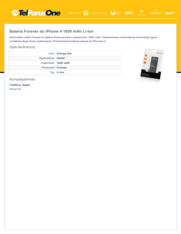 Bateria Forever do iPhone 4 1650 mAh Li-Ion Akumulator marki Forever to bateria litowo-jonowa o pojemności 1650 mAh. Zastosowanie nowoczesnej technologii ogniw umożliwia długi okres użytkowania. Prezentowana bateria pasuje do iPhone'a 4. Opis techniczny Linia Energy line Opakowanie blister Pojemność 1650 mAh Producent Forever Typ Li-Ion Kompatybilność Telefony: Apple iPhone 4S
