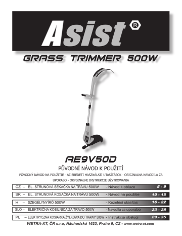 PŮVODNÍ NÁVOD K POUŽITÍ PÔVODNÝ NÁVOD NA POUŽITIE - Az eredeti használati utasítások - Originalna navodila za uporabo - Oryginalne instrukcje użytkowania 5-9 CZ – EL. STRUNOVÁ SEKAČKA NA TRÁVU 500W - Návod k obluze SK – EL. STRUNOVÁ KOSAČKA NA TRÁVU 500W - Návod na použitie 10 - 15 – SZEGÉLYNYÍRÓ 500W - Kezelési utasítas 16 - 22 - Navodila za uporabo 23 - 28 H SLO – ELEKTRIČNA KOSILNICA ZA TRAVO 500W PL –ELEKTRYCZNA KOSIARKA ŻYŁKOWA DO TRAWY 500W - Instrukcja obsługi 29 - 35 WETRA-XT, ČR s.r.o, Náchodská 1623, Praha 9, CZ - www.wetra-xt.com SYMBOLS Nářadí je určeno pouze pro domácí - hobby použití. Náradie je určené iba pre domáce - hobby použitie. A szerszám célja az otthoni - hobby használatra. Orodje je namenjeno izključno za domačo ali hobi uporabo. Narzędzie jest przeznaczone jedynie do użycia domowego lub hobbystycznego. Před prvním použitím si pročtěte návod k obsluze Pred prvím použitím si prečítajte návod na použitie Beüzemelés előtt olvassa el a használati utasítást Pred prvo uporabo preberite navodila za uporabo! Przed pierwszym użyciem uważnie przeczytaj instrukcję obsługi. Nebezpečí Nebezpečie Figyelmeztetés Nevarnost! Niebezpieczeństwo Používejte ochranu sluchu Používajte ochranu sluchu Használjon fülvédőt Uporabljajte zaščitna sredstva za varovanje sluha! Używaj środków ochrony słuchu Používejte ochranu zraku Používajte ochranu zraku Használjon védőszemüveget Uporabljajte zaščitna sredstva za varovanje vida! Używaj środków ochrony wzroku Používejte Ochrannou dýchací roušku Používajte ochrannú dýchaciu rúžku Használjon porvédő maszkot Uporabljajte zaščitno dihalno masko! Używaj maski ochronnej Vyjměte zástrčku ze zásuvky okamžitě, pokud je kabel poškozen Vyberte zástrčku zo zásuvky okamžite, ak je kábel poškodený Vegye ki a hálózati csatlakozót azonnal, ha a kábel sérült Napravo takoj, če je kabel poškodovan, ga iztaknite Odłączyć urządzenie od razu, jeśli kabel jest uszkodzony Nebezpečí úrazu elektrickým proudem Nebezpečie úrazu elektrickým prúdom Áramütésveszély Nevarnost električnega udara Ryzyko porażenia prądem cd cd cd cd cd Dvojitá izolace Dvojitá izolácia Dupla szigetelés Dvojna izolacija. Podwójna izolacja Používejte ochranné rukavice Používajte ochranné rukavice Viseljen védőkesztyűt Nositi zaščitne rokavice Nosić rękawice ochronne Používejte ochrannou obuv Používajte ochrannú obuv Viseljen védő lábbeli Nepracujte v dešti Nevystavujte dažďu Nem működik az esőben Ne izpostavljajte dežju Nositi zaščitna obutev Nosić obuwie ochronne Nie wystawiać na deszcz Originální návod CZ AE9V50D - EL. STRUNOVÁ SEKAČKA NA TRÁVU 500W OBECNÉ BEZPEČNOSTNÍ POKYNY Tyto bezpečnostní pokyny si pečlivě prostudujte, zapamatujte a uschovejte UPOZORNĚNÍ: Při používání elektrických strojů a elektrického nářadí je nutno respektovat a dodržovat následující bezpečnostní pokyny z důvodů ochrany před úrazem elektrickým proudem, zraněním osob a nebezpečím vzniku požáru. Výrazem „elektrické nářadí“ je ve všech níže uvedených pokynech myšleno jak elektrické nářadí napájené ze sítě (napájecím kabelem), tak nářadí napájené z baterií (bez napájecího kabelu). Uschovejte všechna varovaní a pokyny pro příští použití. došlo k jeho řádnému připojení a používání. Použití těchto zařízení může omezit nebezpečí vznikající prachem. h)Pevně upevněte obrobek. Použijte truhlářskou svěrku nebo svěrák pro upevnění dílu, který budete obrábět. i) Nepoužívejte elektrické nářadí pokud jste pod vlivem alkoholu, drog, léků nebo jiných omamných či návykových látek. j) Toto zařízení není určené pro použití osobami (včetně dětí) se sníženými fyzickými, smyslovými nebo mentálními schopnostmi nebo s nedostatkem zkušeností a znalostí, pokud nejsou pod dozorem nebo nedostali pokyny s ohledem na použiti zařízení od osoby zodpovědné za jejich bezpečnost. Děti musí být pod dozorem, aby jste se ujistili, že si nehrají se zařízením. 4. Používání elektrického nářadí a jeho údržba a) El. nářadí vždy odpojte z el. sítě v případě jakéhokoliv problému při práci, před každým čistěním nebo údržbou, při každém přesunu a po ukončení práce! Nikdy nepracujte s el. nářadím, pokud je jakýmkoliv způsobem poškozené. b)Pokud začne nářadí vydávat abnormální zvuk nebo zápach, okamžitě ukončete práci. c)Elektrické nářadí nepřetěžujte. Elektrické nářadí bude pracovat lépe a bezpečněji, pokud jej budete provozovat v otáčkách, pro které bylo navrženo. Používejte správné nářadí, které je určeno pro danou činnost. Správné nářadí bude lépe a bezpečněji vykonávat práci, pro kterou bylo zkonstruováno. d)Nepoužívejte elektrické nářadí, které nelze bezpečně zapnout a vypnout ovládacím spínačem. Používání takového nářadí je nebezpečné. Vadné spínače musí být opraveny certifikovaným servisem. e)Odpojte nářadí od zdroje elektrické energie předtím, než začnete provádět jeho seřizování, výměnu příslušenství nebo údržbu. Toto opatření zamezí nebezpečí náhodného spuštění. f) Nepoužívané elektrické nářadí ukliďte a uschovejte tak, aby bylo mimo dosah dětí a nepovolaných osob. Elektrické nářadí v rukou nezkušených uživatelů může být nebezpečné. Elektrické nářadí skladujte na suchém a bezpečném místě. g)Udržujte elektrické nářadí v dobrém stavu. Pravidelně kontrolujte seřízení pohybujících se částí a jejich pohyblivost. Kontrolujte zda nedošlo k poškození ochranných krytů nebo jiných částí, které mohou ohrozit bezpečnou funkci elektrického nářadí. Je-li nářadí poškozeno, př