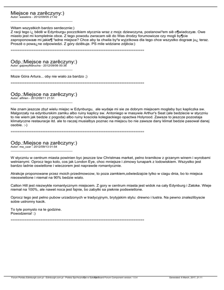 Miejsce na zarêczyny:) Autor: wasekns - 2012/09/05 21:42 _____________________________________ Witam wszystkich bardzo serdecznie:) Z racji tego i¿ bêdê w Edynburgu pocz±tkiem stycznia wraz z moj± dziewczyna, postanowi³em siê o¶wiadczyæ. Owe miasto jest mi kompletnie obce. Z tego powodu zwracam siê do Was drodzy forumowicze czy mogli by¶cie zaproponowaæ mi jakie¶ ³adne miejsce? Chce aby ta chwila by³a wyj±tkowa dla tego chce wszystko dograæ ju¿ teraz. Proszê o powa¿ne odpowiedzi. Z góry dziêkuje. PS mile widziane zdjêcia:) ============================================================================ Odp.:Miejsce na zarêczyny:) Autor: gajowyMarucha - 2012/09/06 00:36 _____________________________________ Moze Góra Artura... oby nie wialo za bardzo ;) ============================================================================ Odp.:Miejsce na zarêczyny:) Autor: alfirien - 2012/09/11 21:51 _____________________________________ Nie znam jeszcze zbyt wielu miejsc w Edynburgu, ale wydaje mi sie ze dobrym miejscem moglaby byc kapliczka sw. Malgorzaty na edynburskim zamku albo ruiny kaplicy sw. Antoniego w masywie Arthur's Seat (ale bedziecie w styczniu to nie wiem jak bedzie z pogoda) albo ruiny kosciola kolegiackiego opactwa Holyrood. Zawsze to jeszcze pozostaja klimatyczne restauracje itd. ale to raczej musialbys poznac na miejscu bo nie zawsze dany klimat bedzie pasowal danej osobie. :-) ============================================================================ Odp.:Miejsce na zarêczyny:) Autor: ma_czar - 2012/09/13 01:54 _____________________________________ W styczniu w centrum miasta powinien byc jeszcze tzw Christmas market, pelno kramikow z grzanym winem i wyrobami welnianymi. Oprocz tego kolo, cos jak London Eye, choc mniejsze i zimowy lunapark z lodowiskiem. Wszystko jest bardzo ladnie oswietlone i wieczorem jest naprawde romantycznie. Atrakcje proponowane przez moich przedmowcow, to poza zamkiem,odwiedzajcie tylko w ciagu dnia, bo to miejsca nieoswietlone i niemal na 90% bedzie wialo. Calton Hill jest niezwykle romantycznym miejscem. Z gory w centrum miasta jest widok na caly Edynburg i Zatoke. Wieje niemal na 100%, ale nawet noca jest fajnie, bo zabytki sa pieknie podswietlone. Oprocz tego jest pelno pubow urzadzonych w tradycyjnym, brytyjskim stylu: drewno i lustra. Na pewno znalezlibyscie sobie ustronny kacik. To tyle pomyslo na te godzine. Powodzenia! :) ============================================================================ Forum Portalu Edinburgh.com.pl - Edinburgh.com.pl - Polska Spo³eczno¶æ w Szkocji FireBoard Forum Component version: 1.0.4 Generated: 6 March, 2017, 21:11