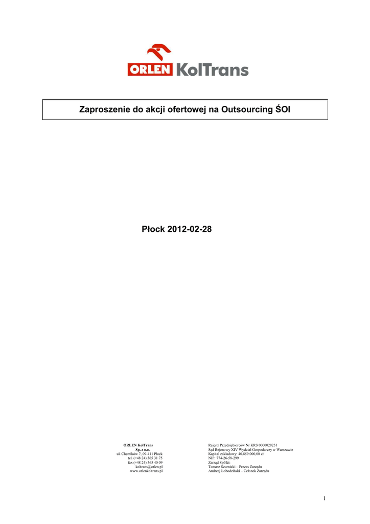 Zaproszenie do akcji ofertowej na Outsourcing ŚOI Płock 2012-02-28 ORLEN KolTrans Sp. z o.o. ul. Chemików 7, 09-411 Płock tel. (+48 24) 365 31 75 fax (+48 24) 365 40 09 [email protected] www.orlenkoltrans.pl Rejestr Przedsiębiorców Nr KRS 0000028251 Sąd Rejonowy XIV Wydział Gospodarczy w Warszawie Kapitał zakładowy: 40.859.000,00 zł NIP: 774-26-58-299 Zarząd Spółki: Tomasz Szurnicki – Prezes Zarządu Andrzej Łobodziński – Członek Zarządu 1 I. Zamawiający: ORLEN KolTrans Sp. z o.o. 09-411 Płock, ul. Chemików 7 NIP: 774-26-58-299 http://www.orlenkoltrans.pl, e-mail: [email protected] tel. 24 365 39 11, fax. 24 365 40 09 II. Informacje o postępowaniu ofertowym : 1. Postępowanie ofertowe prowadzone jest według wewnętrznych procedur obowiązujących w ORLEN KolTrans Sp. z o.o. III. Przedmiot outsourcingu: I. OdzieŜ Ubranie antyelektrostatyczne (marynarka do pasa + spodnie z szelkami, kolor czerwono-szary z logo firmy ORLEN KolTrans) spełniające normy PN-EN 340, PN-EN 1149-5 2. Kurtka ocieplana długa, antyelektrostatyczna, kolor czerwonoszary z logo firmy ORLEN KolTrans spełniająca normy PN-EN 340, PN-EN 1149-5 3. Spodnie ocieplane z szelkami, antyelektrostatyczne, kolor czerwonoszary z logo firmy ORLEN KolTrans spełniające normy PN-EN 340, PNEN 1149-5 4. Koszula robocza (100% bawełna, produkcji polskiej) 5. Kurtka antyelektrostatyczna wodoochronna (model 101/A) PROS 6. Spodnie antyelektrostatyczne wodoochronne (model 001/A) PROS 7. Bielizna (podkoszulka + kalesony) 100% bawełna 8. Ręcznik kąpielowy 140x70 (100% bawełna) II. Obuwie Szacunkowa ilość 1. 250 kpl. 60 szt. 40 szt. 1. 2. 3. 4. 5. 6. 7. 8. 9. 300 szt. 70 szt. 40 szt. 200 kpl 280 szt. Szacunkowa ilość 220 par 3 pary 113 par 60 par 100 par 10 par 40 par 10 par 10 par 1. 2. 3. 4. 5. 6. Szacunkowa ilość 3 000 par 300 par 30 par 1 100 par 1 000 par 1 200 par Trzewik model 884 (producent PPO Strzelce Opolskie) Obuwie model 441 (producent PPO Strzelce Opolskie) Sztyblety zawodowe /ART.51/ (producent Gardia) Trzewik model 1413 (producent PPO Strzelce Opolskie) Obuwie ocieplane model 0154 (producent PPO Strzelce Opolskie) Obuwie ocieplane model 031 (producent PPO Strzelce Opolskie) Obuwie Model 1002 (producent PPO Strzelce Opolskie) Półbuty męskie model 0381 (producent PPO Strzelce Opolskie) Półbuty damskie antystatyczne model 260 (producent PPO Strzelce Opolskie) III. Rękawice Rękawice skórzane wzmocnione GOBI RED Rękawice ocieplane GOBI RED WINTER Rękawice spawalnicze model śUBR Rękawice nitrylowe VENITEX NI 175 rozmiary 10,11 Rękawice ochronne D5-347 Rękawice Aeroskin 140 Marigold 2 IV. Artykuły BHP 1. 2. 3. 4. 5. Szacunkowa ilość Kamizelka ostrzegawcza z logo firmy antyelektrostatyczna wg norm PNEN 471, PN-EN 340, PN-EN 1149-5 Kask ochronny (hełm + więźba) V- Gard antyelektrostatyczny Okulary p. odpryskowe Szelki bezpieczeństwa PROTEKT Typ P-30 Urządzenie samohamowne PROTEKT Typ ROLEX 300 szt. 40 szt. 100 szt. 50 szt. 50 szt. IV. Ogólne warunki realizacji outsourcingu: 1. Przedmiotem zapytania jest powtarzająca się okresowo dostawa do siedziby Zamawiającego Środków Ochrony Indywidualnej, obsługa szafek serwisowych i pranie odzieŜy roboczej. 2. Dostawa przedmiotowego asortymentu będzie następowała sukcesywnie w miarę pojawiających się potrzeb i zgodnie z czasookresami zawartymi w Tabeli Norm i Przydziałów ORLEN KolTrans. 3. Przedmiot dostawy musi być fabrycznie nowy, wolny od wad technicznych i prawnych. 4. OdzieŜ winna być trwale oznakowana imieniem i nazwiskiem pracownika. 5. Oferent zobowiązany jest prowadzić elektroniczne kartoteki pracowników. 6. Oferta musi być kompletna, ORLEN KolTrans Sp. z o.o. nie dopuszcza moŜliwości złoŜenia oferty wariantowej np. na jeden z czterech asortymentów. 7. Ilość obsługiwanych pracowników około 330 osób. V. Kryteria wyboru ofert. 1. Cena jednostkowa ŚOI netto wraz z dostawą do Płocka i serwisem. 2. Cennik netto prania i naprawy odzieŜy wraz z dostawą i serwisem. 3. Cena zakupu/wynajmu szafek serwisowych wraz z dostawą. 4. Jakość w przypadku I asortymentu (tkanina, gramatura, walory estetyczne). 5. Referencje dotyczące wykonywanej usługi outsourcingu w branŜy BHP. VI. Treść składanych ofert i wymagane dokumenty. Warunkiem przyjęcia oferty jest przedłoŜenie wraz z ofertą niŜej wymienionych danych i dokumentów: 1. Nazwa firmy, adres, telefon kontaktowy, fax. 2. Nazwiska osób reprezentujących firmę. Odpis z Krajowego Rejestru Sądowego, w przypadku spółek Prawa Handlowego, lub zaświadczenie o wpisie do ewidencji działalności gospodarczej w przypadku osób fizycznych. 3. Decyzja w sprawie nadania nr Identyfikacji Podatkowej NIP. VII. Oferta winna zawierać. Część techniczną: 1. Dokumenty potwierdzające wiarygodność oferenta wskazane w pkt. VI. 2. Wskazanie osoby do kontaktu sprawującej nadzór nad ofertą. 3. Termin waŜności oferty (12 miesięcy). 4. Termin rozpoczęcia współpracy (od 01.05.2012r.) 5. Oświadczenie oferentów – załącznik nr 1. 6. Deklaracje zgodności na prezentowany I asortyment. 7. Pełny opis asortymentu I. odzieŜ (gramatura, itp.) 3 8. Referencje dotyczące wykonywanej usługi outsourcingu w branŜy BHP. Część cenową: 1. Cena jednostkowa ŚOI netto wraz z dostawą do Płocka i serwisem. 2. Cennik netto prania i naprawy odzieŜy wraz z dostawą i serwisem. 3. Cena zakupu/wynajmu szafek serwisowych wraz z dostawą. 4. Deklaracja niezmienności cen w trakcie trwania umowy tj. w okresie 12 miesięcy z moŜliwością przedłuŜenia o kolejne czasookresy. 5. Sposób rozliczenia – z uwzględnieniem 30 dniowego terminu płatności faktury licząc od dnia otrzymania faktury. Przed przysłaniem oferty, naleŜy zaprezentować asortyment I. odzieŜ w siedzibie ORLEN KolTrans w Biurze Zakupów. Pytania dodatkowe dotyczące zakresu ogłoszonej akcji ofertowej prosimy przesyłać na adres email: [email protected]. Odpowiedź będzie przekazywana t