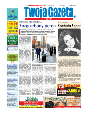 BEZPŁATNA PRASA LOKALNA Nr 2 (54) luty 2012 r. Nakład 11 000 egz. REKLAMA SKLA LEKKOATLETYCZNA POTĘGA W KURORCIE strony 8-9 Przebudowa stacji trwa i trwa... REKLAMA SOPOT-TA XI SOPOT Nie żyje Irena Jarocka Rozgrzebany peron Kochała Sopot Meblowanie Placu Przyjaciół Sopotu Zakończył się kolejny etap konkursu na opracowanie koncepcji przestrzennoarchitektonicznej elementów zagospodarowania Placu Przyjaciół w Sopocie. s. 4 Głosujmy na Gutka! Zbigniew „Gutek” Gutkowski, ambasador sopockiego żeglarstwa 2012, nominowany został do prestiżowej nagrody miesięcznika „National Geographic Traveler”. s. 6 Z życia „szarpidrutów” W czasach, gdy rock & roll był na cenzurowanym, imprezy na których grywano taką muzykę żurnaliści przyrównywali do rykowiska, a artystów uprawiających ten gatunek muzyki nazywano szarpidrutami. s. 7 REKLAMA Odeszła otoczona miłością rodziny, przyjaciół i fanów Fot. Michał Szymajda REKLAMA Remont peronu dla pociągów krajowych w Sopocie rozpoczął się latem ubiegłego roku. Kolej przepraszała za utrudnienia i prosiła pasażerów o cierpliwość. Pomyli się jednak ten, który pomyśli, że z uwagi na niedogodności, jakie niesie za sobą inwestycja, remont zostanie przyspieszony. – Często korzystam z SKM-ki i za każdym razem około godziny 15. widzę tłumy ludzi oczekujących na pociągi dalekobieżne na sąsiednim, rozgrzebanym peronie – mówi sopocianka Anna Jaros. – Nie ma tam wiaty, są stłoczeni na niewielkiej przestrzeni, bo połowa miejsca oczekiwania podróżnych jest zagrodzona. Ale robotników, którzy pracowaliby przy budowie, aby skrócić męki pasażerów, jakoś nie widać za często – dodaje. Sprawdziliśmy na własne oczy, co dzieje się po południu przy budowanym tylko z pozoru obiekcie. Oczekujący na pociąg do Białegostoku, który odjeżdża z Sopotu o godzinie 15.10, tłoczą się niemiłosiernie na wąskim skrawku peronu, który na dodatek jest śliski i nieodśnieżony, jest więc także niebezpiecznie. Temperatura powietrza to pięć stopni poniżej zera, a z megafonów pada komunikat o opóźnieniu pociągu o następne 20 minut. Część pasażerów opuszcza peron i chroni się w kurtynie przejścia podziemnego. Miejsc nie starcza jednak dla wszystkich, a sam budynek dworca jest za bardzo oddalony od peronów, by móc się w nim ogrzać. Większość podróżnych spędza więc 20 kolejnych minut na mrozie i bez możliwości osłonięcia się przed padającym śniegiem, bo wiata została zdemontowana jeszcze w zeszłym roku. – Remont peronów związany jest z modernizacją danego od- Fot. archiwum autora Budowlańcy wykonujący prace na zlecenie kolei nie spieszą się specjalnie z remontem peronu dalekobieżnego na stacji w Sopocie. Pozbawieni wiaty pasażerowie muszą tłoczyć się na niewielkiej przestrzeni, wystawieni na śnieg i podmuchy wiatru. Część peronu jest zamknięta, więc podróżni muszą tłoczyć się na niewielkim jego skrawku cinka szlaku, taka modernizacja to nie tylko wykonanie remontu torowiska, ale wszystkiego, co się znajduje pod nim, czyli przepustów, przejść dla pieszych, mostów itp. – wyjaśnia Maciej Dutkiewicz, rzecznik prasowy Centrum Realizacji Inwestycji PKP Polskie Linie Kolejowe. – Dlatego też, jeśli czasami nie widać pracowników na peronach, nie oznacza to, że przy modernizacji nic się nie dzieje – objaśnia sposób pracy ekip budowlanych rzecznik. Takie podejście do sprawy nie jest jednak korzystne dla pasażerów, ponieważ muszą oni cierpieć tak długo, jak długo budowany jest cały odcinek szlaku. Nie podoba się to także kolejowym analitykom. – Na zachodzie rozumie się, że w przypadku remontów warto myśleć najpierw o pasażerach, nawet jeśli generuje to większe koszty – twierdzi Piotr Rachwalski z Instytutu Rozwoju i Promocji Kolei. – Przekłada się to jednak na opinie klientów o kolei jako całości. W Polsce taki tok myślenia, jak widzimy na przykładzie remontu sopockiego peronu, to wciąż pieśń przyszłości – uważa. Męczarnie pasażerów będą więc trwały dalej. Na stacji Sopot obecnie remontowana i zamknięta krawędź peronowa ma być gotowa do końca marca 2012 roku, potem robotnicy zabiorą się za tą, której podróżni używają obecnie. Cały peron ma być gotowy do końca tego roku. Na pocieszenie dodajmy, że do tego czasu powstanie tu także stylizowana, nawiązująca do sopockiej architektury wiata, oraz nowoczesny wizualny system informacji pasażerskiej. Czekajmy więc cierpliwie... Michał Szymajda REKLAMA Sobotę, 21 stycznia 2012 roku, będę pamiętał do końca życia. W samo południe telefon z Polskiego Radia w Gdańsku z informacją o śmierci Ireny Jarockiej i zaproszenie do studia na wspomnienia o tej wielkiej damie polskiej piosenki. Miałem ten zaszczyt być jej impresariem i współpracownikiem w drugiej połowie lat siedemdziesiątych w okresie kiedy powstała BART – Bałtycka Agencja Artystyczna (1974) pod wodzą św. pamięci dyrektora i animatora kultury Andrzeja Cybulskiego. Byłem wtedy szefem reklamy BART-u, a Irena właśnie rozstała się ze swoim mężem i impresariem Marianem Zacharewiczem. Stając się impresariem takiej gwiazdy, uświadomiłem sobie, że otworzyły się przede mną drzwi do wszystkich decydentów kultury, mediów, wytwórni płytowych. Zawdzięczam Irenie wszystko to, co później osiągnąłem, pracując wiele lat w krajowym przemyśle rozrywkowym. Praca z nią to była przyjemność i zdobycie zawodu, który oficjalnie nie funkcjonował. Irena te moje prywatne „studia” opłacała z własnej kieszeni. Była osobą niezwykłą pod każdym względem. Miała miliony wielbicieli, była ikoną polskiej piosenki. Dokończenie na stronie 3 REKLAMA 2 Druga Druga strona strona www.twojagazeta.pl luty 2012 r. Z Lorą Szafran, wokalistką jazzową, rozmawia Jerzy Uklejewski Sentymentalna wyprawa w przeszłość – Współpracowała Pani