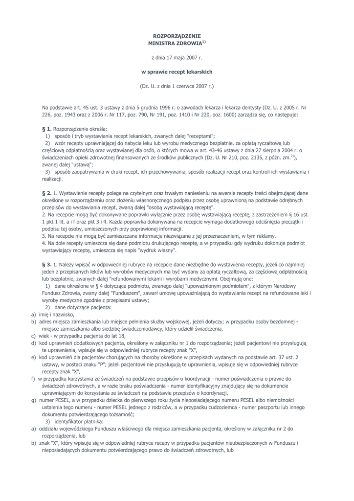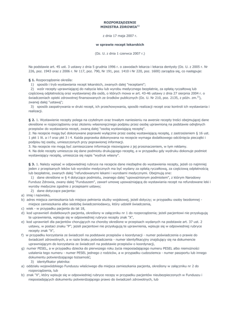 ROZPORZĄDZENIE MINISTRA ZDROWIA1) z dnia 17 maja 2007 r. w sprawie recept lekarskich (Dz. U. z dnia 1 czerwca 2007 r.) Na podstawie art. 45 ust. 3 ustawy z dnia 5 grudnia 1996 r. o zawodach lekarza i lekarza dentysty (Dz. U. z 2005 r. Nr 226, poz. 1943 oraz z 2006 r. Nr 117, poz. 790, Nr 191, poz. 1410 i Nr 220, poz. 1600) zarządza się, co następuje: § 1. Rozporządzenie określa: 1) sposób i tryb wystawiania recept lekarskich, zwanych dalej "receptami"; 2) wzór recepty uprawniającej do nabycia leku lub wyrobu medycznego bezpłatnie, za opłatą ryczałtową lub częściową odpłatnością oraz wystawianej dla osób, o których mowa w art. 43-46 ustawy z dnia 27 sierpnia 2004 r. o świadczeniach opieki zdrowotnej finansowanych ze środków publicznych (Dz. U. Nr 210, poz. 2135, z późn. zm.2)), zwanej dalej "ustawą"; 3) sposób zaopatrywania w druki recept, ich przechowywania, sposób realizacji recept oraz kontroli ich wystawiania i realizacji. § 2. 1. Wystawienie recepty polega na czytelnym oraz trwałym naniesieniu na awersie recepty treści obejmującej dane określone w rozporządzeniu oraz złoŜeniu własnoręcznego podpisu przez osobę uprawnioną na podstawie odrębnych przepisów do wystawiania recept, zwaną dalej "osobą wystawiającą receptę". 2. Na recepcie mogą być dokonywane poprawki wyłącznie przez osobę wystawiającą receptę, z zastrzeŜeniem § 16 ust. 1 pkt 1 lit. a i f oraz pkt 3 i 4. KaŜda poprawka dokonywana na recepcie wymaga dodatkowego odciśnięcia pieczątki i podpisu tej osoby, umieszczonych przy poprawionej informacji. 3. Na recepcie nie mogą być zamieszczane informacje niezwiązane z jej przeznaczeniem, w tym reklamy. 4. Na dole recepty umieszcza się dane podmiotu drukującego receptę, a w przypadku gdy wydruku dokonuje podmiot wystawiający receptę, umieszcza się napis "wydruk własny". a) b) c) d) e) f) g) a) b) § 3. 1. NaleŜy wpisać w odpowiedniej rubryce na recepcie dane niezbędne do wystawienia recepty, jeŜeli co najmniej jeden z przepisanych leków lub wyrobów medycznych ma być wydany za opłatą ryczałtową, za częściową odpłatnością lub bezpłatnie, zwanych dalej "refundowanymi lekami i wyrobami medycznymi. Obejmują one: 1) dane określone w § 4 dotyczące podmiotu, zwanego dalej "upowaŜnionym podmiotem", z którym Narodowy Fundusz Zdrowia, zwany dalej "Funduszem", zawarł umowę upowaŜniającą do wystawiania recept na refundowane leki i wyroby medyczne zgodnie z przepisami ustawy; 2) dane dotyczące pacjenta: imię i nazwisko, adres miejsca zamieszkania lub miejsce pełnienia słuŜby wojskowej, jeŜeli dotyczy; w przypadku osoby bezdomnej miejsce zamieszkania albo siedzibę świadczeniodawcy, który udzielił świadczenia, wiek - w przypadku pacjenta do lat 18, kod uprawnień dodatkowych pacjenta, określony w załączniku nr 1 do rozporządzenia; jeŜeli pacjentowi nie przysługują te uprawnienia, wpisuje się w odpowiedniej rubryce recepty znak "X", kod uprawnień dla pacjentów chorujących na choroby określone w przepisach wydanych na podstawie art. 37 ust. 2 ustawy, w postaci znaku "P"; jeŜeli pacjentowi nie przysługują te uprawnienia, wpisuje się w odpowiedniej rubryce recepty znak "X", w przypadku korzystania ze świadczeń na podstawie przepisów o koordynacji - numer poświadczenia o prawie do świadczeń zdrowotnych, a w razie braku poświadczenia - numer identyfikacyjny znajdujący się na dokumencie uprawniającym do korzystania ze świadczeń na podstawie przepisów o koordynacji, numer PESEL, a w przypadku dziecka do pierwszego roku Ŝycia nieposiadającego numeru PESEL albo niemoŜności ustalenia tego numeru - numer PESEL jednego z rodziców, a w przypadku cudzoziemca - numer paszportu lub innego dokumentu potwierdzającego toŜsamość; 3) identyfikator płatnika: oddziału wojewódzkiego Funduszu właściwego dla miejsca zamieszkania pacjenta, określony w załączniku nr 2 do rozporządzenia, lub znak "X", który wpisuje się w odpowiedniej rubryce recepy w przypadku pacjentów nieubezpieczonych w Funduszu i nieposiadających dokumentu potwierdzającego prawo do świadczeń zdrowotnych, lub c) symbol państwa, w którym znajduje się instytucja właściwa dla osoby korzystającej ze świadczeń na podstawie przepisów o koordynacji, określony w załączniku nr 3 do rozporządzenia; 4) dane dotyczące przepisanych leków lub wyrobów medycznych określone w § 6; 5) datę wystawienia recepty; 6) datę realizacji recepty, w przypadkach, o których mowa w § 8 ust. 3; jeŜeli nie dotyczy, wpisuje się w odpowiedniej rubryce recepty znak "X"; 7) dane dotyczące osoby wystawiającej receptę, w tym co najmniej: a) imię i nazwisko, b) numer prawa wykonywania zawodu lekarza określony w odrębnych przepisach. 2. Dane, o których mowa w ust. 1, mogą być dodatkowo przedstawione na recepcie techniką słuŜącą do ich automatycznego odczytu, a w szczególności w postaci jedno- lub dwuwymiarowych kodów kreskowych. 3. JeŜeli osoba wystawiająca receptę wystawia ją dla siebie albo dla małŜonka, zstępnych lub wstępnych w linii prostej oraz dla własnego rodzeństwa, w części recepty przeznaczonej na wpisanie danych pacjenta wpisuje dodatkowo adnotację: "pro auctore" lub "pro familia". Na recepcie wystawianej z adnotacją "pro auctore" dane dotyczące pacjenta, o których mowa w ust. 1 pkt 2, nie muszą zawierać elementów, które są umieszczone na pieczątce lekarskiej. 4. Na recepcie, o której mowa w ust. 1, umieszcza się dodatkowo: 1) numer recepty nadawany przez Fundusz w przypadku, o którym mowa w § 9 ust. 2, którego sposób budowy określa załącznik nr 4 do rozporządzenia; 2) numer potwierdzający identyfikację pacjenta nadawany przez Fundusz w przypadku, o którym mowa w § 9 ust. 5, którego sposób budowy określa załącznik nr 4 do rozporządzenia. 5. Dane, o których mowa w ust. 4, przedstawia się dodatkowo techniką słuŜącą do ich automatycznego 