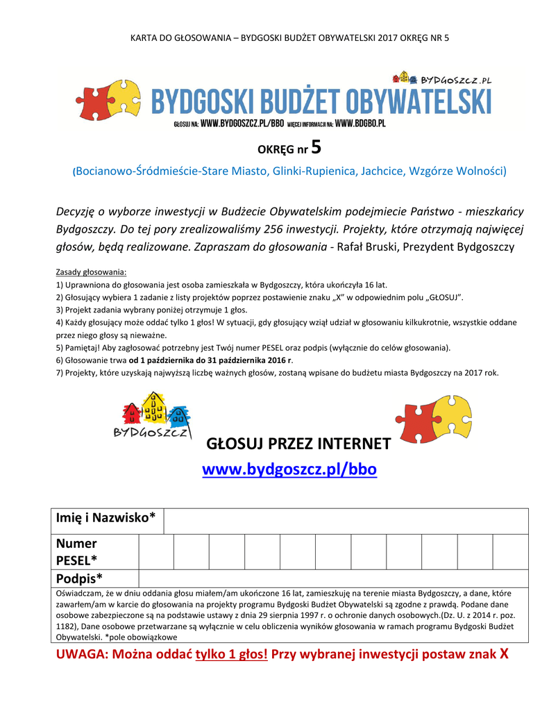 KARTA DO GŁOSOWANIA – BYDGOSKI BUDŻET OBYWATELSKI 2017 OKRĘG NR 5 OKRĘG nr 5 (Bocianowo-Śródmieście-Stare Miasto, Glinki-Rupienica, Jachcice, Wzgórze Wolności) Decyzję o wyborze inwestycji w Budżecie Obywatelskim podejmiecie Państwo - mieszkańcy Bydgoszczy. Do tej pory zrealizowaliśmy 256 inwestycji. Projekty, które otrzymają najwięcej głosów, będą realizowane. Zapraszam do głosowania - Rafał Bruski, Prezydent Bydgoszczy Zasady głosowania: 1) Uprawniona do głosowania jest osoba zamieszkała w Bydgoszczy, która ukończyła 16 lat. 2) Głosujący wybiera 1 zadanie z listy projektów poprzez postawienie znaku „X” w odpowiednim polu „GŁOSUJ”. 3) Projekt zadania wybrany poniżej otrzymuje 1 głos. 4) Każdy głosujący może oddać tylko 1 głos! W sytuacji, gdy głosujący wziął udział w głosowaniu kilkukrotnie, wszystkie oddane przez niego głosy są nieważne. 5) Pamiętaj! Aby zagłosować potrzebny jest Twój numer PESEL oraz podpis (wyłącznie do celów głosowania). 6) Głosowanie trwa od 1 października do 31 października 2016 r. 7) Projekty, które uzyskają najwyższą liczbę ważnych głosów, zostaną wpisane do budżetu miasta Bydgoszczy na 2017 rok. GŁOSUJ PRZEZ INTERNET www.bydgoszcz.pl/bbo Imię i Nazwisko* Numer PESEL* Podpis* Oświadczam, że w dniu oddania głosu miałem/am ukończone 16 lat, zamieszkuję na terenie miasta Bydgoszczy, a dane, które zawarłem/am w karcie do głosowania na projekty programu Bydgoski Budżet Obywatelski są zgodne z prawdą. Podane dane osobowe zabezpieczone są na podstawie ustawy z dnia 29 sierpnia 1997 r. o ochronie danych osobowych.(Dz. U. z 2014 r. poz. 1182), Dane osobowe przetwarzane są wyłącznie w celu obliczenia wyników głosowania w ramach programu Bydgoski Budżet Obywatelski. *pole obowiązkowe UWAGA: Można oddać tylko 1 głos! Przy wybranej inwestycji postaw znak X BOCIANOWO-ŚRÓDMIEŚCIE-STARE MIASTO Nr Projekt Lokalizacja Koszt 5OK/0004 Stare Miasto, Śródmieście - ulice jednokierunkowe. Dworcowa od ul. Matejki do ul. Gdańskiej. 50000 200000 pozytywna Teren zielony przed budynkiem Pałacu Młodzieży, ul. Jagiellońska 27. 170000 pozytywna Ul. Czartoryskiego, ul. św. Trójcy, Wyspa Młyńska. 150000 pozytywna Boisko SP 37, ul. Gdańska 122. 15000 pozytywna 5OK/0035 Kontraruch rowerowy, czyli legalnie "pod prąd" w centrum Bydgoszczy. Dworcowa dla pieszych. Koniec z chuligańskim parkowaniem samochodów na deptaku. Tablica multimedialna, zasilana panelami solarnymi, na której będzie wyświetlana historia Bydgoszczy oraz informacje o aktualnych wydarzeniach kulturalnych, będzie posiadać nakładkę umożliwiającą skorzystanie z informacji osobom niewidomym. Remont zejść na Wyspę Młyńską od strony ul. Czartoryskiego i ul. św. Trójcy. Wyposażenie terenu w betonowe stoły do gry w tenisa stołowego. Wybieg dla psów. Opinia Rady Osiedla pozytywna 90000 pozytywna 5OK/0043 Rewitalizacja ulicy Mazowieckiej. Teren zieleni znajdujący się przy połączeniu Unii Lubelskiej z Żeglarską. Śródmieście, ulica Mazowiecka. 477341 pozytywna 5OK/0045 Bookcrossing - podziel się książką plenerowe miejsca wymiany książek. Ustawieniu 4 specjalnie przygotowanych - estetycznych i ekologicznych - zrobionych z fragmentów drzew stacji na książki. Montaż kamer monitoringu miejskiego. Montaż monitoringu. Wyspa Młyńska, Plac Teatralny, Plac Wolności / Park Kazimierza Wielkiego, Park Kochanowskiego. 60000 pozytywna Pomiędzy ulicami Kordeckiego i Czartoryskiego. Ul. Magdzińskiego - Podwale (hala targowa). Odcinek pomiędzy ul. Zaułek a Magdzińskiego. Okolice dworca PKS, działki miasta Bydgoszczy. 170 000 pozytywna 50000 pozytywna 8000 pozytywna 70000 pozytywna Wyspa Młyńska: przejście nad Młynówką pomiędzy mostem Klenczona a Zespołem Szkół nr25. Wyspa Młyńska. 75000 pozytywna 200000 pozytywna Ul. Pomorska 88 (Londynek). 250000 pozytywna Ul. Ślusarska. 477341 pozytywna Ul. Pomorska/Cieszkowskiego. 82000 pozytywna 5OK/0006 5OK/0013 5OK/0019 5OK/0031 5OK/0047 5OK/0051 5OK/0053 5OK/0057 5OK/0059 5OK/0069 5OK/0083 5OK/0099 5OK/0107 Ograniczenie możliwości stawiania pojazdów po lewej str. ul. Podwale Dworzec PKS bez progów i barier. Zlokalizowanie trzech tablic wypukłych dostosowanych do potrzeb osób niewidomych i słabo widzących przedstawiających plan całego obiektu. Montaż lamp ulicznych. Plac zabaw dla dzieci niepełnosprawnych. Montaż specjalnie dostosowanych huśtawek. Budowa placu zabaw. Montaż urządzeń dla dzieci małych i tych trochę większych. Modernizacja ulicy Ślusarskiej. Zmiana nawierzchni drogi i montaż kamer monitoringu miejskiego w celu poprawy bezpieczeństwa. Monitoring. GŁOSUJ GLINKI-RUPIENICA Nr Projekt Lokalizacja Koszt 5OK/0021 Wykonanie boiska do siatkówki plażowej. Teren zielony o pow. 6,5 ha należący do m. Bydgoszczy, w granicach ulic: Gniewkowska, Płowiecka, Cmentarna. 51000 Opinia Rady Osiedla pozytywna GŁOSUJ GŁOSUJ JACHCICE Nr Projekt Lokalizacja Koszt 5OK/0085 "W zdrowym ciele zdrowy duch". Urządzenia do ćwiczeń fizycznych na świeżym powietrzu. Zagospodarowanie terenu przy Przychodni Jachcice. Przy ul. Szyperskiej i ul. Żeglarskiej. 79303 Opinia Rady Osiedla negatywna Ul. Czołgistów. 79303 pozytywna 5OK/0111 WZGÓRZE WOLNOŚCI Nr Projekt Lokalizacja Koszt 5OK/0003 Wykonanie podniesionego bezpiecznego skrzyżowania (Słowiańska/Biziela) oraz 2 progów zwalniających na ul. Słowiańskiej. Remont schodów prowadzących od ul. Toruńskiej przy Hali Łuczniczka na Wzgórze Wolności. Skrzyżowanie ulic Słowiańska i Biziela. Progi zwalniające – ul. Słowiańska na wysokości numeru 16 oraz 26a. Schody prowadzące od ul. Toruńskiej przy Hali Łuczniczka na Wzgórze Wolności i wychodzące przy cmentarzu Bohaterów Bydgoszczy. Przy boisku szkolnym przy Gimnazjum nr 20. 130000 Opinia Rady Osiedla pozytywna 150000 pozytywna 130000 pozytywna Ulica Grzmota Skotnickiego. 91500 pozytywna Ul. Karpacka: o