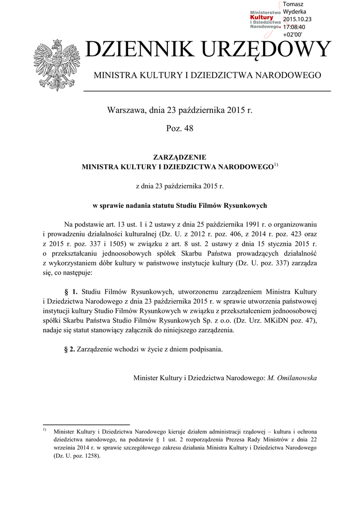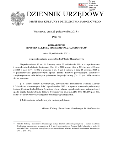 Tomasz Wyderka 2015.10.23 17:08:40 +02'00' DZIENNIK URZĘDOWY MINISTRA KULTURY I DZIEDZICTWA NARODOWEGO Warszawa, dnia 23 października 2015 r. Poz. 48 ZARZĄDZENIE MINISTRA KULTURY I DZIEDZICTWA NARODOWEGO1) z dnia 23 października 2015 r. w sprawie nadania statutu Studiu Filmów Rysunkowych Na podstawie art. 13 ust. 1 i 2 ustawy z dnia 25 października 1991 r. o organizowaniu i prowadzeniu działalności kulturalnej (Dz. U. z 2012 r. poz. 406, z 2014 r. poz. 423 oraz z 2015 r. poz. 337 i 1505) w związku z art. 8 ust. 2 ustawy z dnia 15 stycznia 2015 r. o przekształcaniu jednoosobowych spółek Skarbu Państwa prowadzących działalność z wykorzystaniem dóbr kultury w państwowe instytucje kultury (Dz. U. poz. 337) zarządza się, co następuje: § 1. Studiu Filmów Rysunkowych, utworzonemu zarządzeniem Ministra Kultury i Dziedzictwa Narodowego z dnia 23 października 2015 r. w sprawie utworzenia państwowej instytucji kultury Studio Filmów Rysunkowych w związku z przekształceniem jednoosobowej spółki Skarbu Państwa Studio Filmów Rysunkowych Sp. z o.o. (Dz. Urz. MKiDN poz. 47), nadaje się statut stanowiący załącznik do niniejszego zarządzenia. § 2. Zarządzenie wchodzi w życie z dniem podpisania. Minister Kultury i Dziedzictwa Narodowego: M. Omilanowska 1) Minister Kultury i Dziedzictwa Narodowego kieruje działem administracji rządowej – kultura i ochrona dziedzictwa narodowego, na podstawie § 1 ust. 2 rozporządzenia Prezesa Rady Ministrów z dnia 22 września 2014 r. w sprawie szczegółowego zakresu działania Ministra Kultury i Dziedzictwa Narodowego (Dz. U. poz. 1258). Dziennik Urzędowy Ministra Kultury i Dziedzictwa Narodowego -2- Poz. 48 Załącznik do zarządzenia Ministra Kultury i Dziedzictwa Narodowego z dnia 23 października 2015 r. (poz. 48) STATUT STUDIA FILMÓW RYSUNKOWYCH ROZDZIAŁ 1 POSTANOWIENIA OGÓLNE § 1. 1. Studio Filmów Rysunkowych, zwane dalej „Studiem”, jest państwową instytucją kultury działającą w szczególności na podstawie: 1) ustawy z dnia 25 października 1991 r. o organizowaniu i prowadzeniu działalności kulturalnej (Dz. U. z 2012 r. poz. 406, z 2014 r. poz. 423 oraz z 2015 r. poz. 337 i 1505), zwanej dalej „ustawą”; 2) zarządzenia Ministra Kultury i Dziedzictwa Narodowego z dnia 23 października 2015 r. w sprawie utworzenia państwowej instytucji kultury Studio Filmów Rysunkowych w związku z przekształceniem jednoosobowej spółki Skarbu Państwa Studio Filmów Rysunkowych Sp. z o.o. (Dz. Urz. MKiDN poz. 47); 3) niniejszego statutu. 2. Studio może używać skróconej nazwy „SFR”. § 2. Siedzibą Studia jest Bielsko-Biała, a terenem działania obszar Rzeczypospolitej Polskiej i zagranica. § 3. 1. Organizatorem Studia jest minister właściwy do spraw kultury i ochrony dziedzictwa narodowego, zwany dalej „Ministrem”. 2. Studio jest wpisane do rejestru instytucji kultury prowadzonego przez Ministra i posiada osobowość prawną. 3. Nadzór nad Studiem sprawuje Minister. Dziennik Urzędowy Ministra Kultury i Dziedzictwa Narodowego -3- Poz. 48 ROZDZIAŁ 2 ZAKRES DZIAŁALNOŚCI STUDIA § 4. 1. Do zakresu działalności Studia należy upowszechnianie kultury filmowej przez edukację dzieci i młodzieży oraz działanie na rzecz promocji i rozwoju polskiego filmu, ze szczególnym uwzględnieniem filmów autorskich i filmów animowanych dla dzieci. 2. Studio realizuje swoje cele w szczególności poprzez: 1) promowanie produkcji polskich filmów dla dzieci poprzez wspieranie festiwali i przeglądów filmowych; 2) edukację filmową i upowszechnianie kultury filmowej; 3) produkcję i koprodukcję filmów dla dzieci w różnych technikach filmowych oraz filmów autorskich; 4) dystrybucję i rozpowszechnianie filmów; 5) świadczenie usług produkcyjnych na rzecz podmiotów prowadzących działalność w zakresie kinematografii, nadawców programów telewizyjnych oraz innych podmiotów krajowych i zagranicznych; 6) tworzenie warunków powszechnego dostępu do dorobku polskiej sztuki filmowej poprzez: a) udostępnianie własnych zasobów archiwalnych, b) prowadzenie procesu cyfryzacji i rekonstrukcji filmów. ROZDZIAŁ 3 ORGANY ZARZĄDZAJĄCE I DORADCZE ORAZ SPOSÓB ICH POWOŁYWANIA § 5. Organami Studia są: 1) Dyrektor; 2) Rada Programowa, zwana dalej „Radą”. § 6. 1. Dyrektor zarządza Studiem i reprezentuje je na zewnątrz. 2. Do obowiązków Dyrektora należy realizacja zadań statutowych, a w szczególności: 1) odpowiedzialność za bieżącą działalność Studia; 2) przygotowywanie strategii, rocznych i wieloletnich programów działania oraz założeń finansowych działalności Studia; 3) nadzór i koordynacja wykonania programów działania i planów finansowych Studia; Dziennik Urzędowy Ministra Kultury i Dziedzictwa Narodowego -4- Poz. 48 4) sporządzanie sprawozdań merytorycznych i sprawozdań finansowych za każdy rok kalendarzowy; 5) racjonalne i efektywne gospodarowanie posiadanymi środkami finansowymi i materialnymi oraz prawami; 6) wydawanie wewnętrznych zarządzeń i regulaminów. 3. Dyrektora powołuje i odwołuje Minister w trybie określonym ustawą. 4. Organizację wewnętrzną Studia oraz ramowy zakres działania komórek organizacyjnych i samodzielnych stanowisk pracy określa regulamin organizacyjny Studia, nadany przez Dyrektora w trybie określonym w art. 13 ust. 3 ustawy. § 7. 1. Rada jest organem doradczym i opiniodawczym Dyrektora. 2. Do zadań Rady należy: 1) opiniowanie strategii, rocznych i wieloletnich programów działania Studia oraz ocena ich realizacji; 2) pomoc Dyrektorowi w poszukiwaniu nowych form wsparcia organizacyjnego, koncepcyjnego i finansowego działalności Studia; 3) wyrażanie opinii i składanie wniosków do Dyrektora we wszystkich istotnych sprawach związanych z działalnością Studia. § 8. 1. W skład Rady wchodzą osoby powoływane na okres 4 lat przez Ministra na wniosek Dyrektora. 2. Rada liczy 3 członków. 3. Pierwsze posiedzenie R
