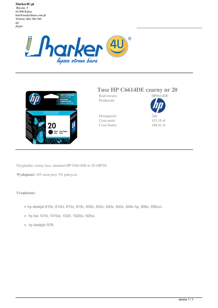 Marker4U.pl Boczna 5 62-800 Kalisz [email protected] Telefon: 884-760-760 gg: skype: Tusz HP C6614DE czarny nr 20 Kod towaru: Producent: HP6614DE Dostępność: Cena netto: Cena brutto: 24h 153.19 zł 188.42 zł Oryginalny czarny tusz, atrament HP C6614DE nr 20 (HP20) Wydajność: 455 stron przy 5% pokryciu Urządzenie: hp deskjet 610c, 610cl, 612c, 615c, 630c, 632c, 640c, 642c, 648c hp, 656c, 656cvr, hp fax 1010, 1010xi, 1020, 1020xi, 925xi, hp deskjet f378 strona 1 / 1 Powered by TCPDF (www.tcpdf.org)