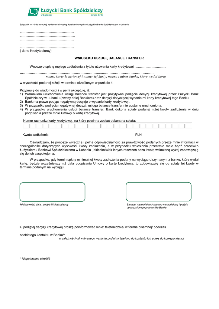 Załącznik nr 16 do Instrukcji wydawania i obsługi kart kredytowych w Łużyckim Banku Spółdzielczym w Lubaniu ........................................................... ............................................................ ........................................................... ........................................................... ........................................................... ( dane Kredytobiorcy) WNIOSEKO USŁUGĘ BALANCE TRANSFER Wnoszę o spłatę mojego zadłużenia z tytułu używania karty kredytowej ………….................... …………………………………….…………………………...……………………………………….. nazwa karty kredytowej i numer tej karty, nazwa i adres banku, który wydał kartę w wysokości podanej niżej i w terminie określonym w punkcie 4. Przyjmuję do wiadomości i w pełni akceptuję, iż: 1) Warunkiem uruchomienia usługi balance transfer jest pozytywne podjęcie decyzji kredytowej przez Łużycki Bank Spółdzielczy w Lubaniu (zwany dalej Bankiem) oraz decyzji dotyczącej wydania mi karty kredytowej tego Banku. 2) Bank ma prawo podjąć negatywną decyzję o wydanie karty kredytowej . 3) W przypadku podjęcia negatywnej decyzji, usługa balance transfer nie zostanie uruchomiona. 4) W przypadku uruchomienia usługi balance transfer, Bank dokona spłaty podanej niżej kwoty zadłużenia w dniu podpisania przeze mnie Umowy o kartę kredytową. Numer rachunku karty kredytowej, na który powinna zostać dokonana spłata: Kwota zadłużenia: PLN Oświadczam, że ponoszę wyłączną i pełną odpowiedzialność za prawdziwość podanych przeze mnie informacji w szczególności dotyczących wysokości kwoty zadłużenia, a w przypadku wniesienia przeciwko mnie bądź przeciwko Łużyckiemu Bankowi Spółdzielczemu w Lubaniu jakichkolwiek innych roszczeń poza kwotą wskazaną wyżej zobowiązuję się do ich zaspokojenia. W przypadku, gdy termin spłaty minimalnej kwoty zadłużenia podany na wyciągu otrzymanym z banku, który wydał kartę, będzie wcześniejszy niż data podpisania Umowy o kartę kredytową, to zobowiązuję się do spłaty tej kwoty w terminie podanym na wyciągu. Miejscowość, data i podpis Wnioskodawcy Stempel memoriałowy/ kasowo-memoriałowy i podpis upoważnionego pracownika Banku O podjętej decyzji kredytowej proszę poinformować mnie: telefonicznie/ w formie pisemnej/ podczas osobistego kontaktu w Banku*: …………………………………………………………………………………. w zależności od wybranego wariantu podać nr telefonu do kontaktu lub adres do korespondencji * Niepotrzebne skreślić