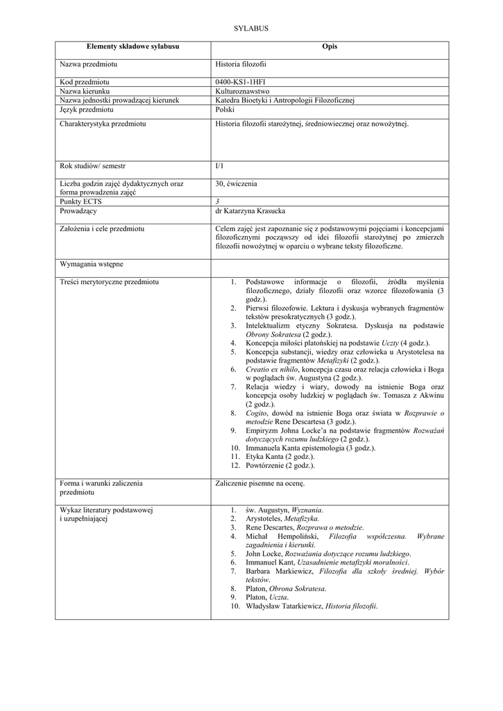 SYLABUS Elementy składowe sylabusu Opis Nazwa przedmiotu Historia filozofii Kod przedmiotu Nazwa kierunku Nazwa jednostki prowadzącej kierunek Język przedmiotu 0400-KS1-1HFI Kulturoznawstwo Katedra Bioetyki i Antropologii Filozoficznej Polski Charakterystyka przedmiotu Historia filozofii starożytnej, średniowiecznej oraz nowożytnej. Rok studiów/ semestr I/1 Liczba godzin zajęć dydaktycznych oraz forma prowadzenia zajęć Punkty ECTS Prowadzący 30, ćwiczenia Założenia i cele przedmiotu Celem zajęć jest zapoznanie się z podstawowymi pojęciami i koncepcjami filozoficznymi począwszy od idei filozofii starożytnej po zmierzch filozofii nowożytnej w oparciu o wybrane teksty filozoficzne. 3 dr Katarzyna Krasucka Wymagania wstępne Treści merytoryczne przedmiotu Forma i warunki zaliczenia przedmiotu Wykaz literatury podstawowej i uzupełniającej Podstawowe informacje o filozofii, źródła myślenia filozoficznego, działy filozofii oraz wzorce filozofowania (3 godz.). 2. Pierwsi filozofowie. Lektura i dyskusja wybranych fragmentów tekstów presokratycznych (3 godz.). 3. Intelektualizm etyczny Sokratesa. Dyskusja na podstawie Obrony Sokratesa (2 godz.). 4. Koncepcja miłości platońskiej na podstawie Uczty (4 godz.). 5. Koncepcja substancji, wiedzy oraz człowieka u Arystotelesa na podstawie fragmentów Metafizyki (2 godz.). 6. Creatio ex nihilo, koncepcja czasu oraz relacja człowieka i Boga w poglądach św. Augustyna (2 godz.). 7. Relacja wiedzy i wiary, dowody na istnienie Boga oraz koncepcja osoby ludzkiej w poglądach św. Tomasza z Akwinu (2 godz.). 8. Cogito, dowód na istnienie Boga oraz świata w Rozprawie o metodzie Rene Descartesa (3 godz.). 9. Empiryzm Johna Locke’a na podstawie fragmentów Rozważań dotyczących rozumu ludzkiego (2 godz.). 10. Immanuela Kanta epistemologia (3 godz.). 11. Etyka Kanta (2 godz.). 12. Powtórzenie (2 godz.). 1. Zaliczenie pisemne na ocenę. św. Augustyn, Wyznania. Arystoteles, Metafizyka. Rene Descartes, Rozprawa o metodzie. Michał Hempoliński, Filozofia współczesna. Wybrane zagadnienia i kierunki. 5. John Locke, Rozważania dotyczące rozumu ludzkiego. 6. Immanuel Kant, Uzasadnienie metafizyki moralności. 7. Barbara Markiewicz, Filozofia dla szkoły średniej. Wybór tekstów. 8. Platon, Obrona Sokratesa. 9. Platon, Uczta. 10. Władysław Tatarkiewicz, Historia filozofii. 1. 2. 3. 4.