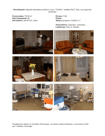 Nieruchomość: budynek mieszkalno-użytkowy o pow. 378,89m 2, działka 922m2, Żnin, woj. kujawskopomorskie Powierzchnia: 378,89 m2 Ilość kondygnacji: III Rok budowy: lata 90 XX. wieku Piwnica: TAK Winda: Miejsce postojowe: GARAŻ x 2 Województwo: kujawsko - pomorskie Lokalizacja: Żnin, ul. Szkolna Przedstawiona oferta ma charakter informacyjny, nie stanowi oferty handlowej w rozumieniu Art.66 par.1 Kodeksu Cywilnego. Opis nieruchomości: Budynek mieszkalno-usługowy, wolnostojący, z dachem płaskim pokrytym papą. Na poziomie parteru mieści się część komercyjno-usługowa, która zajmuje powierzchnię 138,98m2. W tej części znajduje się cukiernia/piekarnia oraz biuro. W przyziemiu również mieszczą się pomieszczenia użytkowe (wynajmowane pod działalność usługową, oraz powierzchnie magazynowe) zajmujące pow. 122,55m2. Pozostała część budynku przeznaczona jest na cele mieszkalne i składa się z I piętra. Na działce znajdują się również zabudowania garażowe o pow. 36,13m2 i 37,00m2. Instalacje w obiekcie : elektryczna, wodno kanalizacyjna, centralnego ogrzewania (ogrzewanie gazowe i węglowe) I piętro - część mieszkalna Parter Powierzchnia w m2 Pomieszczenie przedpokój pom. cukierni pom. produkcyjne zmywalnia pom. produkcyjne magazynek chłodnia magazyn wyrobów gotowych magazynek chłodnia pomieszczenie biuro Pomieszczenie pomieszczenie pomieszczenie pomieszczenie korytarz magazyn kotłownia magazyn magazyn 18,39 20,74 31,05 7,19 23,35 5,93 1,91 12,3 6,26 2,01 2,85 7 Pomieszczenie Powierzchnia w m2 salon sypialnia łazienka sypialnia sypialnia wc przedpokój hall jadalnia kuchnia 27,25 7,5 4,45 24,95 9,45 0,86 5,82 8,05 21,53 7,5 Budynki garażowe Pomieszczenie Powierzchnia w m2 Piwnica Powierzchnia w m2 9,6 50,5 14,4 10,7 6,98 15,77 6,82 7,78 garaż I garaż II Przedstawiona oferta ma charakter informacyjny, nie stanowi oferty handlowej w rozumieniu Art.66 par.1 Kodeksu Cywilnego. 36,13 37 Osoby do kontaktu: Imię Nazwisko : Kamil Bober Imię Nazwisko : Bartosz Szafarz Telefon : 691 333 425 e-mail : [email protected] Telefon : 797 333 277 e-mail : [email protected] Przedstawiona oferta ma charakter informacyjny, nie stanowi oferty handlowej w rozumieniu Art.66 par.1 Kodeksu Cywilnego.