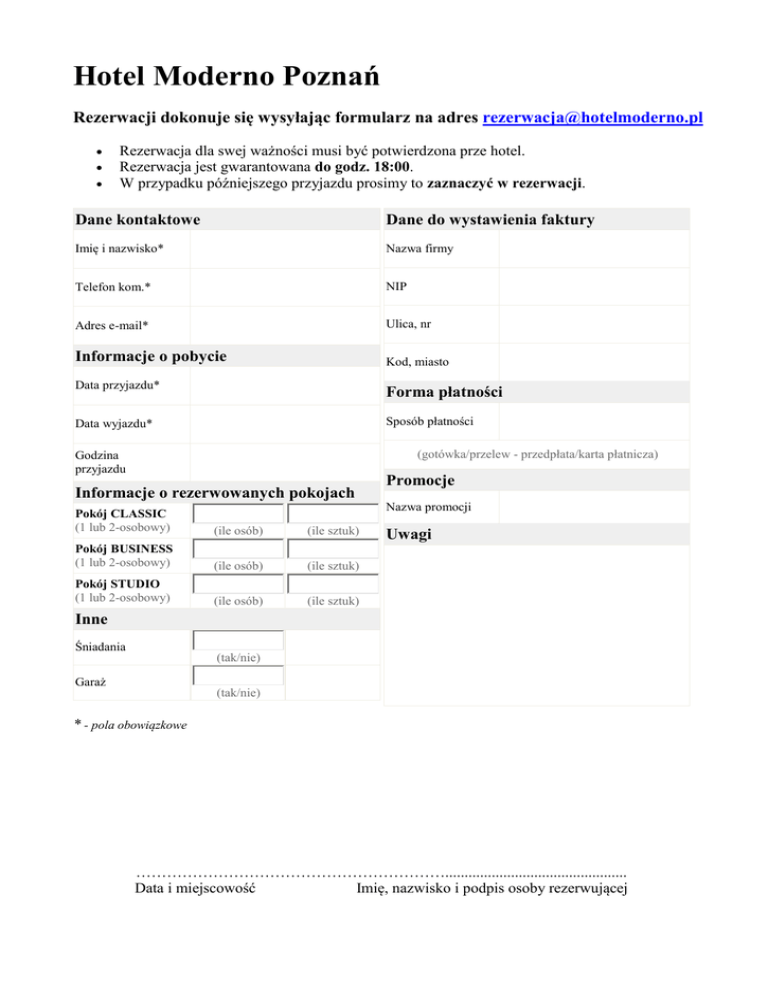 Hotel Moderno Poznań Rezerwacji dokonuje się wysyłając formularz na adres [email protected] Rezerwacja dla swej ważności musi być potwierdzona prze hotel. Rezerwacja jest gwarantowana do godz. 18:00. W przypadku późniejszego przyjazdu prosimy to zaznaczyć w rezerwacji. Dane kontaktowe Dane do wystawienia faktury Imię i nazwisko* Nazwa firmy Telefon kom.* NIP Adres e-mail* Ulica, nr Informacje o pobycie Kod, miasto Data przyjazdu* Forma płatności Data wyjazdu* Sposób płatności (gotówka/przelew - przedpłata/karta płatnicza) Godzina przyjazdu Informacje o rezerwowanych pokojach Promocje Nazwa promocji Pokój CLASSIC (1 lub 2-osobowy) (ile osób) (ile sztuk) Pokój BUSINESS (1 lub 2-osobowy) (ile osób) (ile sztuk) Pokój STUDIO (1 lub 2-osobowy) (ile osób) (ile sztuk) Uwagi Inne Śniadania (tak/nie) Garaż (tak/nie) * - pola obowiązkowe ……………………………………………………............................................... Data i miejscowość Imię, nazwisko i podpis osoby rezerwującej