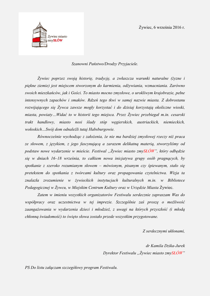 Żywiec, 6 września 2016 r. Szanowni Państwo/Drodzy Przyjaciele. Żywiec poprzez swoją historię, tradycję, a zwłaszcza warunki naturalne (żyzne i piękne ziemie) jest miejscem stworzonym do karmienia, odżywiania, wzmacniania. Zarówno swoich mieszkańców, jak i Gości. To miasto mocno zmysłowe, o urokliwym krajobrazie, pełne intensywnych zapachów i smaków. Rdzeń tego tkwi w samej nazwie miasta. Z dobrostanu rozwijającego się Żywca zawsze mogły korzystać i do dzisiaj korzystają okoliczne wioski, miasta, powiaty…Widać to w historii tego miejsca. Przez Żywiec przebiegał m.in. cesarski trakt handlowy, miasto nosi ślady stóp węgierskich, austriackich, niemieckich, wołoskich…Swój dom odnaleźli tutaj Habsburgowie. Równocześnie wychodząc z założenia, że nie ma bardziej zmysłowej rzeczy niż praca ze słowem, z językiem, z jego fascynującą a zarazem delikatną materią, stworzyliśmy od podstaw nowe wydarzenie w mieście. Festiwal „Żywiec miasto zmySŁÓW”, który odbędzie się w dniach 16–18 września, to całkiem nowa inicjatywa grupy osób pragnących, by spotkanie z szeroko rozumianym słowem – mówionym, pisanym czy śpiewanym, stało się pretekstem do spotkania z twórcami kultury oraz propagowania czytelnictwa. Wizja ta znalazła zrozumienie w żywieckich instytucjach kulturalnych m.in. w Bibliotece Pedagogicznej w Żywcu, w Miejskim Centrum Kultury oraz w Urzędzie Miasta Żywiec. Zatem w imieniu wszystkich organizatorów Festiwalu serdecznie zapraszam Was do współpracy oraz uczestnictwa w tej imprezie. Szczególnie zaś proszę o możliwość zaangażowania w wydarzenia dzieci i młodzież, z uwagi na których przyszłość (i młodą chłonną świadomość) to święto słowa zostało przede wszystkim przygotowane. Z serdecznymi ukłonami, dr Kamila Dzika-Jurek Dyrektor Festiwalu „Żywiec miasto zmySŁÓW” PS Do listu załączam szczegółowy program Festiwalu.