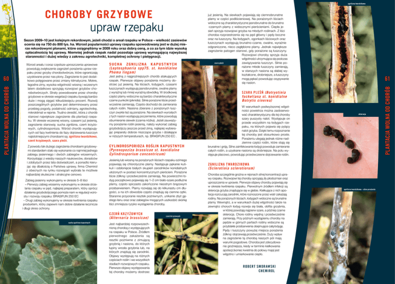 CHOROBY GRZYBOWE upraw rzepaku Sezon 2009–10 jest kolejnym rekordowym, jeżeli chodzi o areał rzepaku w Polsce – wielkość zasiewów ocenia się na 750 do 800 tys. ha. Wzrost popularności uprawy rzepaku spowodowany jest w dużej mierze rekordowymi plonami, które osiągnęliśmy w 2009 roku oraz dobrą ceną, a co za tym idzie wysoką opłacalnością tej uprawy. Niemniej jednak rzepak nadal pozostaje uprawą wymagającą najwyższej staranności i dużej wiedzy z zakresu agrotechniki, kompletnej ochrony i pielęgnacji. Wzrost areału i coraz częstsze uproszczenia uprawowe powodują zwiększenie zagrożeń porażenia upraw rzepaku przez grzyby chorobotwórcze, które ograniczają uzyskiwane przez nas plony. Zagrożenie to jest dodatkowo potęgowane przez zmiany klimatyczne. Mokre, łagodne zimy, wysoka wilgotność wiosną i wczesnym latem dodatkowo sprzyjają rozwojowi grzybów chorobotwórczych. Straty powodowane przez choroby grzybowe w okresie wegetacji rzepaku bywają bardzo duże i mogą sięgać kilkudziesięciu procent. Rozwój poszczególnych grzybów jest determinowany przez przebieg pogody, podatność odmiany, agrotechnikę, mikroklimat w rejonie. Trudno określić, która z chorób stanowi największe zagrożenie dla plantacji rzepaku. W okresie wczesnej wiosny, czasami już jesienią, zagrożenie stanowią: sucha zgnilizna, czerń krzyżowych, cylindrosporioza. Wśród chorób występujących od fazy kwitnienia do fazy dojrzewania łuszczyn najistotniejszymi chorobami są: zgnilizna twardzikowa, czerń krzyżowych, szara pleśń. SUCHA ZGNILIZNA K APUSTNYCH (Leptosphaeria spp75. st. konidialne Phoma lingam) Z powodu tak dużego zagrożenia chorobami grzybowymi standardem stało się wykonanie co najmniej jednego zabiegu jesiennego i dwóch zabiegów wiosennych. Korzystając z wiedzy naszych naukowców, doradców i zdobytych przez lata doświadczeń, a ponadto kierując się dbałością o Państwa uprawy, firma Chemirol z obecnych na rynku rozwiązań wybrała te możliwie najbardziej skuteczne i atrakcyjne cenowo. CYLINDROSPORIOZ A ROŚLIN K APUSTNYCH (Pyrenopeziza brassicae st. konidialne Cylindrosporium concentricum) Zabieg jesienny wykonujemy w okresie 5–8 liści – Pierwszy zabieg wiosenny wykonujemy w okresie strzelania rzepaku w pęd, najlepiej preparatem, który oprócz działania grzybobójczego pomoże nam w regulacji wzrostu i rozwoju rzepaku: BRASIFUN 250 EC – Drugi zabieg wykonujemy w okresie kwitnienia rzepaku produktem, który zapewni nam dobre działanie lecznicze i długi okres ochrony. Jest jedną z najgroźniejszych chorób atakujących rzepak. Pierwsze objawy porażenia możemy dostrzec już jesienią. Na liściach, łodygach, czasami łuszczynach występują jasnobrunatne, owalne plamy z wyraźną lub mniej wyraźną obwódką. W środkowej części plamy widoczne są bardzo charakterystyczne czarne punkciki (piknidia). Silnie porażone liście przedwcześnie zamierają. Często dochodzi do zamierania całych roślin. Nasiona zbierane z porażonych łuszczyn zwykle też są porażone. Na siewkach wyrosłych z tych nasion występują poczernienia, które powodują obumieranie siewek (czarna nóżka). Jeżeli zauważymy porażenie roślin jesienią, należy wykonać zabieg grzybobójczy jeszcze przed zimą, najlepiej wybierając preparaty dobrze niszczące grzyba i działające w niższych temperaturach, np. BRASIFUN 250 EC . Jesienią lub wiosną na porażonych liściach rzepaku ozimego pojawiają się chlorotyczne plamy. Następuje pękanie kutikuli i odsłonięcie białych skupień zarodników konidialnych ułożonych w postaci koncentrycznych pierścieni. Porażone liście żółkną i przedwcześnie zamierają. Na powierzchni łodyg początkowo pojawiają się 1–2 cm biało-szare podłużne plamy, często spiczasto zakończone nieostrym brązowym przebarwieniem. Plamy rozwijają się do kilkunastu cm długości, a na ich obwodzie często znajdują się ciemne cętki. Staranne przyoranie resztek pożniwnych, unikanie zbyt gęstego łanu oraz oraz zabiegów mogących uszkodzić skórkę liści zmniejsza ryzyko wystąpienia choroby. CZERŃ K RZ YŻOW YCH (Alternaria brassicae) Jest najbardziej rozpowszechnioną chorobą z występujących na rzepaku w Polsce. Źródłem pierwotnego zakażenia są resztki pożniwne z zimującą grzybnią i nasiona, do których łupiny wrosła grzybnia lub, na których znajdują się zarodniki. Objawy występują na różnych częściach roślin i we wszystkich stadiach rozwojowych rzepaku. Pierwsze objawy występowania tej choroby możemy dostrzec już jesienią. Na siewkach pojawiają się ciemnobrunatne plamy w części podliścieniowej. Na porażonych liściach widoczne są charakterystyczne jasnobrunatne do brunatno -czarnych plamy z widocznymi pierścieniami. Ciepła jesień sprzyja rozwojowi grzyba na młodych roślinach. Z liści choroba rozprzestrzenia się na pęd główny i pędy boczne oraz na łuszczyny. Na łodygach, ogonkach liściowych oraz łuszczynach występują brunatno-czarne, owalne, wyraźnie odgraniczone, nieco zagłębione plamy. Jednak największe zagrożenie patogen stanowi, gdy porażone są łuszczyny. Rozwojowi choroby sprzyja duża wilgotności utrzymująca się podczas zawiązywania łuszczyn. Silnie porażone młode łuszczyny zamierają, w starszych nasiona są słabiej wykształcone, drobniejsze, a łuszczyny mogą pękać powodując osypywanie się nasion. S Z A R A PL E ŚŃ (Botryotinia fuckeliana st. konidialne Botrytis cinerea) W warunkach podwyższonej wilgotności powietrza można zaobserwować charakterystyczny dla tej choroby szary puszysty nalot. Występuje on przede wszystkim na łodygach rzepaku, na których pojawia się pylący nalot grzyba. Dzięki temu rozpoznanie tej choroby jest stosunkowo proste. Porażeniu ulegają jednak różne nadziemne części roślin, które stają się brunatne i gniją. Silne zainfekowanie łodygi powoduje zamieranie całych rośl