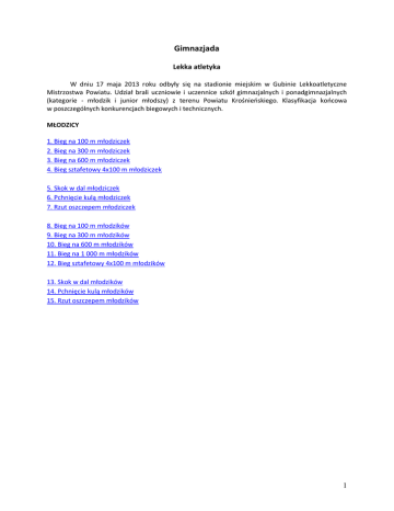 Gimnazjada Lekka atletyka W dniu 17 maja 2013 roku odbyły się na stadionie miejskim w Gubinie Lekkoatletyczne Mistrzostwa Powiatu. Udział brali uczniowie i uczennice szkół gimnazjalnych i ponadgimnazjalnych (kategorie - młodzik i junior młodszy) z terenu Powiatu Krośnieńskiego. Klasyfikacja końcowa w poszczególnych konkurencjach biegowych i technicznych. MŁODZICY 1. Bieg na 100 m młodziczek 2. Bieg na 300 m młodziczek 3. Bieg na 600 m młodziczek 4. Bieg sztafetowy 4x100 m młodziczek 5. Skok w dal młodziczek 6. Pchnięcie kulą młodziczek 7. Rzut oszczepem młodziczek 8. Bieg na 100 m młodzików 9. Bieg na 300 m młodzików 10. Bieg na 600 m młodzików 11. Bieg na 1 000 m młodzików 12. Bieg sztafetowy 4x100 m młodzików 13. Skok w dal młodzików 14. Pchnięcie kulą młodzików 15. Rzut oszczepem młodzików 1 JUNIORZY MŁODSI 1. Bieg na 100 m juniorek młodszych 2. Bieg na 400 m juniorek młodszych 3. Bieg na 800 m juniorek młodszych 4. Bieg sztafetowy 4x100 m juniorek młodszych 5. Skok w dal juniorek młodszych 6. Pchnięcie kulą juniorek młodszych 7. Rzut oszczepem juniorek młodszych 8. Bieg na 100 m juniorów młodszych 9. Bieg na 400 m juniorów młodszych 10. Bieg na 1 500 m juniorów młodszych 11. Bieg sztafetowy 4x100 m juniorów młodszych 12. Skok w dal juniorów młodszych 13. Pchnięcie kulą juniorów młodszych 14. Rzut oszczepem juniorów młodszych 15. Tabela zbiorcza konkurencji lekkoatletycznych GIMNAZJA – chłopcy 2013 16. Tabela zbiorcza konkurencji lekkoatletycznych GIMNAZJA – dziewczęta 2013 17. Tabela zbiorcza konkurencji lekkoatletycznych SZKOŁY PONADGIMNAZJALNE – chłopcy 2013 18. Tabela zbiorcza konkurencji lekkoatletycznych SZKOŁY PONADGIMNAZJALNE – dziewczęta 2013 2 DZIEWCZĘTA MŁODSZE (MŁODZICZKI – I-II KLASY GIMNAZJUM) KONKURENCJE BIEGOWE BIEG NA 100 METRÓW Miejsce 1 2 3 4 5 6 7 8 8 10 11 12 13 14 Imię i nazwisko Anna Butkiewicz Kornelia Mądrawska Agnieszka Kaczyńska Kamila Koplin Natalia Pytiak Anita Chwałek Dominika Kimel Beata Kawka Łucja Jabłońska Nikola Krysiak Natalia Dobosz Katarzyna Gryń Olga Dubiel Weronika Stolarczyk Szkoła G. Krosno G. Bobrowice G. Maszewo G. nr 1 Gubin G. nr 2 Gubin G. nr 1 Gubin G. nr 2 Gubin G. Maszewo G. nr 1 Gubin G. Krosno G. nr 2 Gubin G. Bytnica G. Bytnica G. Bytnica Czas 13,67 13,74 13,79 14,14 14,59 14,66 14,76 14,82 14,82 14,85 15,18 16,20 16,42 16,55 Punkty 20 15 12 10 8 6 5 4 4 1 Czas 47,61 50,33 51,51 52,64 54,28 54,39 54,72 55,55 56,64 58,20 59,77 63,30 Punkty 20 15 12 10 8 6 5 4 2 1 Czas 1,53,19 2,01,25 2,02,85 2,10,86 2,11,40 2,11,61 2,13,75 2,18,24 Punkty 20 15 12 10 8 6 5 4 BIEG NA 300 METRÓW Miejsce 1 2 3 4 5 6 7 8 9 10 11 12 Imię i nazwisko Anna Butkiewicz Anita Chwałek Agnieszka Kaczyńska Justyna Pypeć Julita Amroży Beata Kawka Oliwia Lewandowska Agnieszka Rowińska Katarzyna Gryń Monika Milian Maja Wierzbicka Łucja Jabłońska Szkoła G. Krosno G. nr 1 Gubin G. Maszewo G. nr 2 Gubin G. nr 1 Gubin G. Maszewo G. Krosno G. Bobrowice G. Bytnica G. Bytnica G. Krosno G. nr 1 Gubin BIEG NA 600 METRÓW Miejsce 1 2 3 4 5 6 7 8 Imię i nazwisko Anna Tarczewska Weronika Brusiło Natalia Niżyńska Sandra Lodzińska Natalia Benc Marlena Miśnikiewicz Kamila Czepiżak Natalia Toporska Szkoła G. Krosno G. Krosno G. nr 1 Gubin G. Krosno G. Maszewo G. Maszewo G. nr 1 Gubin G. nr 2 Gubin 3 BIEG SZTAFETOWY 4 X 100 METRÓW Miejsce 1 2 3 4 5 6 Szkoła Gimnazjum Bobrowice Gimnazjum Krosno Odrzańskie Gimnazjum nr 1 Gubin Gimnazjum nr 2 Gubin Gimnazjum Maszewo Gimnazjum Bytnica Czas 60,43 61,26 62,96 63,37 63,66 68,86 Punkty 20 15 12 10 8 6 KONKURENCJE TECHNICZNE SKOK W DAL Miejsce 1 2 3 4 5 6 7 8 9 10 Imię i nazwisko Natalia Pytjak Kornelia Mądrawska Oliwia Lewandowska Nikola Krysiak Weronika Kaczmarek Kamila Koplin Nikola Olczyk Olga Dubiel Hanna Najwer Roksana Klinik Szkoła G. nr 2 Gubin G. Bobrowice G. Krosno G. Krosno G. nr 2 Gubin G. nr 1 Gubin G. Bytnica G. Bytnica G. Bytnica G. Bobrowice Wynik 4,63 4,29 4,20 4,14 4,11 4,02 3,93 3,66 3,35 3,34 Punkty 20 15 12 10 8 6 5 4 2 1 Wynik 8,48 8,11 7,93 7,87 7,60 7,23 6,54 Punkty 20 15 12 10 8 6 5 Wynik 25,05 18,60 15,90 14,25 Punkty 20 15 12 10 PCHNIĘCIE KULĄ Miejsce 1 2 3 4 5 6 7 Imię i nazwisko Kamila Loga Paulina Kowalska Roksana Klinik Natalia Kłos Dajana Wątor Agnieszka Rowińska Oliwia Potoniec Szkoła G. nr 2 Gubin G. nr 1 Gubin G. Bobrowice G. nr 2 Gubin G. Maszewo G. Bobrowice G. Bobrowice RZUT OSZCZEPEM Miejsce 1 2 3 4 Imię i nazwisko Natalia Kłos Dajana Wątor Klaudia Skrzeczkowska Kamila Loga Szkoła G. nr 2 Gubin G. Maszewo G. nr 1 Gubin G. nr 2 Gubin 4 5 Paulina Kowalska G. nr 1 Gubin 14,02 8 CHŁOPCY MŁODSI (MŁODZICY – I-II KLASY GIMNAZJUM) KONKURENCJE BIEGOWE BIEG NA 100 METRÓW Miejsce 1 2 3 4 5 6 7 8 9 9 11 12 13 14 Imię i nazwisko Miłosz Prasał Albert Kubicki Michał Pawełczyk Piotr Strach Adrian Markiewicz Kamil Niedźwiedzki Piotr Błażejewski Michał Łobacz Bartłomiej Wojtuń Paweł Błażejewski Dawid Nowak Jakub Rzaniak Radosław Podlaski Mateusz Kierul Szkoła G. nr 2 Gubin G. Krosno G. Krosno G. nr 1 Gubin G. Dąbie G. Dąbie G. Bytnica G. Bobrowice G. nr 2 Gubin G. Bytnica G. nr 1 Gubin G. Bytnica G. Bobrowice G. Bobrowice Czas 12,70 13,21 13,24 13,38 13,53 13,57 13,88 13,96 14,28 14,28 14,31 14,32 14,79 14,85 Punkty 20 15 12 10 8 6 5 4 2 2 Czas 44,92 45,13 46,18 46,64 48,28 49,07 59,82 Punkty 20 15 12 10 8 6 5 BIEG NA 300 METRÓW Miejsce 1 2 3 4 5 6 7 Imię i nazwisko Kamil Niedźwiedzki Dominik Turczyniak Mariusz Raczyński Błażej Dominikowski Paweł Błażejewski Dawid Skura Bartłomiej Wojtuń Szkoła G. Dąbie G. Dąbie G. nr 1 Gubin G. Bytnica G. Bytnica G. Bytnica G. nr 2 Gubin 5 BIEG NA 600 METRÓW Miejsce 1 2 3 4 5 Imię i nazwisko Marcin Cieślik Marcin Szymański Karol Mazurek Kacper Jeziorek Marcin Zborowski Szkoła G. nr 1 Gubin G. Maszewo G. Bobrowice G. nr 2 Gubin G. nr 1 Gubin Czas 1,42,28 1,45,23 1,47,54 1,51,65 1,51,98 Punkty 20 15 12 10 8 Czas 3,06,1