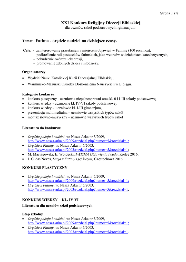 Strona 1 z 8 XXI Konkurs Religijny Diecezji Elbląskiej dla uczniów szkół podstawowych i gimnazjum Temat: Fatima - orędzie nadziei na dzisiejsze czasy. Cele: - zainteresowanie przesłaniem i miejscem objawień w Fatimie (100 rocznica), podkreślenie roli pastuszków fatimskich, jako wzorców w działaniach katechetycznych, pobudzenie twórczej ekspresji, promowanie zdolnych dzieci i młodzieży. Organizatorzy: Wydział Nauki Katolickiej Kurii Diecezjalnej Elbląskiej, Warmińsko-Mazurski Ośrodek Doskonalenia Nauczycieli w Elblągu. Kategorie konkursu: konkurs plastyczny - uczniowie niepełnosprawni oraz kl. 0 i I-III szkoły podstawowej, konkurs wiedzy - uczniowie kl. IV-VI szkoły podstawowej, konkurs wiedzy - uczniowie kl. I-III gimnazjum, prezentacja multimedialna – uczniowie wszystkich typów szkół montaż słowno-muzyczny – uczniowie wszystkich typów szkół Literatura do konkursu: Orędzie pokoju i nadziei, w: Nasza Arka nr 5/2009, http://www.nasza-arka.pl/2009/rozdzial.php?numer=5&rozdzial=1; Orędzie z Fatimy, w: Nasza Arka nr 5/2003, http://www.nasza-arka.pl/2003/rozdzial.php?numer=5&rozdzial=1; M. Maciągowski, E. Wojdecki, FATIMA Objawienia i cuda, Kielce 2016. J. C. das Neves, Łucja z Fatimy i jej kuzyni, Częstochowa 2016. KONKURS PLASTYCZNY Orędzie pokoju i nadziei, w: Nasza Arka nr 5/2009, http://www.nasza-arka.pl/2009/rozdzial.php?numer=5&rozdzial=1; Orędzie z Fatimy, w: Nasza Arka nr 5/2003, http://www.nasza-arka.pl/2003/rozdzial.php?numer=5&rozdzial=1. KONKURS WIEDZY - KL. IV-VI Literatura dla uczniów szkół podstawowych Etap szkolny Orędzie pokoju i nadziei, w: Nasza Arka nr 5/2009, http://www.nasza-arka.pl/2009/rozdzial.php?numer=5&rozdzial=1; Orędzie z Fatimy, w: Nasza Arka nr 5/2003, http://www.nasza-arka.pl/2003/rozdzial.php?numer=5&rozdzial=1. Strona 2 z 8 Etap dekanalny J C. das Neves, Łucja z Fatimy i jej kuzyni, Częstochowa 2016, s. 7 – 81; materiał z etapu szkolnego. Etap diecezjalny J C. das Neves, Łucja z Fatimy i jej kuzyni, Częstochowa 2016, s. 81 – 171; materiał z etapu szkolnego i dekanalnego. KONKURS WIEDZY - GIMNAZJUM Literatura dla uczniów gimnazjum Etap szkolny Orędzie pokoju i nadziei, w: Nasza Arka nr 5/2009, http://www.nasza-arka.pl/2009/rozdzial.php?numer=5&rozdzial=1; Orędzie z Fatimy, w: Nasza Arka nr 5/2003, http://www.nasza-arka.pl/2003/rozdzial.php?numer=5&rozdzial=1. Etap dekanalny M. Maciągowski, E. Wojdecki, FATIMA Objawienia i cuda, Kielce 2016, s. 5 – 92; materiał z etapu szkolnego. Etap diecezjalny M. Maciągowski, E. Wojdecki, FATIMA Objawienia i cuda, Kielce 2016, s. 93 – 214. materiał z etapu szkolnego i dekanalnego. Literatura do nabycia w Wydziale Nauki Katolickiej Kurii Diecezjalnej Elbląskiej, ul. Świętego Ducha 11 lub w internecie. Regulamin konkursu plastycznego : Uczniowie pod kierunkiem i tylko w obecności katechetów wykonają do 15 marca 2017 r. prace plastyczne. Jedną pracę może wykonać tylko 1 osoba. Trzy najlepsze prace ze szkoły, wraz z protokołem, należy dostarczyć do Katechety Dekanalnego do 20 marca 2017 r. Komisje konkursowe powołane przez wizytatora i Katechetę Dekanalnego wybiorą 4 najciekawsze prace, które dostarczą wraz z protokołem ( zob. załącznik nr 6) do W-MODN ul. Wojska Polskiego 1, 82-300 Elbląg, pokój nr 242, w terminie do 31 marca 2017 r. Każda praca musi być zaopatrzona w etykietę: imię i nazwisko, klasę, imię i nazwisko katechety, pieczęć szkoły, Strona 3 z 8 Regulamin konkursu wiedzy Szkoły podstawowe i gimnazja Konkurs będzie przeprowadzony w trzech etapach: etap szkolny etap dekanalny - 10 marca 2017 r.; etap diecezjalny - 6 kwietnia 2017 r. o godz. 10.00; - 10 lutego 2017 r.; Strona 4 z 8 SZKOŁY PODSTAWOWE Dekanat Elbląg Malbork I i II Nowy Staw Sztum, Dzierzgoń Prabuty, Susz Kwidzyn Nowy Dwór Gd. Nadmorski Pasłęk I i II Iława Morąg Nazwa i adres szkoły Przewodniczący komisji dekanalnej Szkoła Podstawowa nr 6 al. J. Piłsudskiego 4 mgr Anna Grzywacz 82-300 Elbląg tel. (55) 625 85 01 Szkoła Podstawowa w Szymankowie mgr Lucyna Stolz 82-224 Lichnowy tel. 601594387 Szkoła Podstawowa nr 2 ul. Mikołaja Reja 15 mgr Barbara Małyska 82-400 Sztum tel. (55) 540 63 53 Szkoła Podstawowa ul. Obrońców Westerplatte 11 mgr Małgorzata Sulikowska 82-550 Prabuty tel. (55) 278 24 14 Gimnazjum nr 2 ul. Mickiewicza 56B dr Ewa Zarębska 82-520 Kwidzyn tel. (55) 279 42 75 Szkoła Podstawowa nr 2 ul. Mickiewicza 10 mgr Rafał Ruszkowski 82-100 Nowy Dwór Gd. tel. (55) 247 26 21 Zespół Szkół ul. Warszawska 1 mgr Agnieszka Głębocka 14-420 Młynary tel. (55) 249 08 72 Samorządowej Szkole Podstawowej nr 4 14-200 Iława mgr Beata Jastrzębska ul. Marii Skłodowskiej-Curie 31 tel. (89) 649 41 98 Szkoła Podstawowa nr 3 ul. Wróblewskiego 17 mgr Elżbieta Nowik 14-300 Morąg tel. (89) 757 42 08 Strona 5 z 8 SZKOŁY GIMNAZJALNE Dekanat Elbląg Malbork I i II Nowy Staw Sztum, Dzierzgoń Prabuty, Susz Kwidzyn Nowy Dwór Gd. Nadmorski Pasłęk I i II Iława Morąg Nazwa i adres szkoły Gimnazjum nr 6 ul. Rawska 3 82-300 Elbląg tel. (55) 625 88 01 Zespół Szkół ul. Bema 6 82-220 Stare Pole tel. (55) 271 35 46 Gimnazjum ul. Gen. A. Zawadzkiego 38A 82-440 Dzierzgoń tel. (55) 276 25 18 Zespół Szkół Aleja Wojska Polskiego 2 14-220 Kisielice tel. (55) 275 60 38 Gimnazjum nr 2 ul. Mickiewicza 56B 82-520 Kwidzyn tel. (55) 279 42 75 Gimnazjum ul. Szkolna 2 82-100 Nowy Dwór Gdański tel. (55) 648 26 23 Zespół Szkół ul. Warszawska 1 14-420 Młynary tel. (55) 249 08 72 Samorządowe Gimnazjum 14-241 Ząbrowo tel. (89) 648 11 83 Gimnazjum nr 1 ul. Adama Mickiewicza 25 14-300 Morąg tel. (89) 757 22 46 Przewodniczący komisji dekanalnej mgr Wisława Zander mgr Janusz Madej mgr Karina Pałka mgr Hanna Górecka dr Ewa Zarębska mgr Joanna Burczy mgr Krzysztof Browalski mgr Andrzej Janowicz mgr Cezary Mazurek Etap II (dekanalny) Eliminacje odbędą się 10 marca 2017 r. (w szkołach wyżej wymienionych). Czas trwania etapu dekanalnego wyno