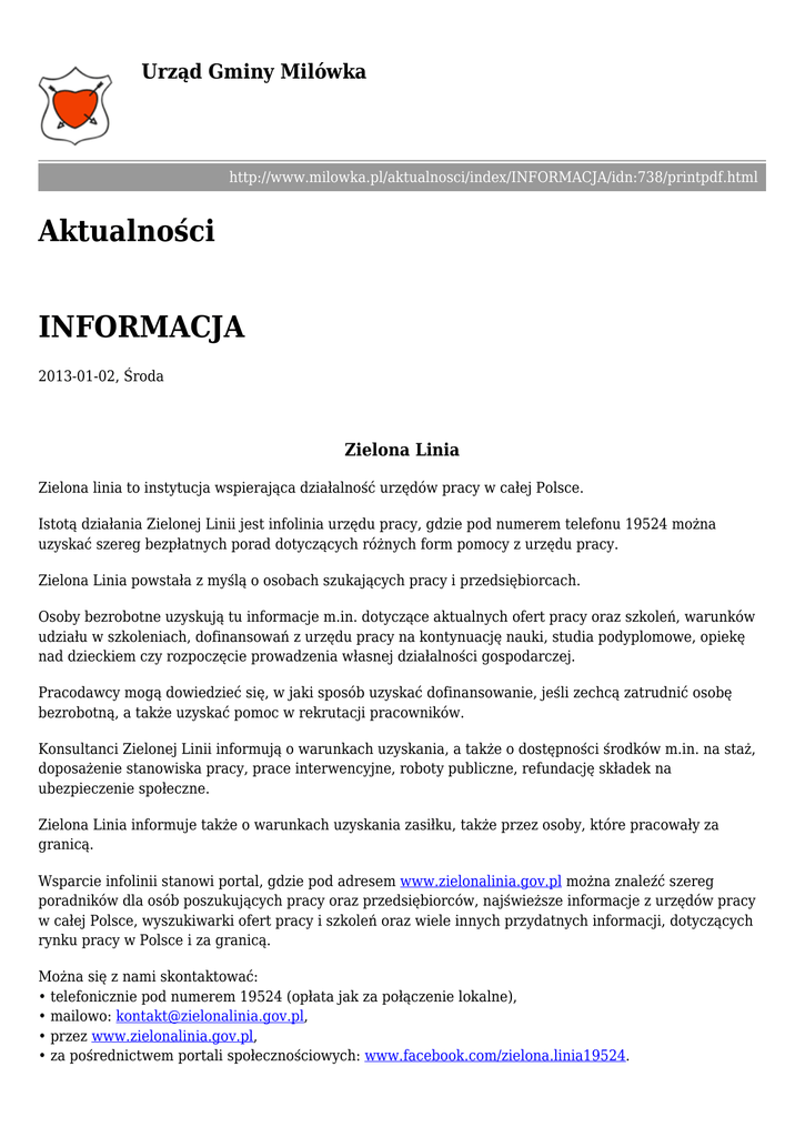 Urząd Gminy Milówka http://www.milowka.pl/aktualnosci/index/INFORMACJA/idn:738/printpdf.html Aktualności INFORMACJA 2013-01-02, Środa Zielona Linia Zielona linia to instytucja wspierająca działalność urzędów pracy w całej Polsce. Istotą działania Zielonej Linii jest infolinia urzędu pracy, gdzie pod numerem telefonu 19524 można uzyskać szereg bezpłatnych porad dotyczących różnych form pomocy z urzędu pracy. Zielona Linia powstała z myślą o osobach szukających pracy i przedsiębiorcach. Osoby bezrobotne uzyskują tu informacje m.in. dotyczące aktualnych ofert pracy oraz szkoleń, warunków udziału w szkoleniach, dofinansowań z urzędu pracy na kontynuację nauki, studia podyplomowe, opiekę nad dzieckiem czy rozpoczęcie prowadzenia własnej działalności gospodarczej. Pracodawcy mogą dowiedzieć się, w jaki sposób uzyskać dofinansowanie, jeśli zechcą zatrudnić osobę bezrobotną, a także uzyskać pomoc w rekrutacji pracowników. Konsultanci Zielonej Linii informują o warunkach uzyskania, a także o dostępności środków m.in. na staż, doposażenie stanowiska pracy, prace interwencyjne, roboty publiczne, refundację składek na ubezpieczenie społeczne. Zielona Linia informuje także o warunkach uzyskania zasiłku, także przez osoby, które pracowały za granicą. Wsparcie infolinii stanowi portal, gdzie pod adresem www.zielonalinia.gov.pl można znaleźć szereg poradników dla osób poszukujących pracy oraz przedsiębiorców, najświeższe informacje z urzędów pracy w całej Polsce, wyszukiwarki ofert pracy i szkoleń oraz wiele innych przydatnych informacji, dotyczących rynku pracy w Polsce i za granicą. Można się z nami skontaktować: • telefonicznie pod numerem 19524 (opłata jak za połączenie lokalne), • mailowo: [email protected], • przez www.zielonalinia.gov.pl, • za pośrednictwem portali społecznościowych: www.facebook.com/zielona.linia19524. Zapraszamy do kontaktu! Nazwa pliku Data Rozmiar Pobierz publikacji Kategoria: Powiązane pliki [ 1 ] Instrukcja Zielona Linia wszystkie aktualności 13-09-25 524.23KB pobierz 09:29