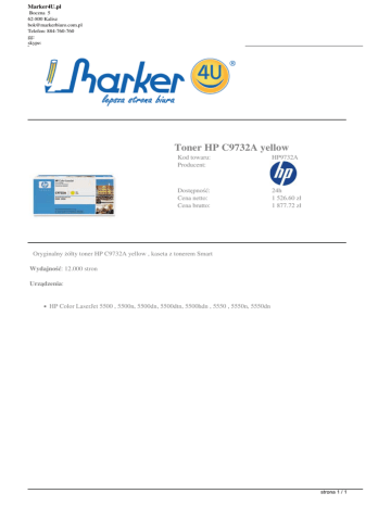 Marker4U.pl Boczna 5 62-800 Kalisz [email protected] Telefon: 884-760-760 gg: skype: Toner HP C9732A yellow Kod towaru: Producent: HP9732A Dostępność: Cena netto: Cena brutto: 24h 1 526.60 zł 1 877.72 zł Oryginalny żółty toner HP C9732A yellow , kaseta z tonerem Smart Wydajność: 12.000 stron Urządzenia: HP Color LaserJet 5500 , 5500n, 5500dn, 5500dtn, 5500hdn , 5550 , 5550n, 5550dn strona 1 / 1 Powered by TCPDF (www.tcpdf.org)
