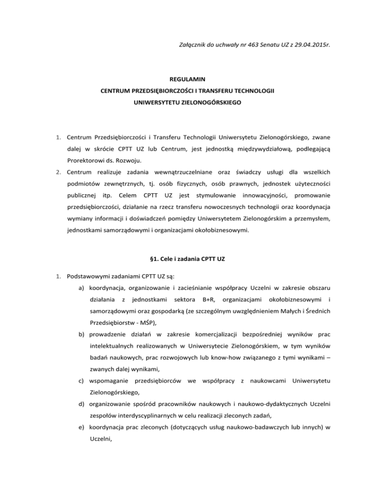 Załącznik do uchwały nr 463 Senatu UZ z 29.04.2015r. REGULAMIN CENTRUM PRZEDSIĘBIORCZOŚCI I TRANSFERU TECHNOLOGII UNIWERSYTETU ZIELONOGÓRSKIEGO 1. Centrum Przedsiębiorczości i Transferu Technologii Uniwersytetu Zielonogórskiego, zwane dalej w skrócie CPTT UZ lub Centrum, jest jednostką międzywydziałową, podlegającą Prorektorowi ds. Rozwoju. 2. Centrum realizuje zadania wewnątrzuczelniane oraz świadczy usługi dla wszelkich podmiotów zewnętrznych, tj. osób fizycznych, osób prawnych, jednostek użyteczności publicznej itp. Celem CPTT UZ jest stymulowanie innowacyjności, promowanie przedsiębiorczości, działanie na rzecz transferu nowoczesnych technologii oraz koordynacja wymiany informacji i doświadczeń pomiędzy Uniwersytetem Zielonogórskim a przemysłem, jednostkami samorządowymi i organizacjami okołobiznesowymi. §1. Cele i zadania CPTT UZ 1. Podstawowymi zadaniami CPTT UZ są: a) koordynacja, organizowanie i zacieśnianie współpracy Uczelni w zakresie obszaru działania z jednostkami sektora B+R, organizacjami okołobiznesowymi i samorządowymi oraz gospodarką (ze szczególnym uwzględnieniem Małych i Średnich Przedsiębiorstw ‐ MŚP), b) prowadzenie działań w zakresie komercjalizacji bezpośredniej wyników prac intelektualnych realizowanych w Uniwersytecie Zielonogórskiem, w tym wyników badań naukowych, prac rozwojowych lub know‐how związanego z tymi wynikami – zwanych dalej wynikami, c) wspomaganie przedsiębiorców we współpracy z naukowcami Uniwersytetu Zielonogórskiego, d) organizowanie spośród pracowników naukowych i naukowo‐dydaktycznych Uczelni zespołów interdyscyplinarnych w celu realizacji zleconych zadań, e) koordynacja prac zleconych (dotyczących usług naukowo‐badawczych lub innych) w Uczelni, f) promocja wyników badań naukowych pracowników wydziałów Uniwersytetu Zielonogórskiego, g) współpraca z uczelniami polskimi i zagranicznymi w zakresie działań na rzecz transferu technologii, realizowania projektów badawczych i naukowych, h) realizacja projektów o charakterze regionalnym, krajowym i międzynarodowym w obszarach obejmujących działalność CPTT, i) opiniowanie nowych technologii, produktów i usług pod kątem ich innowacyjności. 2. Do pozostałych zadań CPTT UZ należą: a) wydawanie opinii o innowacyjności procesowej i produktowej dla technologii stosowanych w przedsiębiorstwach, wydawane przez CPTT UZ opinie są wykonywane przez pracowników naukowych i naukowo‐dydaktycznych Uniwersytetu Zielonogórskiego, b) promowanie innowacyjnych technologii, c) upowszechnianie wiedzy oraz prowadzenie wymiany informacji z zakresu nowoczesnych technologii, organizacji i zarządzania, d) promowanie wysokiej jakości wyrobów i usług, e) prowadzenie działań na rzecz rozwoju przygranicznych kontaktów w zakresie gospodarki, innowacji i nauki, f) organizacja szkoleń, warsztatów i konferencji z międzynarodowego transferu technologii oraz wzrostu konkurencyjności przedsiębiorstw i jednostek naukowych Uniwersytetu Zielonogórskiego na rynku międzynarodowym, g) realizacja projektów ze środków unijnych i budżetu Państwa w zakresie badania potencjału naukowego i badawczego Uczelni, promocji wyników badań naukowych, monitorowania, analizowania i programowania skutecznej polityki przedsiębiorczości regionu służącej wzrostowi konkurencyjności poprzez transfer technologii i kreowanie gospodarki opartej na wiedzy, innowacyjności i współpracy międzynarodowej przedsiębiorstw, h) pomoc dla wydziałów Uczelni w organizowaniu nieobowiązkowych praktyk przemysłowych i innych form kontaktu studentów z gospodarką np.: prace przejściowe i dyplomowe, wycieczki. §2. Dyrektor CPTT UZ 1. Działalnością Centrum kieruje Dyrektor. 2. Dyrektora CPTT UZ powołuje i odwołuje Rektor na wniosek Prorektora ds. Rozwoju. 3. Do zadań i obowiązków Dyrektora CPTT UZ należy w szczególności: a) kierowanie bieżącą działalnością Centrum, b) opracowywanie planów działalności szkoleniowej oraz rozwoju Centrum, c) opracowywanie planów finansowych, obejmujących również planowanie zatrudnienia, d) opracowywanie rocznych sprawozdań z działalności CPTT do zatwierdzenia przez Prorektora ds. Rozwoju. 4. Dyrektor CPTT UZ odpowiada za mienie przydzielone Centrum. §3. Struktura organizacyjna CPTT UZ 1. W strukturze CPTT UZ znajdują się i podlegają Dyrektorowi: a) sekretariat, b) Sekcja Współpracy z Zagranicą, c) Sekcja Kontaktów z Klientem, d) Sekcja Współpracy z Przemysłem, e) Sekcja Praw Własności Intelektualnej: ‐ Rzecznik patentowy, f) Realizacja Projektów Unijnych – B2E. 2. Do zadań sekretariatu należy: a) obsługa administracyjna działalności Centrum, b) obsługa administracyjna organizowanych spotkań, warsztatów, dni konsultacyjnych, dni informacyjnych, konferencji w ramach działalności Centrum, c) przygotowywanie cyklicznych zestawień i raportów dla Dyrektora Centrum, d) realizacja rzeczowo – finansowa projektów Centrum. 3. Do zadań Sekcji Współpracy z Zagranicą należy: a) pomoc przedsiębiorcom lubuskim w nawiązywaniu międzynarodowej współpracy handlowej, b) wprowadzanie profili lubuskich przedsiębiorstw do międzynarodowych baz, c) tworzenie profili handlowych i technologicznych oraz przeszukiwanie tych baz w celu pozyskania odpowiedniego partnera do współpracy dla klientów CPTT UZ, d) organizacja międzynarodowych misji gospodarczych i branżowych spotkań biznesowych/kooperacyjnych (B2B), e) udzielanie konsultacji indywidualnych dot. funkcjonowania na europejskim rynku wewnętrznym, prawa wspólnotowego, pozyskiwania funduszy europejskich, polityki Unii Europejskiej. 4. Do zadań Sekcji Kontaktów z Klientem należy: a) budowanie i utrzymanie pozytywnych relacji z obecnymi klientami, b) poszukiwanie nowych klientów, c) budowanie relacji pomiędzy przedstawicielami biznesu i nauki, d) przygotowywanie materiałów prasowych z działalności Ce