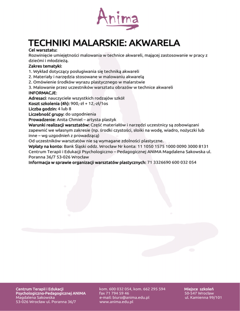 TECHNIKI MALARSKIE: AKWARELA Cel warsztatu: Rozwinięcie umiejętności malowania w technice akwareli, mającej zastosowanie w pracy z dziećmi i młodzieżą. Zakres tematyki: 1. Wykład dotyczący posługiwania się techniką akwareli 2. Materiały i narzędzia stosowane w malowaniu akwarelą 2. Omówienie środków wyrazu plastycznego w malarstwie 3. Malowanie przez uczestników warsztatu obrazów w technice akwareli INFORMACJE: Adresaci: nauczyciele wszystkich rodzajów szkół Koszt szkolenia (4h): 900,-zł + 12,-zł/1os Liczba godzin: 4 lub 8 Liczebność grupy: do uzgodnienia Prowadzenie: Anita Chmiel – artysta plastyk Warunki realizacji warsztatów: Część materiałów i narzędzi uczestnicy są zobowiązani zapewnić we własnym zakresie (np. środki czystości, słoiki na wodę, wiadro, nożyczki lub inne – wg uzgodnień z prowadzącą) Od uczestników warsztatów nie są wymagane zdolności plastyczne. Wpłaty na konto: Bank Śląski oddz. Wrocław Nr konta: 11 1050 1575 1000 0090 3000 8131 Centrum Terapii i Edukacji Psychologiczno – Pedagogicznej ANIMA Magdalena Sakowska ul. Poranna 36/7 53-026 Wrocław Informacja w sprawie organizacji warsztatów plastycznych: 71 3326690 600 032 054 Centrum Terapii i Edukacji Psychologiczno-Pedagogicznej ANIMA Magdalena Sakowska 53-026 Wrocław ul. Poranna 36/7 kom. 600 032 054, kom. 662 295 594 fax 71 794 59 46 e-mail: [email protected] www.anima.edu.pl Miejsce szkoleń 50-547 Wrocław ul. Kamienna 99/101