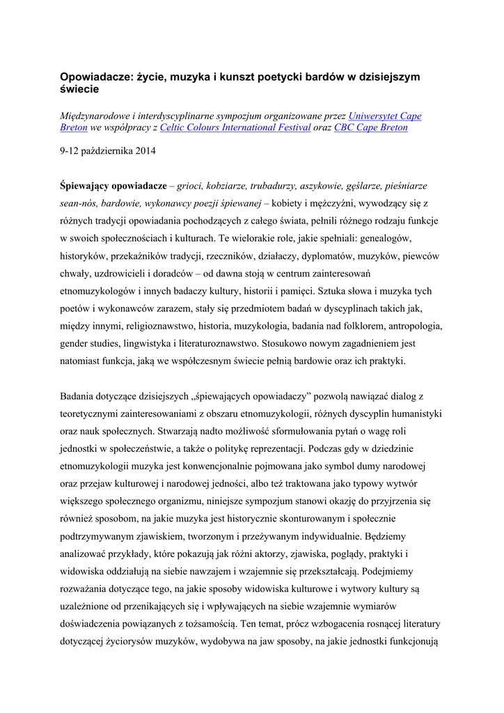 Opowiadacze: życie, muzyka i kunszt poetycki bardów w dzisiejszym świecie Międzynarodowe i interdyscyplinarne sympozjum organizowane przez Uniwersytet Cape Breton we współpracy z Celtic Colours International Festival oraz CBC Cape Breton 9-12 października 2014 Śpiewający opowiadacze – grioci, kobziarze, trubadurzy, aszykowie, gęślarze, pieśniarze sean-nós, bardowie, wykonawcy poezji śpiewanej – kobiety i mężczyźni, wywodzący się z różnych tradycji opowiadania pochodzących z całego świata, pełnili różnego rodzaju funkcje w swoich społecznościach i kulturach. Te wielorakie role, jakie spełniali: genealogów, historyków, przekaźników tradycji, rzeczników, działaczy, dyplomatów, muzyków, piewców chwały, uzdrowicieli i doradców – od dawna stoją w centrum zainteresowań etnomuzykologów i innych badaczy kultury, historii i pamięci. Sztuka słowa i muzyka tych poetów i wykonawców zarazem, stały się przedmiotem badań w dyscyplinach takich jak, między innymi, religioznawstwo, historia, muzykologia, badania nad folklorem, antropologia, gender studies, lingwistyka i literaturoznawstwo. Stosukowo nowym zagadnieniem jest natomiast funkcja, jaką we współczesnym świecie pełnią bardowie oraz ich praktyki. Badania dotyczące dzisiejszych „śpiewających opowiadaczy” pozwolą nawiązać dialog z teoretycznymi zainteresowaniami z obszaru etnomuzykologii, różnych dyscyplin humanistyki oraz nauk społecznych. Stwarzają nadto możliwość sformułowania pytań o wagę roli jednostki w społeczeństwie, a także o politykę reprezentacji. Podczas gdy w dziedzinie etnomuzykologii muzyka jest konwencjonalnie pojmowana jako symbol dumy narodowej oraz przejaw kulturowej i narodowej jedności, albo też traktowana jako typowy wytwór większego społecznego organizmu, niniejsze sympozjum stanowi okazję do przyjrzenia się również sposobom, na jakie muzyka jest historycznie skonturowanym i społecznie podtrzymywanym zjawiskiem, tworzonym i przeżywanym indywidualnie. Będziemy analizować przykłady, które pokazują jak różni aktorzy, zjawiska, poglądy, praktyki i widowiska oddziałują na siebie nawzajem i wzajemnie się przekształcają. Podejmiemy rozważania dotyczące tego, na jakie sposoby widowiska kulturowe i wytwory kultury są uzależnione od przenikających się i wpływających na siebie wzajemnie wymiarów doświadczenia powiązanych z tożsamością. Ten temat, prócz wzbogacenia rosnącej literatury dotyczącej życiorysów muzyków, wydobywa na jaw sposoby, na jakie jednostki funkcjonują w sieciach kultury, wzdłuż których się przemieszczają – ukazując wspólne praktyki i zbiory poglądów w poszczególnych miejscach i pomiędzy nimi. Różne aspekty tożsamości i doświadczenia są kształtowane w kontekście szerszych zmian historycznych, społecznych i kulturowych napięć, które „śpiewający opowiadacze” nierzadko zręcznie negocjują. „Śpiewający opowiadacze” stanowić mogą asumpt do podjęcia naukowej refleksji zdolnej wydobyć wieloznaczność, w której doświadczenia i tożsamości są tworzone i odgrywane, poprzez życie, muzykę i kunszt jednostek. Zaproszenie do udziału w sympozjum Do udziału w wydarzeniu zapraszamy chętnych reprezentujących różne dziedziny wiedzy, badaczy, wykonawców i artystów. Chcemy zachęcić do zaangażowania w badania i działania artystyczne poprzez różnorodne sposoby uprawiania, tworzenia i dzielenia się wiedzą. Zapraszamy do nadsyłania zgłoszeń wystąpień w następujących formach: referaty (indywidualne referaty 20 minut + 10 minutowa dyskusja lub dyskuje panelowe), wystąpienia plenarne, warsztaty, wystąpienia artystyczne, okrągły stół, film, wystawa (w tym wystawy fotografii lub innych materiałów wizualnych, instalacji multimedialnych lub interaktywnych). • czas trwania warsztatów: 60 albo 90 minut • okrągłe stoły będą się odbywały równolegle przez cały czas trwania konferencji • do dyspozycji prelegentów będzie teatr oraz przestrzeń wystawiennicza *** Artykuły, które pomyślnie przejdą proces recenzyjny, zostaną opublikowane w zbiorze pokonferencyjnym. Zgłoszenia referatów i pozostałych wydarzeń MUSZĄ zawierać: • Tytuł wystąpienia; w przypadku propozycji paneli prosimy o podanie tytułu panelu oraz tytułów poszczególnych referatów • Informację o formie wystąpienia • Wymagania dotyczące sprzętu • Abstrakt referatu (liczący maksymalnie 300 słów) • Abstrakt referatu (liczący 100-150 słów) • Do zgłoszeń propozycji dyskusji panelowych należy dołączyć opis panelu (liczący 100-200 słów) • CV każdego z referentów (1 strona) • Informację o afiliacji każdego z referentów, łącznie z nazwą wydziału lub katedry (lub wskazanie, że jest się niezależnym badaczem lub artystą) • Kompletne dane kontaktowe: adres korespondencyjny wraz z kodem pocztowym, adres elektroniczny oraz numer kontaktowy. WSZYSTKIE ZGŁOSZENIA POWINNY ZAWIERAĆ POWYŻSZE INFORMACJE ODNOŚNIE DO KAŻDEGO Z UCZESTNIKÓW. Zgłoszenia niekompletne nie będą rozpatrywane. Wymagane informacje i materiały posłużą organizatorom konferencji do ubiegania się o granty wyjazdowe i dofinansowanie wydarzenia. ZGŁOSZENIA PROSIMY NADSYŁAĆ na adres [email protected] do dnia 15. marca 2014. W tytule maila prosimy wpisać: Singing Storytellers proposal – [podać nazwisko]. ZAŁĄCZNIKI PROSIMY PRZESYŁAĆ W FORMACIE .doc. Pytania prosimy kierować pod adresem [email protected]. Informacje o konferencji dostępne są na STRONIE. (www.singingstorytellers.ca) Czekamy na Państwa zgłoszenia i zapraszamy do Cape Breton!