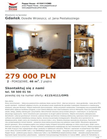 Pepper House - 4115/4111/OMS przez Pepper House - www.pepperhouse.pl www.pepperhouse.pl/hot-oferty Mieszkanie na Sprzedaż Gdańsk, Osiedle Wrzeszcz, ul. Jana Pestalozziego 279 000 PLN 2 - POKOJOWE, 46 m2, 2 piętro Skontaktuj się z nami tel. 58 500 01 56 powołaj się na numer oferty: 4115/4111/OMS Opis oferty: Atuty nieruchomości: - faktyczna powierzchnia użytkowa lokalu wynosi 54m2 - lokal po remoncie - duża garderoba - nowe okna PCV, wysoki standard - możliwość adaptacji strychu, po akceptacji przez wspólnotę Na sprzedaż 2-pokojowe mieszkanie w rewelacyjnej lokalizacji, jaką jest Wrzeszcz. Miejsce doskonale skomunikowane - blisko przystanki autobusowe i tramwajowe oraz przystanek SKM. Wokół pełne zaplecze handlowo-usługowe, w tym Galeria Bałtycka oraz nowo budowane centrum Metropolia. Poza tym przedszkole, szkoła, sklepy, obiekty rekreacyjne i przychodnia. Nieruchomość otoczona siecią ścieżek pieszych i rowerowych, co zachęca do aktywnego wypoczynku. Samo mieszkanie jest usytuowane na drugim piętrze kamienicy. Wejście do budynku zabezpieczone domofonem. Lokal po gruntownym remoncie, podczas którego wymieniono instalację elektryczną, wykonano nowe tynki ścienne i sufitowe oraz położono dodatkową izolację cieplną i akustyczną pomiędzy kondygnacjami. Wszystkie okna wymienione na dźwiękoszczelne, dzięki czemu do mieszkania nie dociera hałas z ulicy. Stolarka drzwiowa wewnętrzna drewniana. Pod koniec 2015 roku przeprowadzono remont łazienki - wstawiono dużą kabinę prysznicową oraz położono nowe kafelki. Mieszkanie ogrzewane piecem gazowym. Okna energooszczędne oraz izolacja między stropami korzystnie wpływają na niskie zużycie gazu, dzięki czemu lokal jest oszczędny w utrzymaniu. Istnieje możliwość zaadaptowania znajdującego się nad mieszkaniem strychu. Idealna propozycja dla osób chcących mieć najważniejsze usługi i produkty w najbliższym otoczeniu. Polecam i zapraszam na prezentację! Alan Balla, numer oferty 4115/4111/OMS Tylko u nas GWARANCJA najniższej ceny dzięki: - okazyjnej cenie nieruchomości - usługom finansowym Pepper House - preferencyjnej stawce u Notariusza Tylko u nas GWARANCJA bezpieczeństwa dzięki: - obsłudze prawnej Kancelarii Koprowski Gąsior Gierzyńska Ludwichowska - nadzorowi licencjonowanego Pośrednika (nr licencji 6884) - polisie OC Pośrednika na 1/2 Pepper House - 4115/4111/OMS przez Pepper House - www.pepperhouse.pl www.pepperhouse.pl/hot-oferty kwotę 1 000 000 PLN w PZU SA - ubezpieczeniu kupowanej nieruchomości (szczegóły na naszej stronie). Więcej zdjęć, zdjęcia w dużym formacie, rzuty, filmy i dodatkowe informacje: www.pepperhouse.pl Wejdź już dziś i wyślij zapytanie bezpośrednio do opiekuna oferty. 2/2 Powered by TCPDF (www.tcpdf.org)