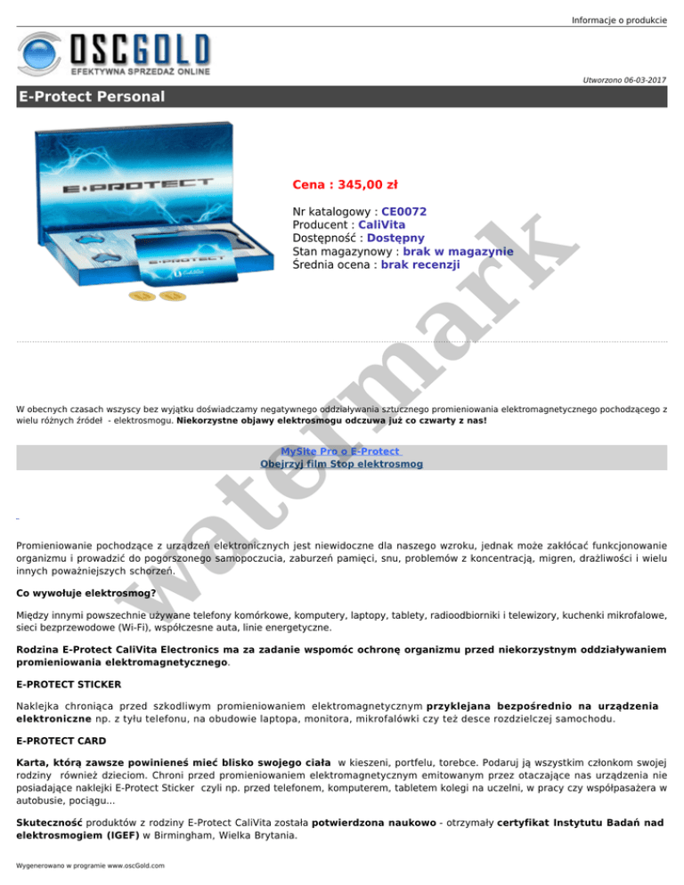 Informacje o produkcie Utworzono 06-03-2017 E-Protect Personal Cena : 345,00 zł er m ar k Nr katalogowy : CE0072 Producent : CaliVita Dostępność : Dostępny Stan magazynowy : brak w magazynie Średnia ocena : brak recenzji W obecnych czasach wszyscy bez wyjątku doświadczamy negatywnego oddziaływania sztucznego promieniowania elektromagnetycznego pochodzącego z wielu różnych źródeł - elektrosmogu. Niekorzystne objawy elektrosmogu odczuwa już co czwarty z nas! at MySite Pro o E-Protect Obejrzyj film Stop elektrosmog w Promieniowanie pochodzące z urządzeń elektronicznych jest niewidoczne dla naszego wzroku, jednak może zakłócać funkcjonowanie organizmu i prowadzić do pogorszonego samopoczucia, zaburzeń pamięci, snu, problemów z koncentracją, migren, drażliwości i wielu innych poważniejszych schorzeń. Co wywołuje elektrosmog? Między innymi powszechnie używane telefony komórkowe, komputery, laptopy, tablety, radioodbiorniki i telewizory, kuchenki mikrofalowe, sieci bezprzewodowe (Wi-Fi), współczesne auta, linie energetyczne. Rodzina E-Protect CaliVita Electronics ma za zadanie wspomóc ochronę organizmu przed niekorzystnym oddziaływaniem promieniowania elektromagnetycznego. E-PROTECT STICKER Naklejka chroniąca przed szkodliwym promieniowaniem elektromagnetycznym przyklejana bezpośrednio na urządzenia elektroniczne np. z tyłu telefonu, na obudowie laptopa, monitora, mikrofalówki czy też desce rozdzielczej samochodu. E-PROTECT CARD Karta, którą zawsze powinieneś mieć blisko swojego ciała w kieszeni, portfelu, torebce. Podaruj ją wszystkim członkom swojej rodziny również dzieciom. Chroni przed promieniowaniem elektromagnetycznym emitowanym przez otaczające nas urządzenia nie posiadające naklejki E-Protect Sticker czyli np. przed telefonem, komputerem, tabletem kolegi na uczelni, w pracy czy współpasażera w autobusie, pociągu... Skuteczność produktów z rodziny E-Protect CaliVita została potwierdzona naukowo - otrzymały certyfikat Instytutu Badań nad elektrosmogiem (IGEF) w Birmingham, Wielka Brytania. Wygenerowano w programie www.oscGold.com Instrukcja obsługi: oderwij ostrożnie folię ochronną z opakowania i przyklej ją z tyłu telefonu. Nie przycinaj jej! W podobny sposób można ją przykleić do innych urządzeń lub w samochodzie. W przypadku kuchenek mikrofalowych folię ochronną zawsze należy przyklejać na zewnętrznej obudowie. Nieużywaną folię ochronną należy przechowywać w miejscu niedostępnym dla dzieci w at er m ar k Pakiet E-Protect Personal zawiera 1 szt. E-PROTECT CARD, 2 szt. E-PROTECT STICKER