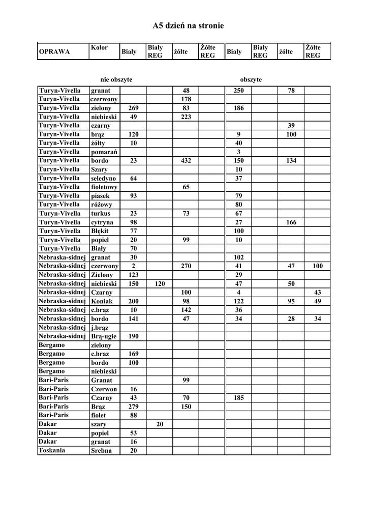 A5 dzień na stronie OPRAWA Kolor Biały Biały REG żółte nie obszyte Turyn-Vivella Turyn-Vivella Turyn-Vivella Turyn-Vivella Turyn-Vivella Turyn-Vivella Turyn-Vivella Turyn-Vivella Turyn-Vivella Turyn-Vivella Turyn-Vivella Turyn-Vivella Turyn-Vivella Turyn-Vivella Turyn-Vivella Turyn-Vivella Turyn-Vivella Turyn-Vivella Turyn-Vivella Nebraska-sidnej Nebraska-sidnej Nebraska-sidnej Nebraska-sidnej Nebraska-sidnej Nebraska-sidnej Nebraska-sidnej Nebraska-sidnej Nebraska-sidnej Nebraska-sidnej Bergamo Bergamo Bergamo Bergamo Bari-Paris Bari-Paris Bari-Paris Bari-Paris Bari-Paris Dakar Dakar Dakar Toskania granat czerwony zielony niebieski czarny brąz żółty pomarań bordo Szary seledyno fioletowy piasek różowy turkus cytryna Błękit popiel Biały granat czerwony Zielony niebieski Czarny Koniak c.brąz bordo j.brąz Brą-ugie zielony c.braz bordo niebieski Granat Czerwon Czarny Brąz fiolet szary popiel granat Srebna Żółte REG Biały Biały REG żółte Żółte REG obszyte 48 178 83 223 269 49 120 10 23 432 64 250 78 186 9 40 3 150 10 37 39 100 134 65 93 23 98 77 20 70 30 2 123 150 73 99 270 120 100 98 142 47 200 10 141 79 80 67 27 100 10 102 41 29 47 4 122 36 34 190 169 100 99 16 43 279 88 70 150 20 53 16 20 185 166 47 100 50 95 43 49 28 34