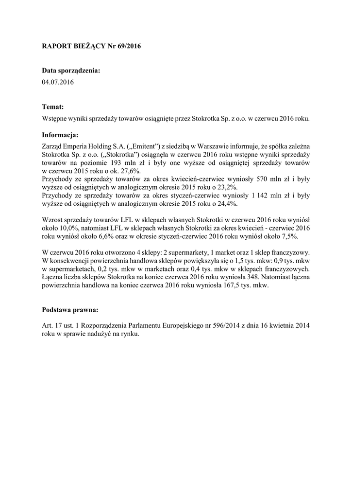RAPORT BIEŻĄCY Nr 69/2016 Data sporządzenia: 04.07.2016 Temat: Wstępne wyniki sprzedaży towarów osiągnięte przez Stokrotka Sp. z o.o. w czerwcu 2016 roku. Informacja: Zarząd Emperia Holding S.A. („Emitent”) z siedzibą w Warszawie informuje, że spółka zależna Stokrotka Sp. z o.o. („Stokrotka”) osiągnęła w czerwcu 2016 roku wstępne wyniki sprzedaży towarów na poziomie 193 mln zł i były one wyższe od osiągniętej sprzedaży towarów w czerwcu 2015 roku o ok. 27,6%. Przychody ze sprzedaży towarów za okres kwiecień-czerwiec wyniosły 570 mln zł i były wyższe od osiągniętych w analogicznym okresie 2015 roku o 23,2%. Przychody ze sprzedaży towarów za okres styczeń-czerwiec wyniosły 1 142 mln zł i były wyższe od osiągniętych w analogicznym okresie 2015 roku o 24,4%. Wzrost sprzedaży towarów LFL w sklepach własnych Stokrotki w czerwcu 2016 roku wyniósł około 10,0%, natomiast LFL w sklepach własnych Stokrotki za okres kwiecień - czerwiec 2016 roku wyniósł około 6,6% oraz w okresie styczeń-czerwiec 2016 roku wyniósł około 7,5%. W czerwcu 2016 roku otworzono 4 sklepy: 2 supermarkety, 1 market oraz 1 sklep franczyzowy. W konsekwencji powierzchnia handlowa sklepów powiększyła się o 1,5 tys. mkw: 0,9 tys. mkw w supermarketach, 0,2 tys. mkw w marketach oraz 0,4 tys. mkw w sklepach franczyzowych. Łączna liczba sklepów Stokrotka na koniec czerwca 2016 roku wyniosła 348. Natomiast łączna powierzchnia handlowa na koniec czerwca 2016 roku wyniosła 167,5 tys. mkw. Podstawa prawna: Art. 17 ust. 1 Rozporządzenia Parlamentu Europejskiego nr 596/2014 z dnia 16 kwietnia 2014 roku w sprawie nadużyć na rynku.