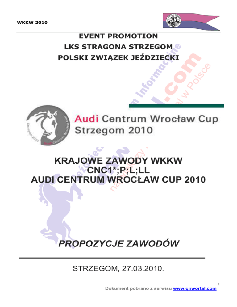 WKKW 2010 EVENT PROMOTION LKS STRAGONA STRZEGOM POLSKI ZWIĄZEK JEŹDZIECKI KRAJOWE ZAWODY WKKW CNC1*;P;L;LL AUDI CENTRUM WROCŁAW CUP 2010 PROPOZYCJE ZAWODÓW STRZEGOM, 27.03.2010. 1 Dokument pobrano z serwisu www.qnwortal.com WKKW 2010 ZAWODY (kategoria): CNC1*/P/L/LL (Miejsce): STRZEGOM Data: 27.03.2010 Informacje podstawowe Zawody zostaną rozegrane zgodnie z: Statutem Polskiego Związku Jeździeckiego Regulaminem rozgrywania zawodów krajowych w WKKW Polskiego Związku Jeździeckiego Przepisami weterynaryjnymi Polskiego Związku Jeździeckiego FEI Rules for Eventing, 1st January 2010 Przepisami antydopingowymi Polskiego Związku Jeździeckiego Regulaminem rozgrywania zawodów z cyklu Audi Centrum Wrocław CUP Strzegom 2010 Zatwierdzono w PZJ Warszawa dnia 15 lutego 2010r. Podpis: Przewodniczący Komisji WKKW Marcin Konarski 2 Dokument pobrano z serwisu www.qnwortal.com WKKW 2010 I. Sprawy Organizacyjne 1. TYP Zawodów Klasy: CNC 3* CNC/3* CNC/2* CNC/1* CNC/ P CNC/ L CNC/ LL PUCHAR POLSKI: ZAWODY KWALIFIKACYJNE MISTRZOSTWA POLSKI Kategoria: Seniorzy Data: 27.03.2010 Miejsce : Morawa/k.Strzegomia Region : dolnośląskie FINAŁ MISTRZOSTWA REGIONALNE Młodzi Jeźdźcy Juniorzy Pony 2. Organizator (kompletny adres) Nazwa: LKS Stragona Strzegom Adres: Morawa 36 Kod pocztowy: 58-150 Strzegom Telefon: 0748554042 Email : [email protected] Internet: www.stragona.strzegom.pl Fax : 0748554042 3. Komitet Organizacyjny Przewodniczący: Marcin Konarski Dyrektor Zawodów: Marcin Konarski Biuro Zawodów: Marta Wójcik Rzecznik Prasowy: Marta Wójcik Dyrektor Techniczny: Leszek Wójcik Szef Stajni: Katarzyna Olech 4. Dane kontaktowe na miejscu zawodów: Adres: Morawa 36 Tel.: 748554042 Telefon kom.: 601769772 3 Dokument pobrano z serwisu www.qnwortal.com WKKW 2010 II. Osoby oficjalne (zgodnie z załącznikiem nr.1 do Regulaminu WKKW 2010) 1. Komisja sędziowska (imię , nazwisko, klasa, próba) KLASA LL Lp. Imię Nazwisko Funkcja Próba 1. Izabela Bek- Kaczkowska Przewodniczący KS A, B, C 2. Marek Pawłowicz Członek KS A, C 3. Krzysztof Ksztoń Członek KS B,C 4. Anna Augustyńska Asystent KS B,C 5. Magdalena Woźniakiewicz Asystent KS B,C Lp. Imię Nazwisko Funkcja Próba 1. Izabela Bek- Kaczkowska Przewodniczący KS A, B, C 2. Marek Pawłowicz Członek KS A, C 3. Krzysztof Ksztoń Członek KS B, C 4. Anna Augustyńska Asystent KS B, C 5. Magdalena Woźniakiewicz Asystent KS B, C Lp. Imię Nazwisko Funkcja Próba 1. Katarzyna Konarska Przewodniczący KS A, B, C 2. Jerzy Woźniczko Członek KS A, C 3. Krzysztof Ksztoń Członek KS B, C 4. Anna Augustyńska Asystent KS B, C 5. Magdalena Woźniakiewicz Asystent KS B, C Lp. Imię Nazwisko Funkcja Próba 1. Jerzy Woźniczko Przewodniczący KS A, B, C 2. Katarzyna Konarska Członek KS A, C 3. Krzysztof Ksztoń Członek KS B, C 4. Anna Augustyńska Asystent KS B, C 5. Magdalena Woźniakiewicz Asystent KS B, C KLASA L KLASA P KLASA 1* 4 Dokument pobrano z serwisu www.qnwortal.com WKKW 2010 2. Delegat Techniczny 1. Delegat Techniczny Imię Nazwisko: Tomasz Kowala Email: [email protected] 2. Asystent Delegata Technicznego Imię Nazwisko: 3. Gospodarz Toru – próba terenowa Imię Nazwisko: Marcin Konarski Email: Asystent Gospodarza Toru – próba terenowa Imię Nazwisko: 4. Gospodarz Toru – próba skoków 5. Imię Nazwisko: Marcin Konarski Email: [email protected] Komisarze Imię Nazwisko: 6. Jerzy Denisyjew Delegat Weterynaryjny PZJ Imię Nazwisko: Janusz Okoński 7. Lekarz weterynarii Zawodów Imię Nazwisko: Janusz Okoński Email: [email protected] Adres: Warszawa Tel. : 602 101 283 Fax : 74 855 40 42 8. Lekarz medycyny zawodów Imię Nazwisko: 9. Kowal Imię Nazwisko: Mieczysław Kryszczyński 5 Dokument pobrano z serwisu www.qnwortal.com WKKW 2010 III. 1. Warunki Techniczne Program zawodów Otwarte trasy krosu szy 1 Przegląd Koni szy 1 Start Ujeżdzenie 1szy Start kros 3szy Przegląd Koni 1szy Start Skoki Wręczanie nagród 2. KLASA LL Data/ Godz. 26.03/ 15.00 KLASA L Data/ Godz. 26.03/ 15.00 KLASA P Data/ Godz. 26.03/ 15.00 KLASA 1* Data/ Godz. 26.03/ 15.00 27.03/ 09.00 27.03/ 17.30 27.03/ 10.30 27.03/ 16.40 27.03/ 09.00 27.03/ 16.00 27.03/ 11.30 27.03/ 15.30 27.03/ 09.30 27.03/ 18.00 27.03/ 11.00 27.03/ 18.00 27.03/ 09.30 27.03/ 18.00 27.03/ 12.00 27.03/ 18.00 KLASA Data/ Godz. 26.03/ 15.00 Ujeżdżenie CNC LL – zgodnie z reg. WKKW CNC L – zgodnie z reg. WKKW CNC P – FEI 2009 1*A CNC1* - FEI 2009 1* B 3. PRÓBA TERENOWA (klasy nie rozgrywane należy usunąć ) KLASA LL/ MP JMł. kuce/ PP JMł. kuce/ Mistrzostwa Regionu JMł. kuce odcinek Typ podłoża: Długość : D Trawa , piach 1600/2000 Max: 450m/min 12 - 16 Tempo Ilośc skoków KLASA L/ PP JMł./ Regionalne MJ Mł. 6 Dokument pobrano z serwisu www.qnwortal.com WKKW 2010 Odcinek Typ podłoża: Długość : D Trawa , piach 1600/2500 470-500 m/min 15 - 20 Tempo Ilośc skoków KLASA P/ Regionale MJ odcinek Typ podłoża: Długość : Tempo D Trawa , piach 1600/2800 500 - 520 m/min 20 - 25 Ilośc skoków CNC1*/ MP J / PP J/ Regionalne MS/ Regionalne MMJ odcinek Typ podłoża: Długość : Tempo Ilośc skoków D Trawa , piach 2400/3000 520 m/min 24-32 4. SKOKI (klasy nie rozgrywane należy usunąć ) Typ podłoża Dystans (m) Tempo (m/min) Ilośc skoków Ilość przeszkó d IV. KLASA LL KLASA L trawa trawa 250400 300 250450 325 OOM Finał Konie, *kuce 400-500 325 KLASA P CNC1* trawa trawa 300450 325 350-450 CNC2* CNC3* 350 400500 350 450600 375 9 11 11 11 13 14 15 8 8-10 10 10 10 - 10- 11-12 11 11 Nagrody (zgodnie z Przepisami ogólnymi PZJ art. 35 p.1-10, art. 37 p.1-5) 7 Dokument pobrano z serwisu www.qnwortal.com WKKW 2010 Organizator przewiduje nagrody rzeczowe w każdym konkursie za pierwsze pięć miejsc o łącznej wartości około 2000 PLN Flots dla min 50% koni uczestniczących w konkursie W przypadku, gdy liczba startujących jest niewielka, to pomimo innych zapisów w propozycjach, organizator może posłużyć się następującym kluczem: Liczba startujących 1-4 5-8 9 – 12 1