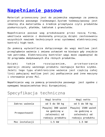 Napełnianie pasowe Materiał przenoszony jest do pojemnika wagowego za pomocą przenośnika pasowego (taśmowego).System taśmowy/pasowy jest idealny dla materiałów o średnim przepływie czyli produktów piekarniczych, płatków, tabletek i granulatów. Napełnianie pasowe wag produkowane przez naszą firmę, umożliwia ważenie z doskonałą precyzją dzięki zastosowaniu wszystkich nowinek technicznych oraz systemowi elektronicznej kontroli high-tech. Za pomocą wyświetlacza dołączonego do wagi możliwe jest przeglądanie ważenia i zmiana ustawień na bieżąco gdy znajdzie tak potrzeba. Elektroniczny kontroler wagi może zapamiętać do 32 programów dedykowanych dla różnych produktów. Dzięki takim rozwiązaniom, przetwarzanie operacji zmiany ważonego produktu następuje bardzo szybko. Jeżeli tego typu elektroniczne ważenie jest częścią całej linii pakującej możliwe jest jej podłączenie pod inne maszyny i sterowanie przez PLC. Napełnianie wag za pomocą przenośnika pasowego wymogami bezpieczeństwa Unii Europejskiej. jest zgodne z Specyfikacja techniczna Wagi brutto Wagi netto Zakres ważenia od 5 do 50 kg od 5 do 50 kg Przepustowość Powyżej 300 ważeń na godzinę w zależności od rodzaju produktu Powyżej 1500 ważeń na godzinę w zależności od rodzaju produktu Moc instalacji 1.5 kW 1.5 kW Konsumpcja skompresowanego powietrza 5 Nl/cykl Wyślij zapytanie produktu Imię i nazwisko (wymagane) Adres email (wymagane) Telefon (wymagane) Treść wiadomości przepisz tekst z obrazka powyżej Wyślij 5 Nl/cykl dotyczące tego