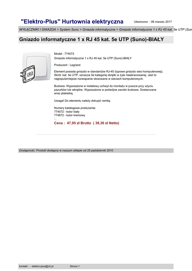 "Elektro-Plus" Hurtownia elektryczna Utworzono : 06 marzec 2017 WYŁĄCZNIKI I GNIAZDA > System Suno > Gniazda informatyczne > Gniazdo informatyczne 1 x RJ 45 kat. 5e UTP (Sun Gniazdo informatyczne 1 x RJ 45 kat. 5e UTP (Suno)-BIAŁY Model : 774072 Gniazdo informatyczne 1 x RJ 45 kat. 5e UTP (Suno)-BIAŁY Producent : Legrand Element posiada gniazdo w standardzie RJ-45 (typowe gniazdo sieci komputerowej). Skrót: kat. 5e UTP, oznacza 5e kategorię skrętki w żyle nieekranowanej. Jest to najpopularniejsze rozwiązanie stosowane w sieciach komputerowych. Budowa: Wyposażone w metalowy uchwyt do montażu w puszce przy użyciu pazurków lub wkrętów. Wyposażone w podwójne zaciski śrubowe. Dostarczane wraz plakietką. Uwaga! Do elementu należy dokupić ramkę. Numery katalogowe producenta: 774072 - kolor biały 774672 - kolor kremowy � Cena : 47,95 zł Brutto ( 39,30 zł Netto) Dostępność: Produkt dostępny w naszym sklepie od 25 październik 2010 kontakt : - [email protected] Strona 1