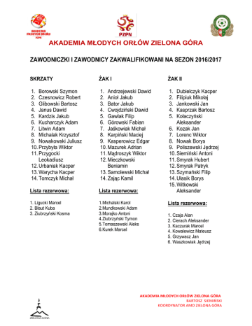 AKADEMIA MŁODYCH ORŁÓW ZIELONA GÓRA ZAWODNICZKI I ZAWODNICY ZAKWALIFIKOWANI NA SEZON 2016/2017 SKRZATY ŻAK I ŻAK II 1. Borowski Szymon 2. Czesnowicz Robert 3. Glibowski Bartosz 4. Janus Dawid 5. Kardzis Jakub 6. Kucharczyk Adam 7. Litwin Adam 8. Michalak Krzysztof 9. Nowakowski Juliusz 10. Przybyła Wiktor 11. Przygocki Leokadiusz 12. Urbaniak Kacper 13. Warycha Kacper 14. Tomczyk Michał 1. Andrzejewski Dawid 2. Anioł Jakub 3. Bator Jakub 4. Cwojdziński Dawid 5. Gawlak Filip 6. Górowski Fabian 7. Jaśkowiak Michał 8. Karpiński Maciej 9. Kasperowicz Edgar 10. Mazurek Adrian 11. Mądroszyk Wiktor 12. Mieczkowski Beniamin 13. Samolewski Michał 14. Zając Kamil 1. 2. 3. 4. 5. Lista rezerwowa: Lista rezerwowa: 1. Ligucki Marcel 2. Błaut Kuba 3. Ziubrzyński Kosma 1.Michalski Karol 2.Mundkowski Adam 3.Morajko Antoni 4.Ziubrzyński Tymon 5.Tomaszewski Aleks 6.Kurek Marcel Dubielczyk Kacper Filipiuk Mikołaj Jankowski Jan Kasprzak Bartosz Kołaczyński Aleksander 6. Kozak Jan 7. Lorenc Wiktor 8. Nowak Borys 9. Poliszewski Jędrzej 10. Siemiński Antoni 11. Smyrak Hubert 12. Smyrak Patryk 13. Szymański Filip 14. Ułasik Borys 15. Witkowski Aleksander Lista rezerwowa: 1. Czaja Alan 2. Cierach Aleksander 3. Kaczurak Marcel 4. Kowalewicz Mateusz 5. Grzywacz Jan 6. Waszkowiak Jędrzej AKADEMIA MŁODYCH ORŁÓW ZIELONA GÓRA BARTOSZ SIEMIŃSKI KOORDYNATOR AMO ZIELONA GÓRA AKADEMIA MŁODYCH ORŁÓW ZIELONA GÓRA ORLIK I 1. Bartoszewicz Mikołaj 2. Chojnacki Jakub 3. Chryniewicz Bartłomiej 4. Duczmal Mateusz 5. Gregorski Dominik 6. Kopernicki Szymon 7. Kusiak Aron 8. Lehman Kajetan 9. Ławrynowicz Igor 10. Olkiewicz Michał 11. Patryk Stolarek 12. Pawłowski Aleksander 13. Róg Patryk 14. Ryszczuk Oskar 15. Topór Nataniel 16. Tumala Łukasz ORLIK II 1.Arczewski Jakub 2.Dwornicki Hubert 3.Gawlak Kornelia 4.Iwanowski Maksymilian 5.Józefowicz Kacper 6.Kiałka Gabriela 7.Koryciński Oliwier 8.Ligucki Hubert 9.Mieczkowski Oliwier 10.Najder Michał 11.Obrał Marcin 12.Pilonis Tymon 13.Radomski Piotr 14.Szostak Maciej 15.Zarzycki Miłosz 16.Zasada Emil Lista rezerwowa: Lista rezerwowa: 1. Kowalczyk Miłosz 2. Wolinowski Alex 3. Tswigun Anton 4. Stępczyński Kacper 5. Kifert Aleksander 6.Gąsiewski Maksymilian 1. Popławski Oskar 2. Siciński Oliwier 3.Tworzydło Krystian 4.Cierach Jakub 5.Szymoniak Gracjan 6.Warzywoda Bartosz AKADEMIA MŁODYCH ORŁÓW ZIELONA GÓRA BARTOSZ SIEMIŃSKI KOORDYNATOR AMO ZIELONA GÓRA AKADEMIA MŁODYCH ORŁÓW ZIELONA GÓRA UWAGA!!! SZANOWNI RODZICE PROSZĘ POBRAĆ 4 FORMULARZE (1.Formularz Rejestracyjny AMO, 2.Informacja o stanie zdrowia, 3.Informacje o osobie odbierającej dziecko, 4.Oświadczenie rodzica o wizerunek AMO) ZE STRONY www.laczynaspilka.pl, WYPEŁNIĆ ODPOWIEDNIE RUBRYKI I PODPISAĆ. SKANY TYCH DOKUMENTÓW PROSZĘ PRZESŁAĆ DO DNIA 10.08.2016r. NA ADRES E-MAIL [email protected]. NATOMIAST ORYGINAŁY PROSZĘ DOSTARCZYĆ WE WRZEŚNIU DO TRENERA KOORDYNATORA NA PIERWSZE ZAJĘCIA. AKADEMIA MŁODYCH ORŁÓW ZIELONA GÓRA BARTOSZ SIEMIŃSKI KOORDYNATOR AMO ZIELONA GÓRA