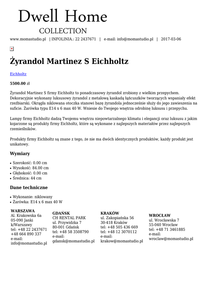 www.momastudio.pl | INFOLINIA.: 22 2437671 | e-mail: [email protected] | 2017-03-06 Żyrandol Martinez S Eichholtz Eichholtz 5500.00 zł Żyrandol Martinez S firmy Eichholtz to ponadczasowy żyrandol zrobiony z wielkim przepychem. Dekoracyjnie wykonany luksusowy żyrandol z metalową kaskadą łąńcuszków tworzących wspaniały efekt rzeźbiarski. Okrągła niklowana otoczka stanowi bazę żyrandola jednocześnie służy do jego zawieszenia na suficie. Żarówka typu E14 x 6 max 40 W. Wniesie do Twojego wnętrza odrobinę luksusu i przepychu. Lampy firmy Eichholtz dadzą Twojemu wnętrzu niepowtarzalnego klimatu i elegancji oraz luksusu z jakim kojarzone są produkty firmy Eichholtz, które są wykonane z najlepszych materiałów przez najlepszych rzemieślników. Produkty firmy Eichholtz są znane z tego, że nie ma dwóch identycznych produktów, każdy produkt jest unikatowy. Wymiary ● ● ● ● Szerokość: 0.00 cm Wysokość: 84.00 cm Głębokość: 0.00 cm Średnica: 44 cm Dane techniczne ● ● Wykonanie: niklowany Żarówka: E14 x 6 max 40 W WARSZAWA Al. Krakowska 6a 05-090 Janki k/Warszawy tel: +48 22 2437671 +48 664 890 337 e-mail: [email protected] GDAŃSK CH RENTAL PARK ul. Przywidzka 7 80-001 Gdańsk tel: +48 58 3508790 e-mail: [email protected] KRAKÓW ul. Zakopiańska 56 30-418 Kraków tel: +48 505 436 669 tel: +48 12 3070112 e-mail: [email protected] WROCŁAW ul. Wrocławska 7 55-040 Wrocław tel: +48 71 3461885 e-mail: [email protected]