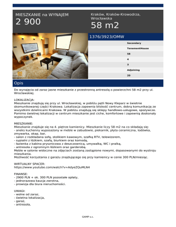 Kraków, Kraków-Krowodrza, Wrocławska MIESZKANIE na WYNAJEM 2 900 58 m2 1376/3923/OMW Secondary TenementHouse 58 4 3 Adjoining 20 Opis Do wynajęcia od zaraz jasne mieszkanie z przestronną antresolą o powierzchni 58 m2 przy ul. Wrocławskiej. LOKALIZACJA: Mieszkanie znajdują się przy ul. Wrocławskiej, w pobliżu pętli Nowy Kleparz w świetnie skomunikowanej części Krakowa. Lokalizacja zapewnia bliskość centrum, dobrą komunikację ze wszystkimi dzielnicami Krakowa. W pobliżu znajdują się sklepy handlowo-usługowe, spożywcze. Pomimo świetnej lokalizacji w centrum mieszkanie jest ciche, komfortowe i zapewnią doskonały wypoczynek. MIESZKANIE: Mieszkanie znajduje się na 4. piętrze kamienicy. Mieszkanie liczy 58 m2 na co składają się: - aneks kuchenny wyposażony w meble w zabudowie, piekarnik, płyta ceramiczna, lodówka, zmywarka, okap, bar, - salon z rozkładana sofą, stolikiem kawowym, szafką RTV, telewizorem, - sypialni z łóżkiem, szafą, biurkiem oraz komodą, - łazienka z kabina prysznicowa z deszczownicą, umywalką, WC i pralką, - antresola z ogromnym łóżkiem oraz garderobą. Meble w salonie widoczne na zdjęciach zostaną zastąpione nowymi, dopasowanymi do wystroju mieszkania. Możliwość korzystania z garażu znajdującego się przy kamienicy w cenie 300 PLN/miesiąc. WIRTUALNY SPACER: https://www.youtube.com/watch?v=AdyeZQuMLN4 FINANSE: - 2900 PLN + ok. 300 PLN pozostałe opłaty, - jednorazowa kaucja zwrotna, - prowizja dla biura nieruchomości. UWAGI: - wolne od zaraz, - świetna lokalizacja, - garaż, - antresola, GAMP s.c. - ogrzewanie oraz ciepła woda z nowoczesnego pieca dwufunkcyjnego. For rent from now bright apartment with a spacious mezzanine with area of 58 sqm at Wrocławska Street. LOCATION: The apartment is located at Wroclawska Street near Nowy Kleparz in well-connected areas in Krakow. The location provides proximity to the center, good communication with all parts of Krakow. Nearby are shops, restaurants, gyms, etc. Despite the great location in the center of the apartment is quiet, comfortable and provide perfect rest. FLAT: The apartment is located on the 4th floor of the building. The apartment has 58 sqm and consists of: - kitchenette equipped with furniture in the building, oven, ceramic hob, refrigerator, dishwasher, range hood, bar, - living room with sofa bed, coffee table, TV cabinet, TV, - bedroom with a bed, a wardrobe, desk and chest of drawers, - bathroom with shower with rain shower, sink, toilet and washing machine, - mezzanine with a huge bed and a wardrobe. The furniture in the living room shown in the pictures will be replaced with new, matching the decor of the apartment. The ability to use the garage located near the building. WIRTUAL WALK: https://www.youtube.com/watch?v=AdyeZQuMLN4 FINANCES: - 3000 PLN + 300 PLN other charges in total, - one-time refundable deposit, - commission for real estate agency. COMMENTS: - free from now, - great location, - garage, - mezzanine, - heating and hot water from a modern double-function stove. Serdecznie polecam! Bardzo proszę o kontakt – na pewno znajdziemy idealne mieszkanie, spełniające Państwa preferencje. Zachęcamy również do odwiedzenia naszej strony internetowej: www.gamp-krakow.pl KONTAKT DO AGENTA: Karol Piwoński +48 533 87 87 80 Email: [email protected] GAMP Nieruchomości. Nowa jakość. Karol Piwoński tel. +48 533 878 780 email: [email protected] GAMP s.c. GAMP s.c. Powered by TCPDF (www.tcpdf.org)
