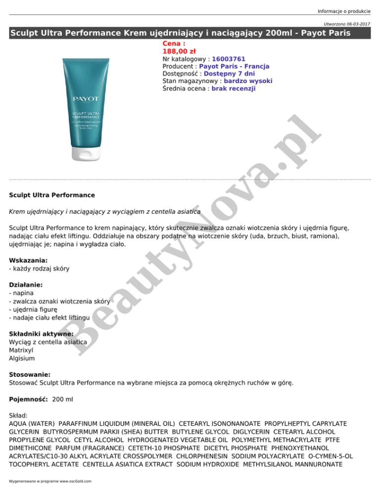 Informacje o produkcie Utworzono 06-03-2017 Sculpt Ultra Performance Krem ujędrniający i naciągający 200ml - Payot Paris Cena : 188,00 zł ov a. pl Nr katalogowy : 16003761 Producent : Payot Paris - Francja Dostępność : Dostępny 7 dni Stan magazynowy : bardzo wysoki Średnia ocena : brak recenzji Sculpt Ultra Performance Krem ujędrniający i naciągający z wyciągiem z centella asiatica ut Wskazania: - każdy rodzaj skóry yN Sculpt Ultra Performance to krem napinający, który skutecznie zwalcza oznaki wiotczenia skóry i ujędrnia figurę, nadając ciału efekt liftingu. Oddziałuje na obszary podatne na wiotczenie skóry (uda, brzuch, biust, ramiona), ujędrniając je; napina i wygładza ciało. ea Działanie: - napina - zwalcza oznaki wiotczenia skóry - ujędrnia figurę - nadaje ciału efekt liftingu B Składniki aktywne: Wyciąg z centella asiatica Matrixyl Algisium Stosowanie: Stosować Sculpt Ultra Performance na wybrane miejsca za pomocą okrężnych ruchów w górę. Pojemność: 200 ml Skład: AQUA (WATER) PARAFFINUM LIQUIDUM (MINERAL OIL) CETEARYL ISONONANOATE PROPYLHEPTYL CAPRYLATE GLYCERIN BUTYROSPERMUM PARKII (SHEA) BUTTER BUTYLENE GLYCOL DIGLYCERIN CETEARYL ALCOHOL PROPYLENE GLYCOL CETYL ALCOHOL HYDROGENATED VEGETABLE OIL POLYMETHYL METHACRYLATE PTFE DIMETHICONE PARFUM (FRAGRANCE) CETETH-10 PHOSPHATE DICETYL PHOSPHATE PHENOXYETHANOL ACRYLATES/C10-30 ALKYL ACRYLATE CROSSPOLYMER CHLORPHENESIN SODIUM POLYACRYLATE O-CYMEN-5-OL TOCOPHERYL ACETATE CENTELLA ASIATICA EXTRACT SODIUM HYDROXIDE METHYLSILANOL MANNURONATE Wygenerowano w programie www.oscGold.com B ea ut yN ov a. pl METHYLSILANOL HYDROXYPROLINE ASPARTATE CARBOMER SODIUM LACTATE POLYSORBATE 20 SODIUM BENZOATE SORBIC ACID BHT PALMITOYL TRIPEPTIDE-1 PALMITOYL TETRAPEPTIDE-7