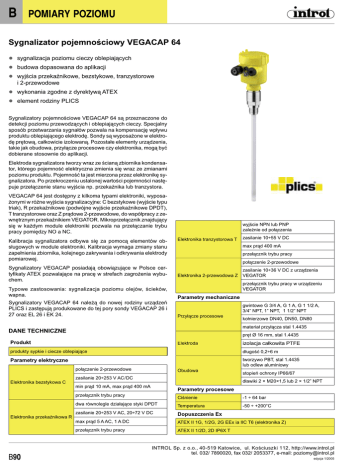 B POMIARY POZIOMU Sygnalizator pojemnościowy VEGACAP 64 ● sygnalizacja poziomu cieczy oblepiających ● budowa dopasowana do aplikacji ● wyjścia przekaźnikowe, bezstykowe, tranzystorowe i 2-przewodowe ● wykonania zgodne z dyrektywą ATEX ● element rodziny PLICS Sygnalizatory pojemnościowe VEGACAP 64 są przeznaczone do detekcji poziomu przewodzących i oblepiających cieczy. Specjalny sposób przetwarzania sygnałów pozwala na kompensację wpływu produktu oblepiającego elektrodę. Sondy są wyposażone w elektrodę prętową, całkowicie izolowaną. Pozostałe elementy urządzenia, takie jak obudowa, przyłącze procesowe czy elektronika, mogą być dobierane stosownie do aplikacji. Elektroda sygnalizatora tworzy wraz ze ścianą zbiornika kondensator, którego pojemność elektryczna zmienia się wraz ze zmianami poziomu produktu. Pojemność ta jest mierzona przez elektronikę sygnalizatora. Po przekroczeniu ustalonej wartości pojemności następuje przełączenie stanu wyjścia np. przekaźnika lub tranzystora. VEGACAP 64 jest dostępny z kilkoma typami elektroniki, wyposażonymi w różne wyjścia sygnalizacyjne: C bezstykowe (wyjście typu triak), R przekaźnikowe (podwójne wyjście przekaźnikowe DPDT), T tranzystorowe oraz Z prądowe 2-przewodowe, do współpracy z zewnętrznym przekaźnikiem VEGATOR. Mikroprzełącznik znajdujący się w każdym module elektroniki pozwala na przełączanie trybu pracy pomiędzy NO a NC. Kalibracja sygnalizatora odbywa się za pomocą elementów obsługowych w module elektroniki. Kalibracja wymaga zmiany stanu zapełnienia zbiornika, kolejnego zakrywania i odkrywania elektrody pomiarowej. Sygnalizatory VEGACAP posiadają obowiązujące w Polsce certyfikaty ATEX pozwalające na pracę w strefach zagrożenia wybuchem. Typowe zastosowania: sygnalizacja poziomu olejów, ścieków, wapna. Sygnalizatory VEGACAP 64 należą do nowej rodziny urządzeń PLICS i zastępują produkowane do tej pory sondy VEGACAP 26 i 27 oraz EL 26 i EK 24. wyjście NPN lub PNP zależnie od połączenia Elektronika tranzystorowa T zasilanie 10÷55 V DC max prąd 400 mA przełącznik trybu pracy połączenie 2-przewodowe zasilanie 10÷36 V DC z urządzenia Elektronika 2-przewodowa Z VEGATOR przełącznik trybu pracy w urządzeniu VEGATOR Parametry mechaniczne gwintowe G 3/4 A, G 1 A, G 1 1/2 A, 3/4” NPT, 1” NPT, 1 1/2” NPT Przyłącze procesowe kołnierzowe DN40, DN50, DN80 materiał przyłącza stal 1.4435 DANE TECHNICZNE pręt Ø 16 mm, stal 1.4435 Produkt Elektroda izolacja całkowita PTFE produkty sypkie i ciecze oblepiające długość 0,2÷6 m Parametry elektryczne tworzywo PBT, stal 1.4435 lub odlew aluminiowy połączenie 2-przewodowe Obudowa zasilanie 20÷253 V AC/DC Elektronika bezstykowa C min prąd 10 mA, max prąd 400 mA Parametry procesowe przełącznik trybu pracy Ciśnienie -1 ÷ 64 bar dwa równolegle działające styki DPDT Temperatura -50 ÷ +200°C zasilanie 20÷253 V AC, 20÷72 V DC Dopuszczenia Ex max prąd 5 A AC, 1 A DC ATEX II 1G, 1/2G, 2G EEx ia IIC T6 (elektronika Z) przełącznik trybu pracy ATEX II 1/2D, 2D IP6X T Elektronika przekaźnikowa R B90 stopień ochrony IP66/67 dławiki 2 × M20×1,5 lub 2 × 1/2” NPT INTROL Sp. z o.o., 40-519 Katowice, ul. Ko ściusz ki 112, http://www.introl.pl tel. 032/ 7890020, fax 032/ 2053377, e-mail: [email protected] edycja 1/2005 B WYMIARY Obudowa G 3/4 A, G 1 A, G 11/2 A ø 40mm (1 37/64") L Obudowa aluminiowa 73mm (2 7/8") 22mm (2 1/4") 56 mm (2 1/4") Obudowa z tworzywa ø16mm (5/8") SCHEMATY POŁĄCZEŃ Elektronika C z wyjściem bezstykowym 1 6 2 6 1 2 3 3 5 5 4 4 Elektronika T z wyjściem tranzystorowym 6 1 2 3 5 4 INTROL Sp. z o.o., 40-519 Katowice, ul. Ko ściusz ki k 112, http://www.introl.pl tel. 032/ 7890020, fax 032/ 2053377, e-mail: [email protected] edycja 1/2005 B91