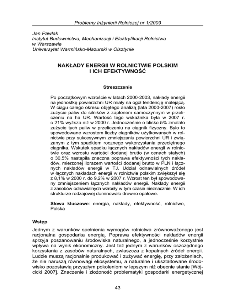 NAKŁADY ENERGII W ROLNICTWIE POLSKIM I ICH EFEKTYWNOŚĆ