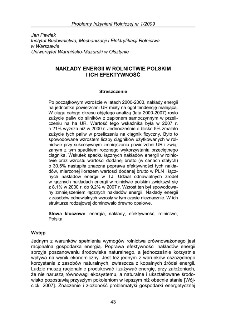 Problemy Inżynierii Rolniczej nr 1/2009 Jan Pawlak Instytut Budownictwa, Mechanizacji i Elektryfikacji Rolnictwa w Warszawie Uniwersytet Warmińsko-Mazurski w Olsztynie NAKŁADY ENERGII W ROLNICTWIE POLSKIM I ICH EFEKTYWNOŚĆ Streszczenie Po początkowym wzroście w latach 2000-2003, nakłady energii na jednostkę powierzchni UR miały na ogół tendencję malejącą. W ciągu całego okresu objętego analizą (lata 2000-2007) rosło zużycie paliw do silników z zapłonem samoczynnym w przeliczeniu na ha UR. Wartość tego wskaźnika była w 2007 r. o 21% wyższa niż w 2000 r. Jednocześnie o blisko 5% zmalało zużycie tych paliw w przeliczeniu na ciągnik fizyczny. Było to spowodowane wzrostem liczby ciągników użytkowanych w rolnictwie przy sukcesywnym zmniejszaniu powierzchni UR i związanym z tym spadkiem rocznego wykorzystania przeciętnego ciągnika. Wskutek spadku łącznych nakładów energii w rolnictwie oraz wzrostu wartości dodanej brutto (w cenach stałych) o 30,5% nastąpiła znaczna poprawa efektywności tych nakładów, mierzonej ilorazem wartości dodanej brutto w PLN i łącznych nakładów energii w TJ. Udział odnawialnych źródeł w łącznych nakładach energii w rolnictwie polskim zwiększył się z 8,1% w 2000 r. do 9,2% w 2007 r. Wzrost ten był spowodowany zmniejszeniem łącznych nakładów energii. Nakłady energii z zasobów odnawialnych wzrosły w tym czasie nieznacznie. W ich strukturze rodzajowej dominowało drewno opałowe. Słowa kluczowe: energia, nakłady, efektywność, rolnictwo, Polska Wstęp Jednym z warunków spełnienia wymogów rolnictwa zrównoważonego jest racjonalna gospodarka energią. Poprawa efektywności nakładów energii sprzyja poszanowaniu środowiska naturalnego, a jednocześnie korzystnie wpływa na wynik ekonomiczny. Jest też jednym z warunków oszczędnego korzystania z zasobów naturalnych, zwłaszcza z kopalnych źródeł energii. Ludzie muszą racjonalnie produkować i zużywać energię, przy założeniach, że nie naruszą równowagi ekosystemu, a naturalne i ukształtowane środowisko pozostawią przyszłym pokoleniom w lepszym niż obecnie stanie [Wójcicki 2007]. Znaczenie i złożoność problematyki gospodarki energetycznej 43 Jan Pawlak powoduje, że istnieje potrzeba bieżącej analizy zachodzących w tym obszarze zmian. Nakłady energii w rolnictwie powinny być rozpatrywane w kontekście zmian powierzchni użytków rolnych (UR), stanu wyposażenia w sprzęt zmotoryzowany oraz wartości produkcji. Celem opracowania jest próba określenia zmian nakładów energii w rolnictwie polskim w odniesieniu do powierzchni UR oraz wartości dodanej brutto, a także zużycia paliw stosowanych w silnikach z zapłonem samoczynnym w przeliczeniu na hektar UR i na jeden ciągnik fizyczny. Realizacja tak sformułowanego celu wiąże się z koniecznością dysponowania porównywalnymi danymi za cały okres objęty analizą. W przypadku danych dotyczących zużycia poszczególnych nośników energii pojawia się poważny problem. Wynika on ze zmian stosowanych przez GUS metod wyznaczania zużycia m.in. energii elektrycznej i lekkiego oleju opałowego w rolnictwie. Zmiany te powodują, że dane z kolejnych lat stają się nieporównywalne. Podejmując się zadania polegającego na ocenie zmian, w czasie, poziomu i efektywności nakładów energii w rolnictwie należy znaleźć rozwiązania umożliwiające zapewnienie porównywalności danych dla całego okresu objętego analizą. Opracowanie propozycji metodycznych w zakresie szacowania porównywalnych wartości zużycia nośników energii jest dodatkowym celem tej pracy. Zakres niniejszej analizy obejmuje lata 2000-2007 i ogranicza się do bezpośrednich nakładów energii. Założenia metodyczne i materiał źródłowy Źródłem informacji wykorzystanych w niniejszej pracy była publikacje Głównego Urzędu Statystycznego oraz dane z prac IBMER [Pawlak 2004, 2005]. W publikacjach [GUS 2002, 2004, 2006, 2008] drewno występuje łącznie z torfem. Fakt, że torf ma głównie zastosowanie nawozowe, natomiast drewno stanowi obecnie główne źródło energii odnawialnej, praktycznie uniemożliwia dostatecznie precyzyjne określenie rzeczywistego zużycia paliw stałych i łącznych nakładów energii, a także oszacowania udziału energii ze źródeł odnawialnych w bezpośrednim zużyciu energii w rolnictwie polskim. Dlatego w niniejszej pracy podane w publikacjach GUS wartości zużycia torfu i drewna w rolnictwie w poszczególnych latach pomniejszono o wartości zużycia torfu, określone na podstawie dokonanych w IBMER szacunków produkcji energii z różnych rodzajów drewna oraz jej zużycia w skali kraju i w rolnictwie [Pawlak 2004]. Podczas weryfikacji zużycia paliw ciekłych przez ciągniki i maszyny samojezdne posłużono się danymi IBMER [Pawlak 2005] o przeciętnym rocznym wykorzystaniu tych maszyn. Liczbę maszyn w sztukach mnożono przez ich średnią moc w kW, a następnie przez liczbę przepracowanych w ciągu roku godzin czasu T07. Uzyskane w ten sposób wartości mnożono następnie przez jednostkowe zużycie paliwa na umowną kWh. 44 Nakłady energii w rolnictwie... Począwszy od 2005 r. GUS zmienił metodę wyznaczania zużycia energii elektrycznej w rolnictwie. Według danych uzyskanych przy zastosowaniu wcześniejszej metody zużycie energii elektrycznej w rolnictwie w 2004 r. wyniosło 14879 TJ, a w 2005 r. (wg nowej metody) – 5400 TJ. W celu ujednolicenia danych za cały okres zużycie w latach 2000-2004 oszacowano przy założeniu, że dynamika zmian tego zużycia w okresie 2004-2005 była podobna jak w okresie 2003-2004 oraz że zmiany wartości danych wyznaczonych wg nowej metody w latach 2000-2004 byłyby proporcjonalne do zmian danych określonych na podstawie metody wcześniejszej. W publikacji GUS [2008] podano wartość zużycia lekkiego oleju opałowego w 2006 r. wynoszącą 13122 TJ, podczas gdy według wcześniej publikowanych danych zuż