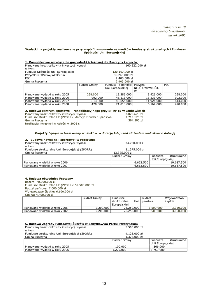 Załącznik nr 10 do uchwały budżetowej na rok 2005 Wydatki na projekty realizowane przy współfinansowaniu ze środków funduszy strukturalnych i Funduszu Spójności Unii Europejskiej 1. Kompleksowe rozwiązanie gospodarki ściekowej dla Pszczyny i sołectw Planowany koszt całkowity inwestycji wynosi 160.222.000 zł w tym: Fundusz Spójności Unii Europejskiej 120.167.000 zł Pożyczki NFOŚiGW/WFOŚiGW 35.249.000 zł PIK 2.403.000 zł Gmina Pszczyna 2.403.000 zł Budżet Gminy Fundusz Spójności Pożyczki PIK Unii Europejskiej NFOŚiGW/WFOŚiG W Planowane wydatki w roku 2005 268.000 13.386.000 3.926.000 Planowane wydatki w roku 2006 902.000 45.113.000 13.233.000 Planowane wydatki w roku 2007 813.000 40.655.000 11.926.000 Planowane wydatki w roku 2008 420.000 21.013.000 6.164.000 268.000 902.000 813.000 420.000 2. Budowa centrum sportowo – rehabilitacyjnego przy SP nr 15 w Jankowicach Planowany koszt całkowity inwestycji wynosi 2.023.670 zł Fundusze strukturalne UE (ZPORR) i dotacja z budżetu państwa 1.719.170 zł Gmina Pszczyna 304.500 zł Realizacja inwestycji w całości w 2005 r. Projekty będące w fazie oceny wniosków o dotację lub przed złożeniem wniosków o dotację: 3. Budowa nowej hali sportowej w Pszczynie Planowany koszt całkowity inwestycji wynosi w tym: Fundusze strukturalne Unii Europejskiej (ZPORR) Gmina Pszczyna 34.700.000 zł 21.375.000 zł 13.325.000 zł Budżet Gminy Fundusze strukturalne Unii Europejskiej 6.662.500 10.687.500 6.662.500 10.687.500 Planowane wydatki w roku 2006 Planowane wydatki w roku 2007 4. Budowa obwodnicy Pszczyny Razem: 70.000.000 zł Fundusze strukturalne UE (ZPORR): 52.500.000 zł Budżet państwa: 7.000.000 zł Województwo śląskie: 6.100.000 zł Gmina: 4.400.000 zł Budżet Gminy Planowane wydatki w roku 2006 Planowane wydatki w roku 2007 Fundusze Budżet Województwo strukturalne Unii państwa śląskie Europejskiej 2.200.000 26.250.000 3.500.000 3.050.000 2.200.000 26.250.000 3.500.000 3.050.000 5. Budowa Zagrody Pokazowej Żubrów w Zabytkowym Parku Pszczyńskim Planowany koszt całkowity inwestycji wynosi 5.500.000 zł w tym: Fundusze strukturalne Unii Europejskiej (ZPORR) 4.125.000 zł Gmina Pszczyna 1.375.000 zł Budżet Gminy Planowane wydatki w roku 2005 Planowane wydatki w roku 2006 100.000 1.275.000 40 Fundusze strukturalne Unii Europejskiej 366.000 3.759.000 6. Projekt „Rewitalizacja pszczyńskiej komunikacyjnego” Planowany koszt całkowity inwestycji wynosi w tym: Fundusze strukturalne Unii Europejskiej (ZPORR)) Gmina Pszczyna Budżet państwa starówki poprawę układu 200.000 165.000 1.725.000 zł 365.000 zł 230.000 zł Fundusze strukturalne Budżet państwa Unii Europejskiej 900.000 120.000 825.000 110.000 7. Projekt „Budowa ośrodka sportów wodnych nad zbiornikiem Łąckim” Planowany koszt całkowity inwestycji wynosi 3.000.000 w tym: Fundusze strukturalne Unii Europejskiej (ZPORR) 2.250.000 Gmina Pszczyna 450.000 Budżet państwa 300.000 Realizacja inwestycji w całości w 2006 r. 8. System Elektronicznej Komunikacji Administracji Publicznej Planowany koszt całkowity inwestycji wynosi w tym: Fundusze strukturalne Unii Europejskiej (ZPORR) Gmina Pszczyna Budżet Gminy Planowane wydatki w roku 2005 Planowane wydatki w roku 2006 funkcjonalności 2.320.000 zł Budżet Gminy Planowane wydatki w roku 2005 Planowane wydatki w roku 2006 poprzez 15.300 17.500 zł zł zł zł 117.100 zł 84.300 zł 32.800 zł Fundusze strukturalne Unii Europejskiej 39.600 44.700 9. Modernizacja elewacji w SP nr 18 - projekt „Szkoła bez azbestu – wykonanie elewacji wraz z dociepleniem budynków Szkoły Podstawowej Nr 18 wraz z salą gimnastyczną”” Planowany koszt całkowity inwestycji wynosi 800.000 zł w tym: Fundusze strukturalne Unii Europejskiej (ZPORR) 600.000 zł Gmina Pszczyna 120.000 zł Budżet państwa 80.000 zł Realizacja inwestycji w całości w 2005 r. 10. Renowacja zabytkowych kamienic w centrum Pszczyny w ramach „Programu Rewitalizacji Miasta Pszczyna”. Planowany koszt całkowity inwestycji wynosi 900.000 zł w tym: Fundusze strukturalne Unii Europejskiej (ZPORR) 675.000 zł Gmina Pszczyna 135.000 zł Budżet państwa 90.000 zł Realizacja inwestycji w całości w 2005 r. Projekty realizowane ze środków Europejskiego Funduszu Orientacji i Gwarancji Rolnej w ramach Sektorowego Programu Operacyjnego Restrukturyzacja i modernizacja sektora żywnościowego oraz rozwój zasobów wiejskich na realizację zadań inwestycyjnych gminy zgłoszone przez rady sołectw: Projekty planowane do realizacji w 2005 r. Lp Tytuł projektu Budżet gminy 11 . 12 . 13 . 14 . 15 . 16 . 17 . 18 . 19 . Budowa parkingu przy ul. Jedności w Studzionce 23.200 Całkowity koszt inwestycji 116.000 Zagospodarowanie placu szkolnego przy SP nr 7 w Ćwiklicach 102.000 510.000 Zagospodarowanie placu szkolnego przy Zespole Szkolno – Przedszkolnym w Studzienicach Remont ośrodka kultury w Czarkowie 90.000 450.000 109.000 545.000 Renowacja zabytkowego kościoła pw. Św. Mikołaja w Łące wraz z budowa parkingu i drogo dojazdowej Konserwacja i renowacja kościoła parafialnego pw. Jakuba Starszego w Wiśle Małej Remont boiska sportowego w Rudołtowicach 100.000 500.000 58.000 290.000 60.000 300.000 Zagospodarowanie terenu przy ul. Słowackiego w Piasku 24.000 120.000 Rozbudowa i modernizacja boiska sportowego w Porębie 50.000 250.000 41 42