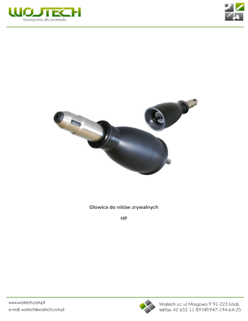Głowica do nitów zrywalnych HP 1. OBSZAR ZASTOSOWANIA Głowica do montażu nitów zrywalnych z dowolnego materiału. Nity aluminiowe średnica [mm] 3,2 4,0 4,8 6,4 7,5 Nity stalowe średnica [mm] 3,2 4,0 4,8 6,4 Nity nierdzewne średnica [mm] 3,2 4,0 4,8 6,4 2. SPECYFIKACJA waga 600 g wymiary 180 x 60 mm sześciokątny trzpień napędu siła osadzania 8 mm 10000 N max moment obrotowy na wejściu 15 Nm zalecane napięcie elektronarzędzia 12V – 18V 3. WYPOSAŻENIE Głowica HP Noski 3,2 mm, 4,0mm, 4,8mm, 6,4mm 4. BEZPIECZEŃSTWO Z zasadami bezpieczeństwa musi zapoznać się każdy użytkownik narzędzia oraz stosować je w praktyce. Firma Wojtech chętnie doradzi Państwu jak prawidłowo korzystać z narzędzia. Narzędzie może być podłączane do elektronarzędzia wyposażonego w uniwersalny uchwyt wiertarski. Maksymalny moment obrotowy na narzędziu nie może być ustawiony powyżej 15 Nm. Narzędzie przeznaczone jest jedynie do montażu nitów zrywalnych. Nie wolno używać głowicy w jakikolwiek inny sposób niezgodny z przeznaczeniem. Nigdy nie należy celować narzędzia w osoby lub inne obiekty niezwiązane z nitowaniem. Nie wolno przeprowadzać żadnych modyfikacji ani zmian. Firma Wojtech nie ponosi odpowiedzialności za dokonane tego rodzaju korekty. Modyfikacje lub zmiany pozbawiają prawa do roszczeń z tytułu gwarancji. Narzędzie musi być regularnie sprawdzane i kontrolowane pod kątem ewentualnych uszkodzeń. Wszelkie konserwacje powinny być przeprowadzane przez przeszkolone osoby. Przed użyciem narzędzia należy obrać pozycję na stabilnym podłożu. Należy zabezpieczyć luźne części garderoby oraz długie włosy przed wkręceniem się w urządzenie. 5. OPIS NARZĘDZIA Gumowy uchwyt głowicy – poz. 1 Sześciokątny trzpień napędu – poz. 2 Wymienny nosek – poz. 3 Otwór kontrolny – poz. 4 Elektronarzędzie – poz. 5 6. Praca z głowicą Głowica HP przenosi ruch obrotowy wchodzący na trzpień napędowy (poz. 2) na ruch liniowy mechanizmu zrywającego nit. Ruch liniowy mechanizmu zrywającego momencie powstaje w przytrzymania gumowego uchwytu głowicy ręką i włączeniu prawych lub lewych obrotów elektronarzędzia. W przypadku lewych obrotów, mechanizm zrywający przesuwa się w kierunku wymiennego noska do momentu zakrycia otworu kontrolnego (poz.4). W przypadku prawych obrotów, mechanizm zrywający przesuwa się w kierunku elektronarzędzia powodując odkrycie otworu kontrolnego (poz.4). Mechanizm zrywający w swoich krańcowych położeniach wydaje charakterystyczny dźwięk „trzask, trzask”. 6.1. 1. Montaż głowicy w uchwycie wiertarskim Włożyć trzpień napędowy (poz.2) do uchwytu wiertarskiego elektronarzędzia 2. Mocno dokręcić uchwyt wiertarski 6.2. Przygotowanie do nitowania 1. Zamontuj odpowiedni rozmiar noska nitownicy 2. Upewnij się że otwór kontrolny jest zakryty (mechanizm zrywający maksymalnie dosunięty do noska nitownicy, słychać charakterystyczny „trzask, trzask”) 3. Umieść nit zrywalny (poz.7) w nosie nitownicy (kołnierz łba nita musi opierać się o nosek narzędzia). 4. Wymiary odpowiednich nitów do głowicy podano w tabeli (rys. C) 5. Długość łba nita musi być dobrana do grubości materiału w którym nit będzie osadzany (rys. D).- nieodpowiednia długość trzpienia może doprowadzić do uszkodzenia szczęk narzędzia. 6.3. Nitowanie Nitowanie musi przebiegać prostopadle do płaszczyzny otworu w którym będzie się ono odbywać. Niedopuszczalne jest odchylenie osi „A” narzędzia od osi „B” otworu montażowego (bardzo duże ryzyko pęknięcia szczęk). 1. Ustawić prawe obroty na elektronarzędziu 2. Umieścić nit w nosku głowicy, a następnie w otworze przeznaczonym do montażu 3. Przytrzymując gumowy uchwyt głowicy uruchomić prawe obroty na elektronarzędziu. 4. Mechanizm zrywający doprowadzi do zerwania nita. 6.4. Wyrzucenie zerwanego trzpienia 1. Ustawić lewe obroty na elektronarzędziu 2. Przechylić głowicę ku dołowi 3. Przytrzymując gumowy uchwyt głowicy uruchomić lewe obroty na elektronarzędziu. 4. Zatrzymać obroty w momencie powstania charakterystycznego dźwięku „trzask, trzask” 5. Przed włożeniem kolejnego nita upewnić się, że poprzedni trzpień został wyrzucony 7. Konserwacja Należy okresowo dokonać czyszczenia oraz smarowania szczęk (poz 6) 8. Gwarancja W okresie gwarancji, klient nie może wykonywać żadnych napraw narzędzia z wyjątkiem dozwolonych przez producenta narzędzia (7. Konserwacja). Gwarancja udzielana jest na okres 12 miesięcy od daty sprzedaży narzędzia. Gwarancja obowiązuje jeśli przestrzegane są wszystkie punkty niniejszej instrukcji. Z gwarancji wyłączone są szczęki jako element ulegający normalnemu zużyciu.