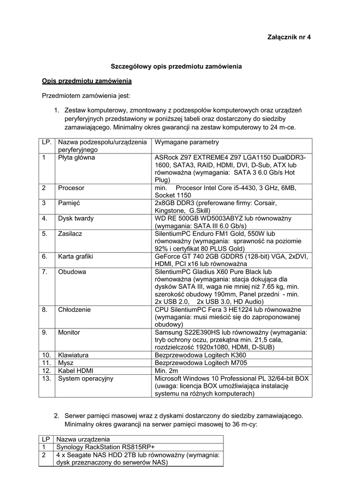 Załącznik nr 4 Szczegółowy opis przedmiotu zamówienia Opis przedmiotu zamówienia Przedmiotem zamówienia jest: 1. Zestaw komputerowy, zmontowany z podzespołów komputerowych oraz urządzeń peryferyjnych przedstawiony w poniższej tabeli oraz dostarczony do siedziby zamawiającego. Minimalny okres gwarancji na zestaw komputerowy to 24 m-ce. LP. Nazwa podzespołu/urządzenia peryferyjnego 1 Płyta główna 2 Procesor 3 Pamięć 4. Dysk twardy 5. Zasilacz 6. Karta grafiki 7. Obudowa 8. Chłodzenie 9. Monitor 10. 11. 12. 13. Klawiatura Mysz Kabel HDMI System operacyjny Wymagane parametry ASRock Z97 EXTREME4 Z97 LGA1150 DualDDR31600, SATA3, RAID, HDMI, DVI, D-Sub, ATX lub równoważna (wymagania: SATA 3 6.0 Gb/s Hot Plug) min. Procesor Intel Core i5-4430, 3 GHz, 6MB, Socket 1150 2x8GB DDR3 (preferowane firmy: Corsair, Kingstone, G.Skill) WD RE 500GB WD5003ABYZ lub równoważny (wymagania: SATA III 6.0 Gb/s) SilentiumPC Enduro FM1 Gold, 550W lub równoważny (wymagania: sprawność na poziomie 92% i certyfikat 80 PLUS Gold) GeForce GT 740 2GB GDDR5 (128-bit) VGA, 2xDVI, HDMI, PCI x16 lub równoważna SilentiumPC Gladius X60 Pure Black lub równoważna (wymagania: stacja dokująca dla dysków SATA III, waga nie mniej niż 7.65 kg, min. szerokość obudowy 190mm, Panel przedni - min. 2x USB 2.0, 2x USB 3.0, HD Audio) CPU SilentiumPC Fera 3 HE1224 lub równoważne (wymagania: musi mieścić się do zaproponowanej obudowy) Samsung S22E390HS lub równoważny (wymagania: tryb ochrony oczu, przekątna min. 21,5 cala, rozdzielczość 1920x1080, HDMI, D-SUB) Bezprzewodowa Logitech K360 Bezprzewodowa Logitech M705 Min. 2m Microsoft Windows 10 Professional PL 32/64-bit BOX (uwaga: licencja BOX umożliwiająca instalację systemu na różnych komputerach) 2. Serwer pamięci masowej wraz z dyskami dostarczony do siedziby zamawiającego. Minimalny okres gwarancji na serwer pamięci masowej to 36 m-cy: LP Nazwa urządzenia 1 Synology RackStation RS815RP+ 2 4 x Seagate NAS HDD 2TB lub równoważny (wymagnia: dysk przeznaczony do serwerów NAS)