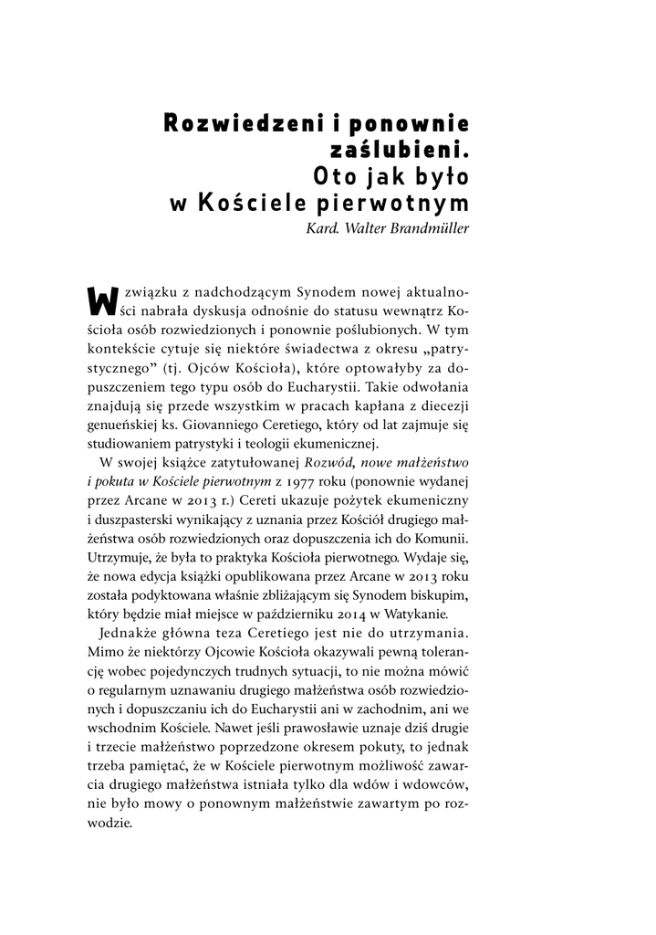 Rozwiedzeni i ponownie zaślubieni. Oto jak było w Kościele pierwotnym Kard. Walter Brandmüller W związku z nadchodzącym Synodem nowej aktualności nabrała dyskusja odnośnie do statusu wewnątrz Kościoła osób rozwiedzionych i ponownie poślubionych. W tym kontekście cytuje się niektóre świadectwa z okresu „patrystycznego” (tj. Ojców Kościoła), które optowałyby za dopuszczeniem tego typu osób do Eucharystii. Takie odwołania znajdują się przede wszystkim w pracach kapłana z diecezji genueńskiej ks. Giovanniego Ceretiego, który od lat zajmuje się studiowaniem patrystyki i teologii ekumenicznej. W swojej książce zatytułowanej Rozwód, nowe małżeństwo i pokuta w Kościele pierwotnym z 1977 roku (ponownie wydanej przez Arcane w 2013 r.) Cereti ukazuje pożytek ekumeniczny i duszpasterski wynikający z uznania przez Kościół drugiego małżeństwa osób rozwiedzionych oraz dopuszczenia ich do Komunii. Utrzymuje, że była to praktyka Kościoła pierwotnego. Wydaje się, że nowa edycja książki opublikowana przez Arcane w 2013 roku została podyktowana właśnie zbliżającym się Synodem biskupim, który będzie miał miejsce w październiku 2014 w Watykanie. Jednakże główna teza Ceretiego jest nie do utrzymania. Mimo że niektórzy Ojcowie Kościoła okazywali pewną tolerancję wobec pojedynczych trudnych sytuacji, to nie można mówić o regularnym uznawaniu drugiego małżeństwa osób rozwiedzionych i dopuszczaniu ich do Eucharystii ani w zachodnim, ani we wschodnim Kościele. Nawet jeśli prawosławie uznaje dziś drugie i trzecie małżeństwo poprzedzone okresem pokuty, to jednak trzeba pamiętać, że w Kościele pierwotnym możliwość zawarcia drugiego małżeństwa istniała tylko dla wdów i wdowców, nie było mowy o ponownym małżeństwie zawartym po rozwodzie. 2 christianitas.org Cereti sugeruje, żeby uwolnić się od patrzenia na Kościół pierwszych chrześcijan przez pryzmat dzisiejszej surowej praktyki, która nie zezwala na udział w Komunii ponownie poślubionym po rozwodzie. W Kościele pierwotnym często mówiło się o drugim i trzecim małżeństwie, a jego zdaniem oznaczało to powtórne małżeństwa osób rozwiedzionych. Z całą pewnością nie należy przerzucać na starożytność dzisiejszej wizji spraw: jednak musimy także uważać, żeby nie przenosić na Kościół pierwotny pewnego rodzaju lekceważenia, z jakim dzisiejsze społeczeństwo akceptuje rozwód i ponowne małżeństwo. Już starożytność przedchrześcijańska traktowała rozwód i powtórne małżeństwo w sposób bardzo restrykcyjny. W żadnym razie nie można mówić w epoce Ojców Kościoła o powszechnej praktyce rozwodów i nowego ślubu. Drugie równoczesne małżeństwo, to znaczy zawarte w czasie, kiedy pierwsze wciąż istnieje, traktowano jako trwanie w cudzołóstwie, tym samym nigdy nie było ono uznawane za wybór chrześcijański. Nie mamy żadnej wiedzy o inicjatywach Ojców Kościoła dążących do duszpasterskiego uregulowania tego drugiego małżeństwa. Dopuszczalna była tylko ewentualna separacja. Natomiast kiedy w tekstach kościelnych pisze się o drugim, trzecim czy czwartym małżeństwie, należy przez to rozumieć małżeństwa osób owdowiałych. Pisało się o nich, bo były dopuszczone, jednakże niechętnie widziane. W miejscach, gdzie Ojcowie Kościoła lub Synody mówią o dopuszczalnym lub wręcz nakazanym rozwodzie, Cereti dedukuje możliwość ponownego małżeństwa w sytuacji, kiedy pierwszy małżonek wciąż żyje, jednak nigdzie nie ma na to dowodu. Rozwód i ponowny ślub to dwie zupełnie oddzielne sprawy. Separacja i cudzołóstwo były obwarowane konsekwencjami [w prawie kościelnym] i w ogóle nie można było mówić o drugim małżeństwie zawartym w trakcie życia pierwszego małżonka. Cereti utrzymuje, że Synody w IV wieku, które włączały do Kościoła digamoi (to jest tych, którzy zawarli drugie małżeństwo) po okresie pokuty, miały na myśli zarówno ponowne małżeństwa równoczesne (drugie małżeństwo, kiedy małżonek z pierwszego pozostawał przy życiu), jak i następne (to jest drugie małżeństwo po śmierci małżonka). W ten sposób osoby rozwiedzione, które ponownie zawarły małżeństwo, Kard. Walter Brandmüller Rozwiedzeni i ponownie zaślubieni… mogłyby być dopuszczone do Eucharystii. Nawet Sobór nicejski (kan. 8) miał to uznawać za oczywistość. W rzeczywistości u żadnego Ojca Kościoła nie znajdujemy odniesienia do słowa digamoi, które oznaczałoby zarazem powtórne małżeństwo po rozwodzie, jak i ponowne małżeństwo po owdowieniu. Jest jeszcze większa racja, a mianowicie taka, że żaden tekst synodalny, który z natury rzeczy dążył do jednoznaczności sformułowań prawnych, nie mógłby nigdy nazwać jednym określeniem digamoi zarówno drugiego małżeństwa równoczesnego, jak i następującego po owdowieniu. W ten sposób traktowano by na równi drugie małżeństwo po rozwodzie, które jest zawsze cudzołóstwem, jak i małżeństwo następujące po owdowieniu, przez większość Ojców widziane jako niepożądane, ale jednak niepowodujące grzechu. Na korzyść takiej interpretacji terminu digamoi przez Synody przemawia kanon 19 Synodu w Ancyrze (314), który dla osób łamiących ślub dziewictwa przewidywał poddanie się dyscyplinie (pokutnej) digamoi. W końcu Synod w Laodycei, w drugiej połowie IV wieku, zarządził, że na digamoi, którzy drugie małżeństwo zawarli w sposób wolny i formalny, a nie sekretnie, nałożony zostanie tylko krótki okres pokuty. Ale także tutaj mówi się o digamoi jako drugim małżeństwie wdowców. Jak wynika z powyższego syntetycznego przedstawienia (udokumentowanego w sposób szerszy w: cfr. W. Brandmüller, Den Vätern ging es um die Witwen, „Die Tagespost”, 27 lutego 2014, s. 7; H. Crouzel, SJ, L’Église primitive face au divorce: du premier au cinquième siècle, Paris 1971; G. Pell